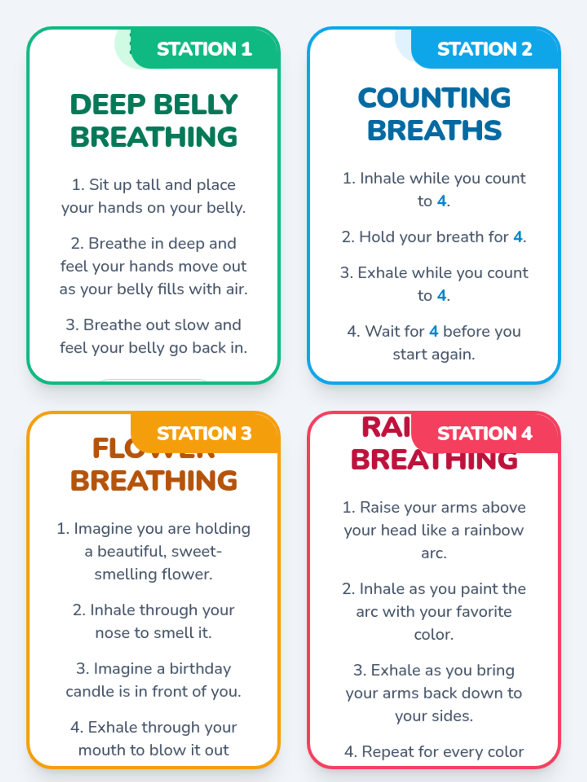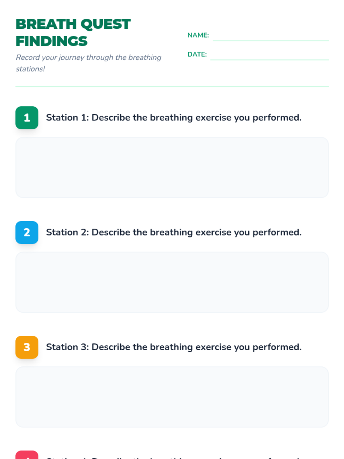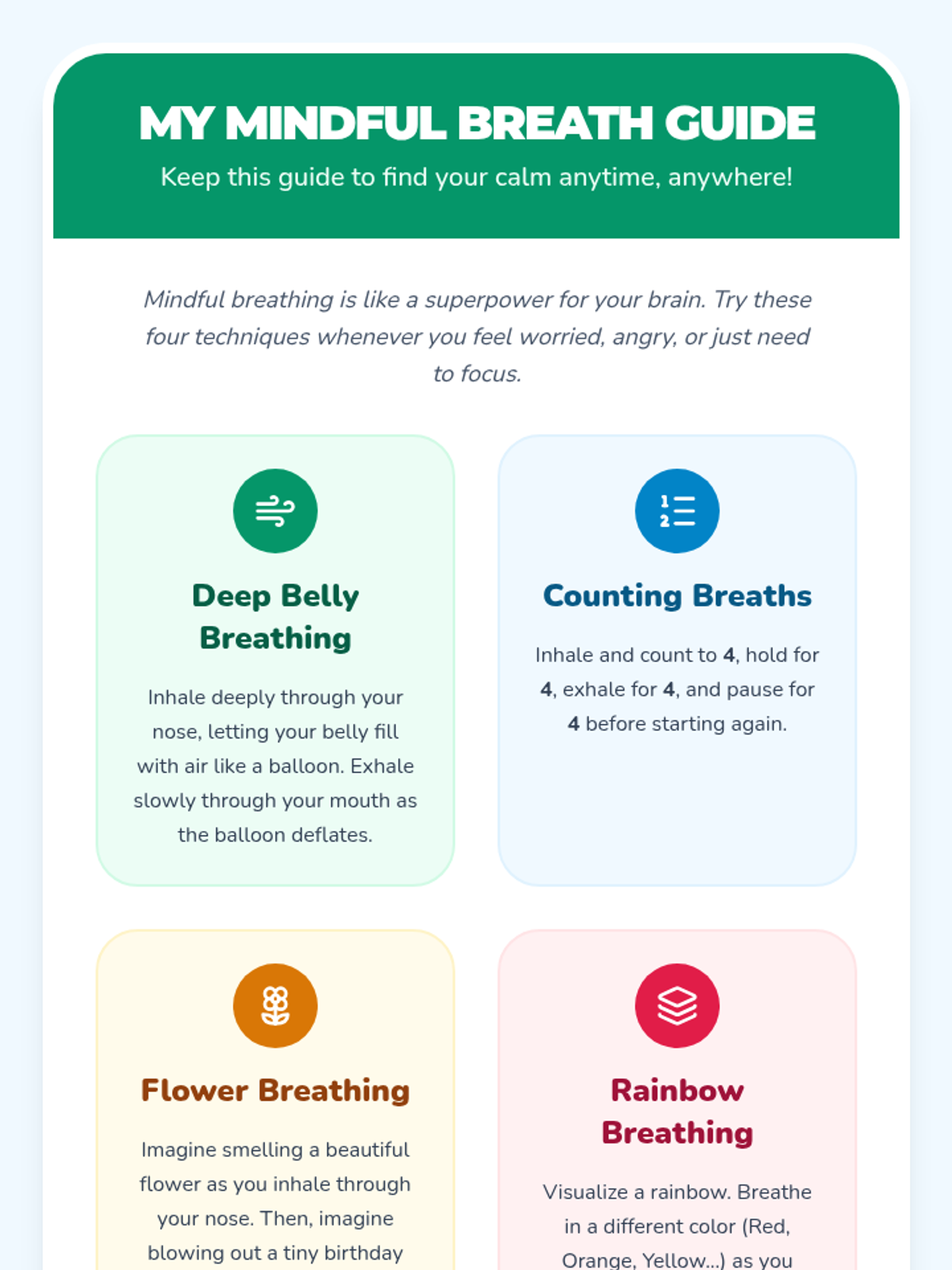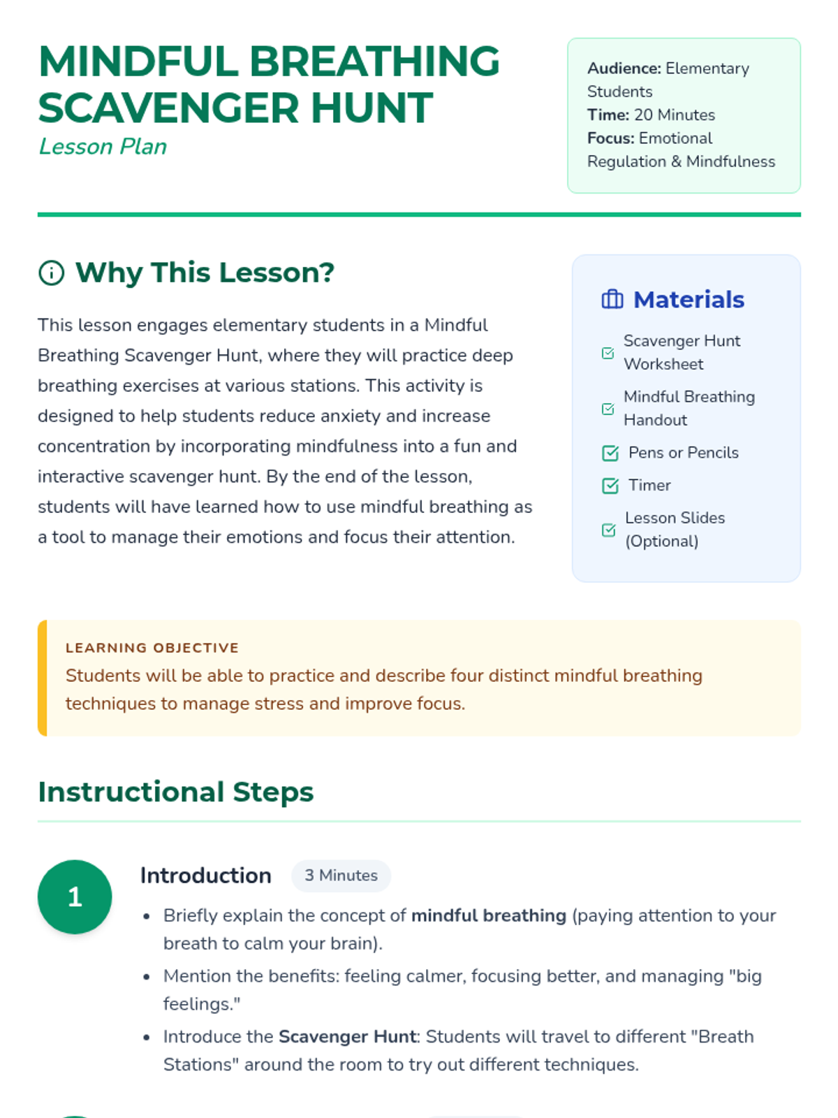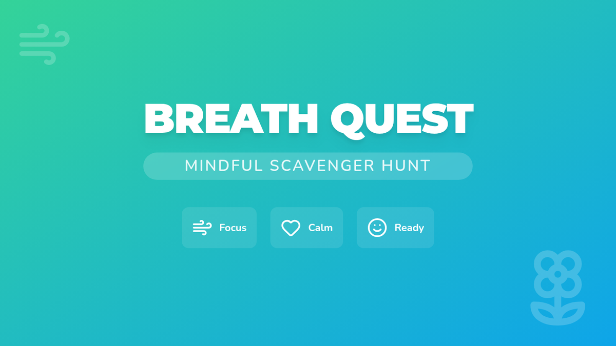 Elementary students engage in an interactive scavenger hunt to learn and practice four distinct mindful breathing techniques, helping them build emotional regulation and focus skills.