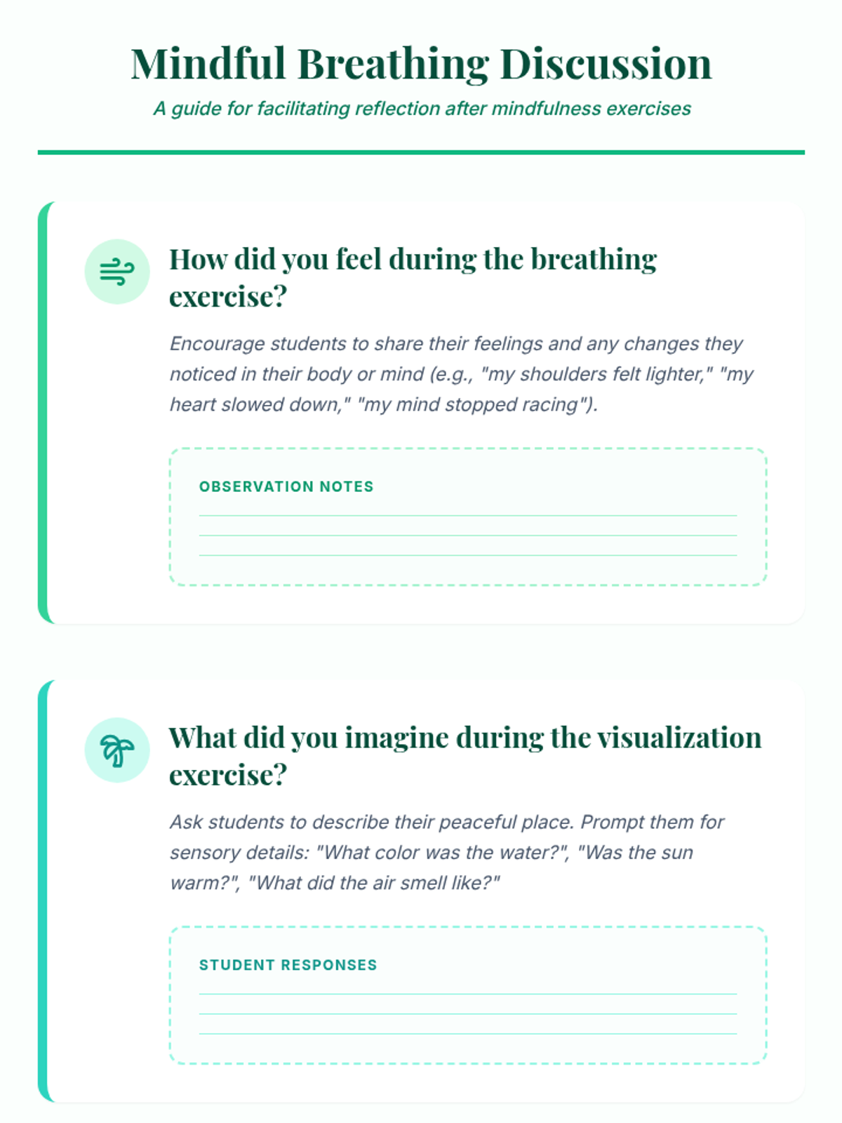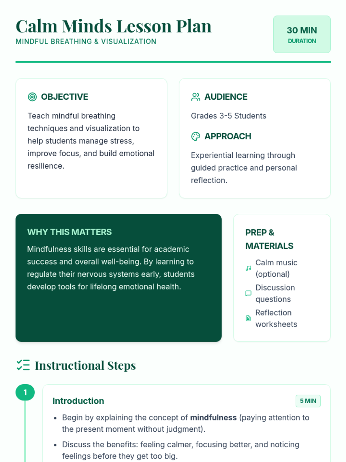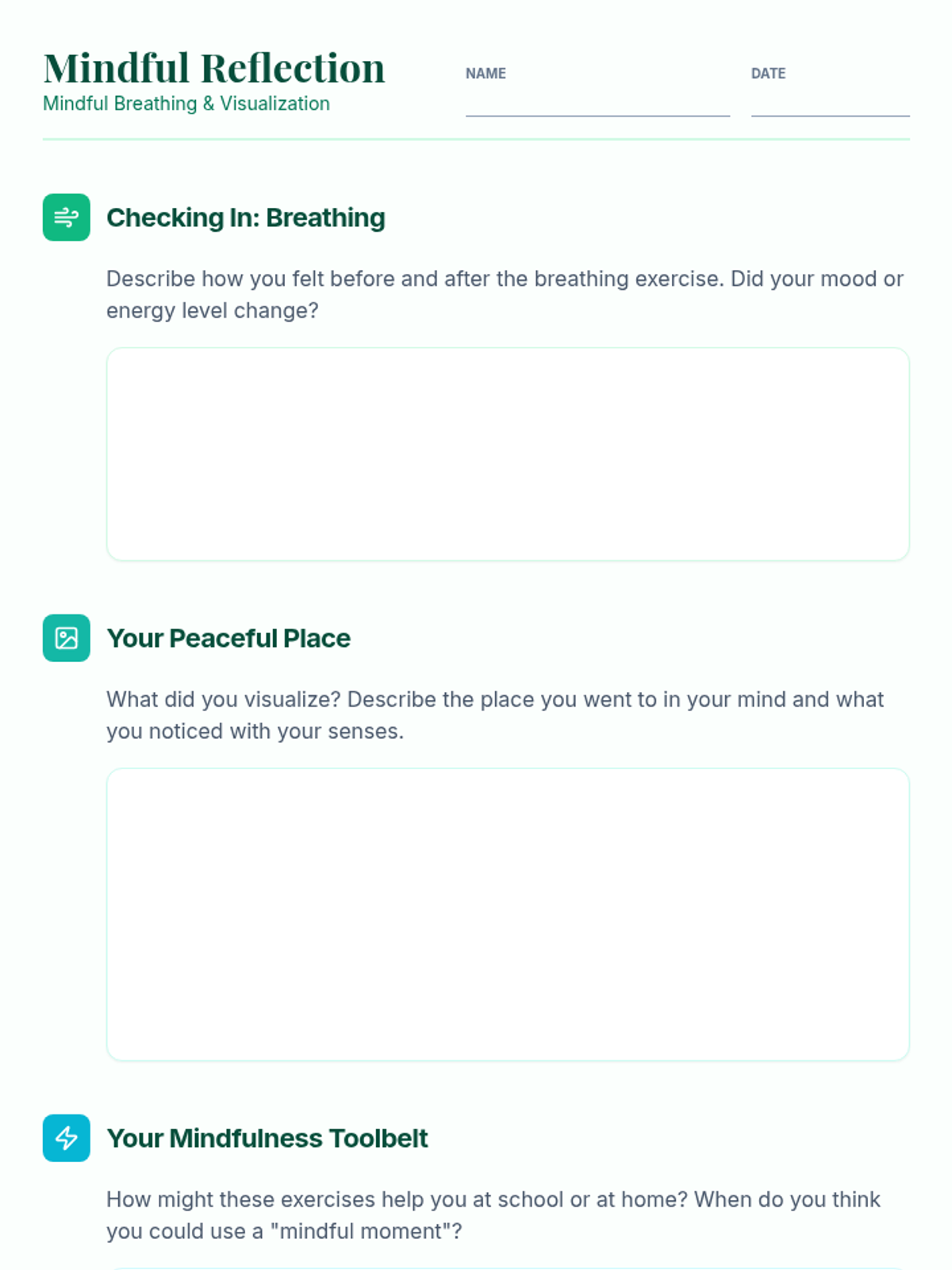 This lesson introduces students to mindful breathing and visualization exercises to promote relaxation and focus. Students will learn techniques to manage stress and build emotional resilience through guided practice and personal reflection.