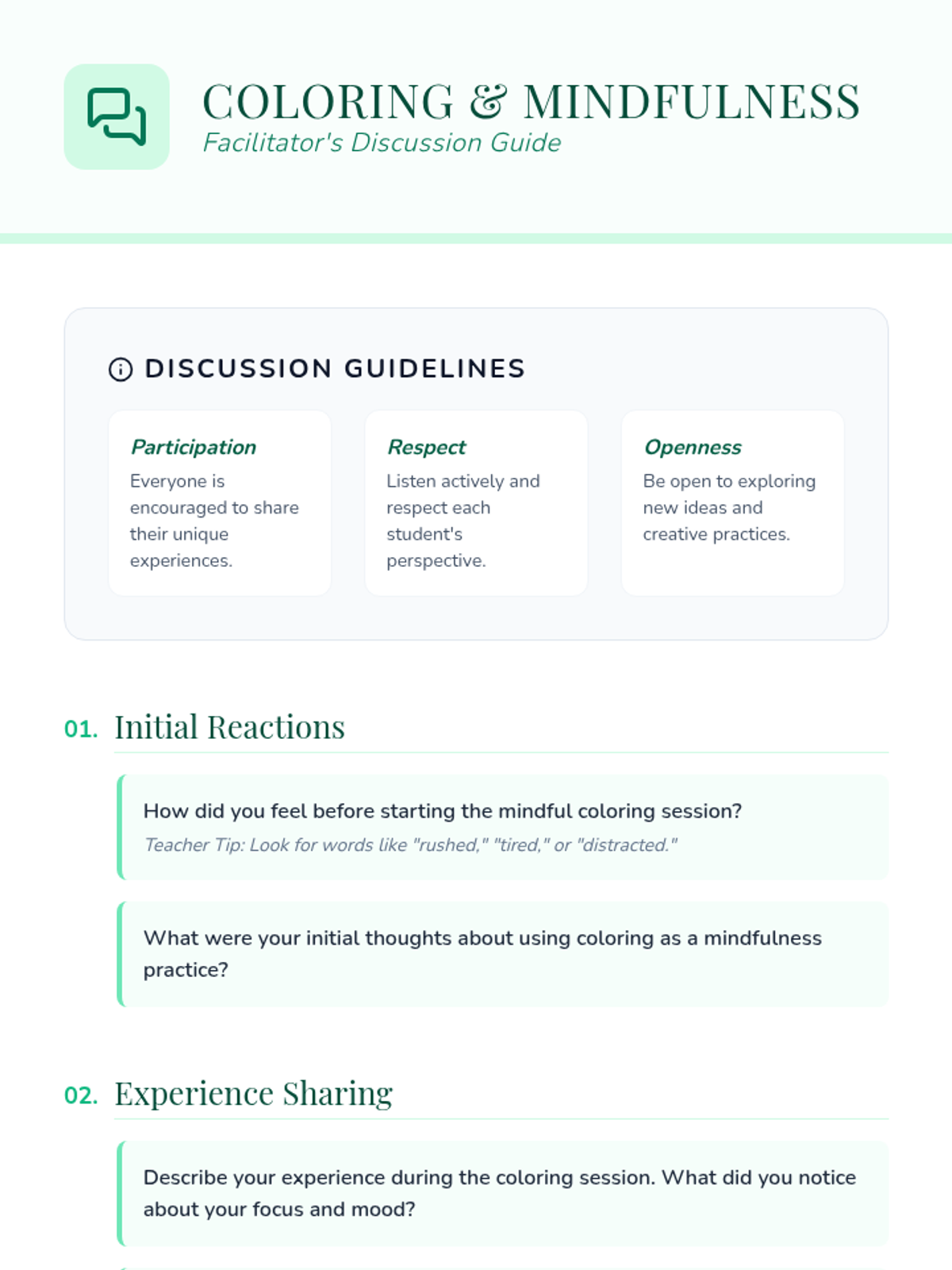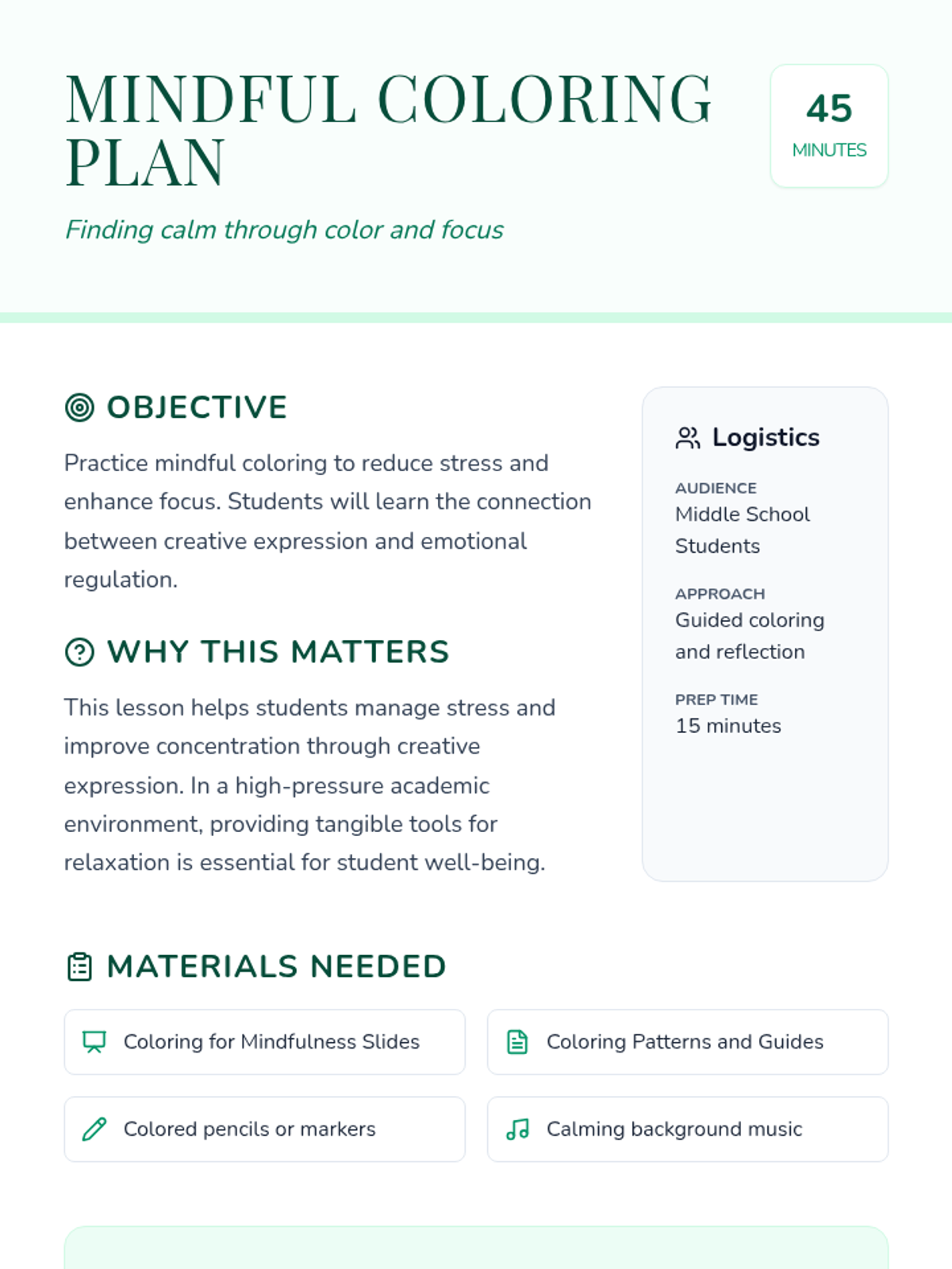 A lesson that introduces students to mindfulness through the practice of coloring, helping them manage stress and improve focus.