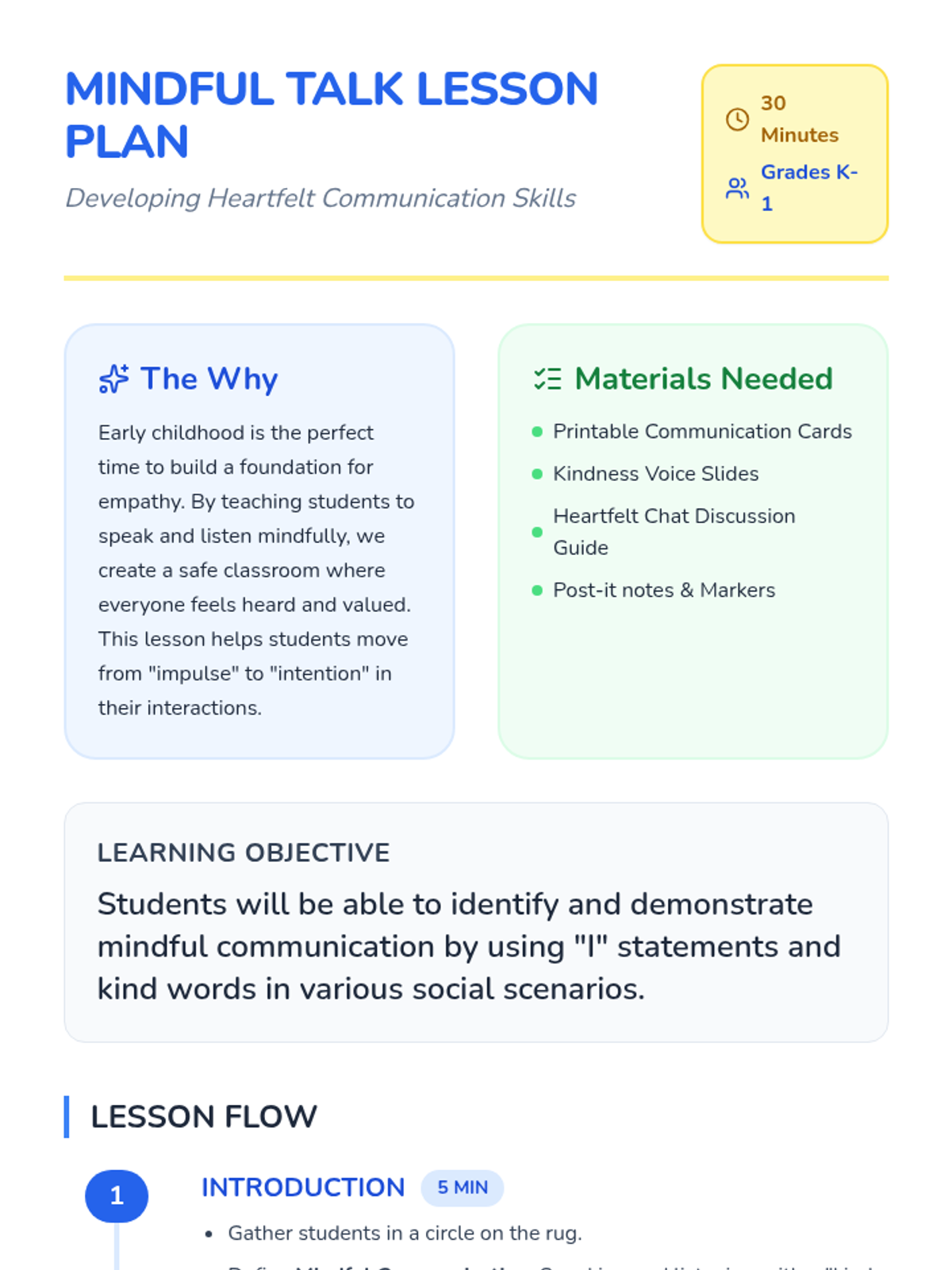 This lesson introduces young students to the concept of mindful communication, emphasizing the importance of sharing thoughts in respectful and appropriate ways. Through engaging activities and discussions, students will learn to express themselves clearly and listen to others, fostering a positive classroom environment. This lesson is crucial for developing social skills and empathy at an early age, helping students become responsible and productive citizens.