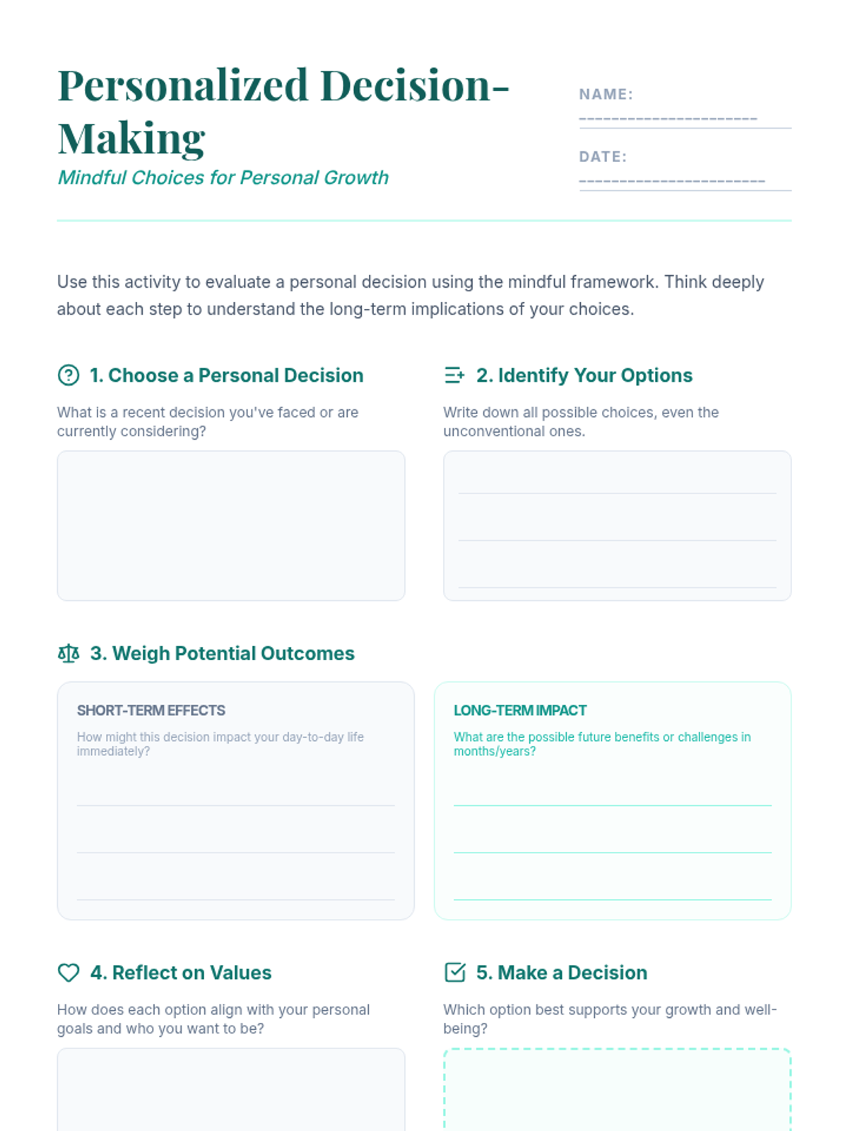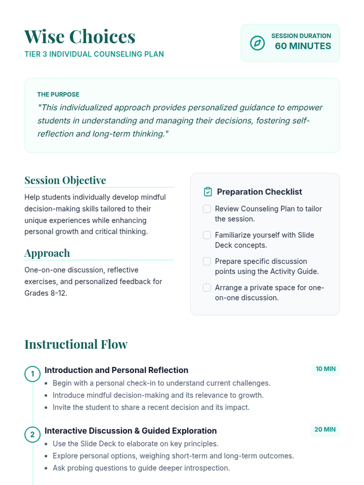 An individual Tier 3 counseling session designed to help students in grades 8-12 master mindful decision-making by evaluating personal scenarios and long-term impacts.