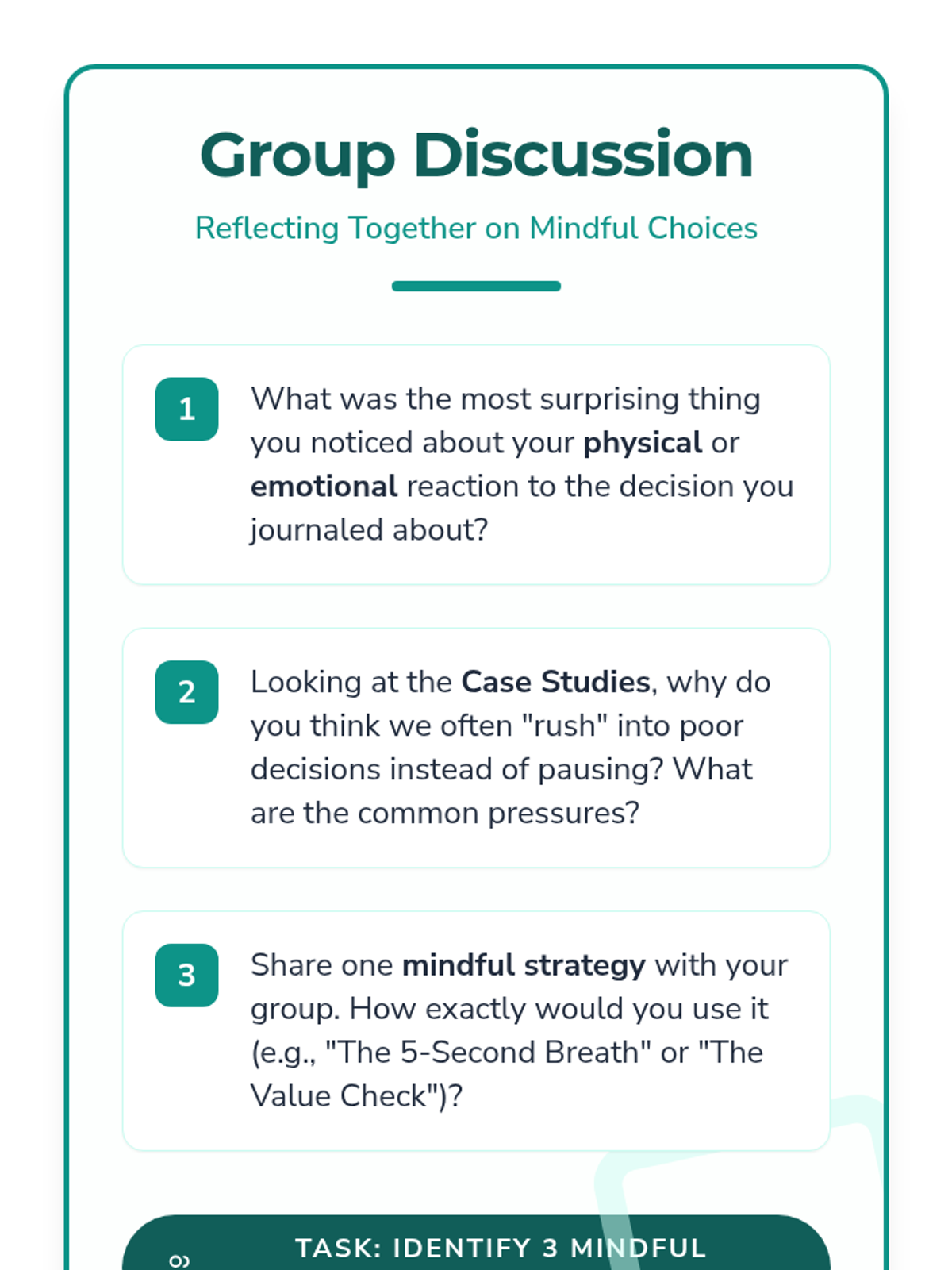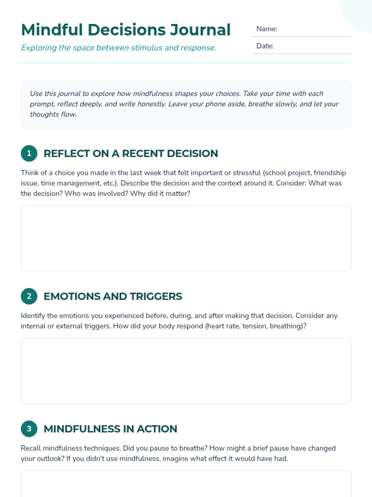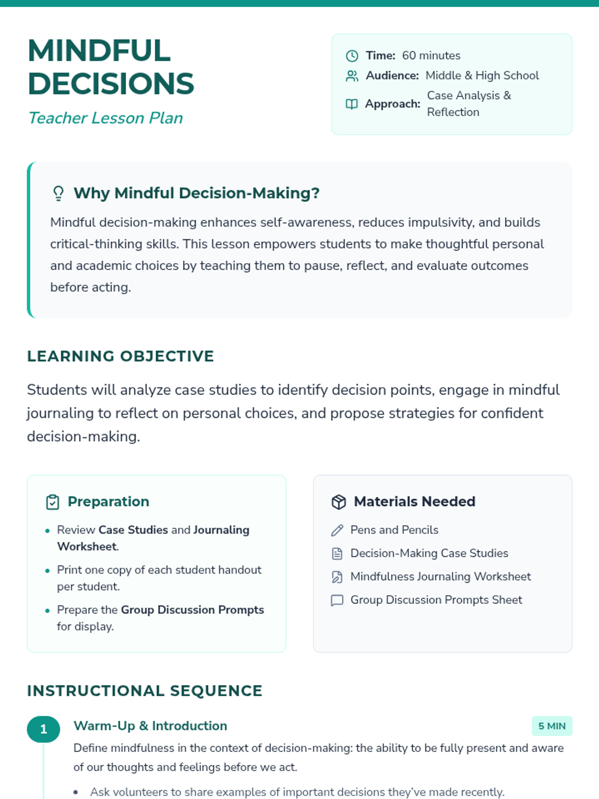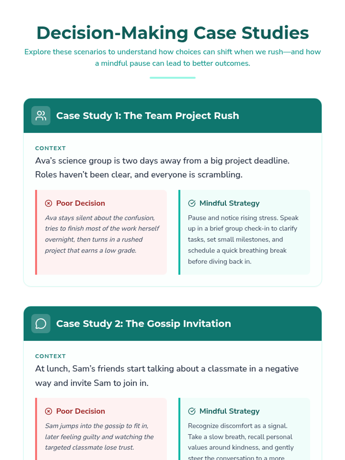 A single-session lesson for middle and high school students to explore mindfulness in decision-making through case studies, journaling, and group discussion.