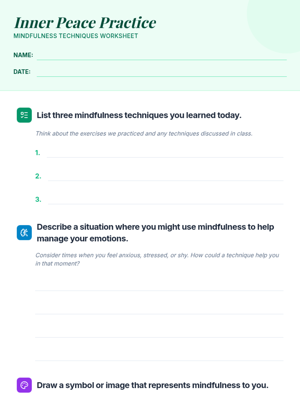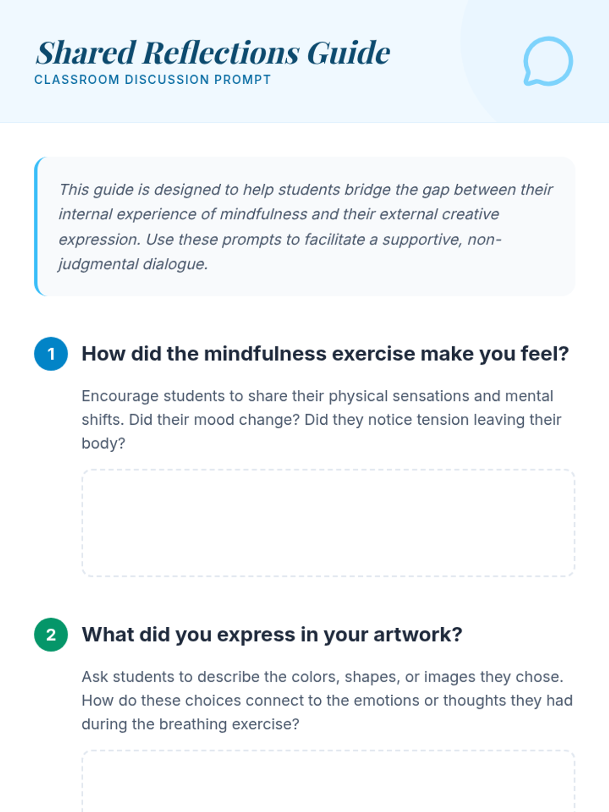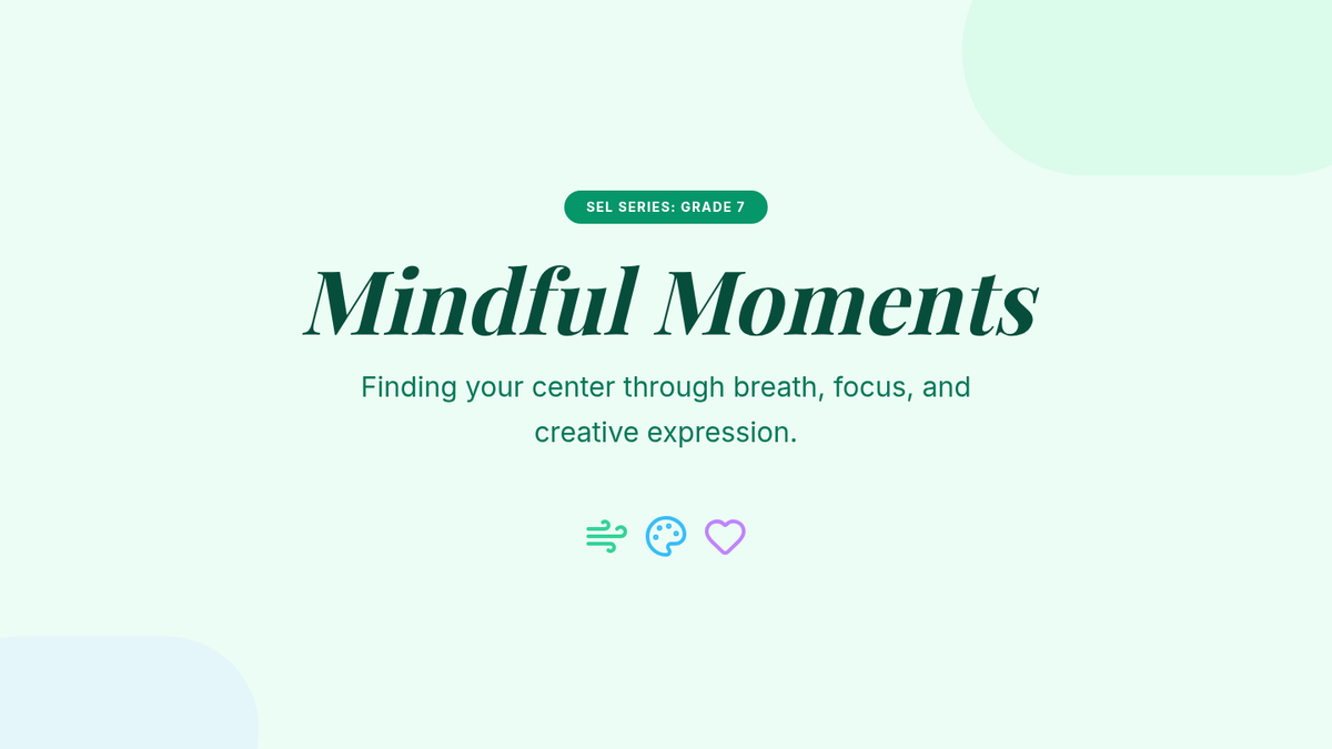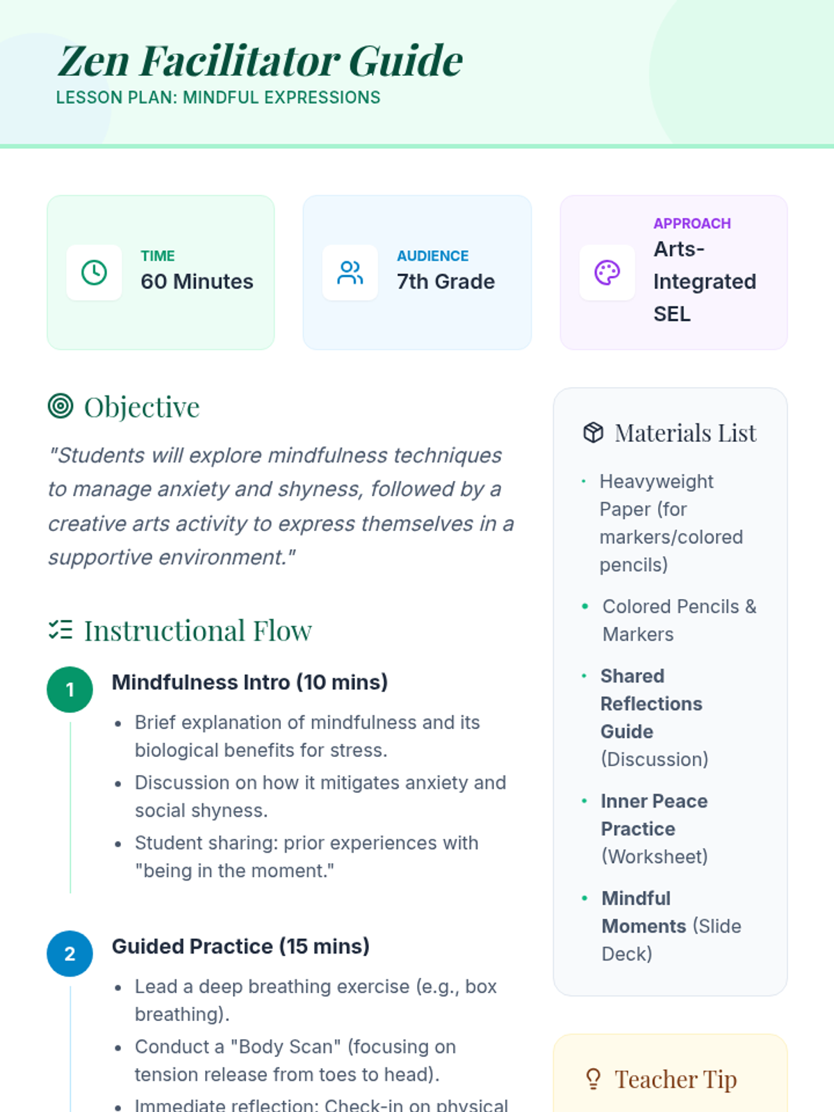 A 7th-grade SEL lesson focused on mindfulness techniques and creative self-expression to manage anxiety and shyness. Students practice deep breathing, body scans, and artistic reflection.