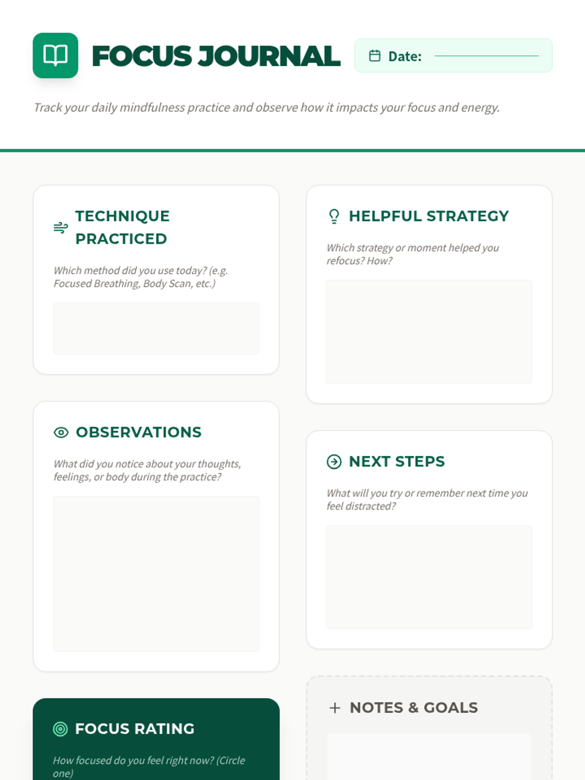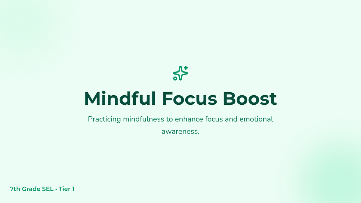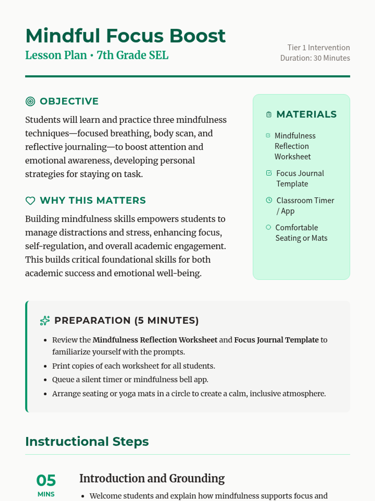 A 30-minute Tier 1 SEL lesson for 7th graders focused on building self-regulation skills through breathing exercises, body scans, and reflective journaling.