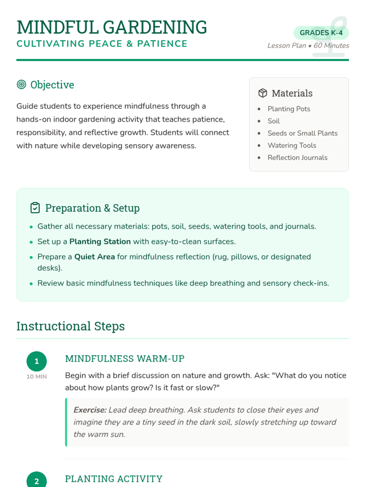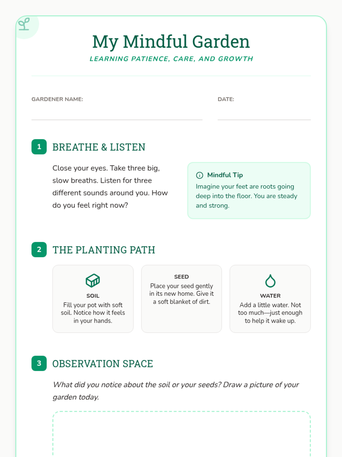 A hands-on mindfulness lesson for Grades K-4 that uses indoor gardening to teach patience, responsibility, and focus through sensory observation and reflection.