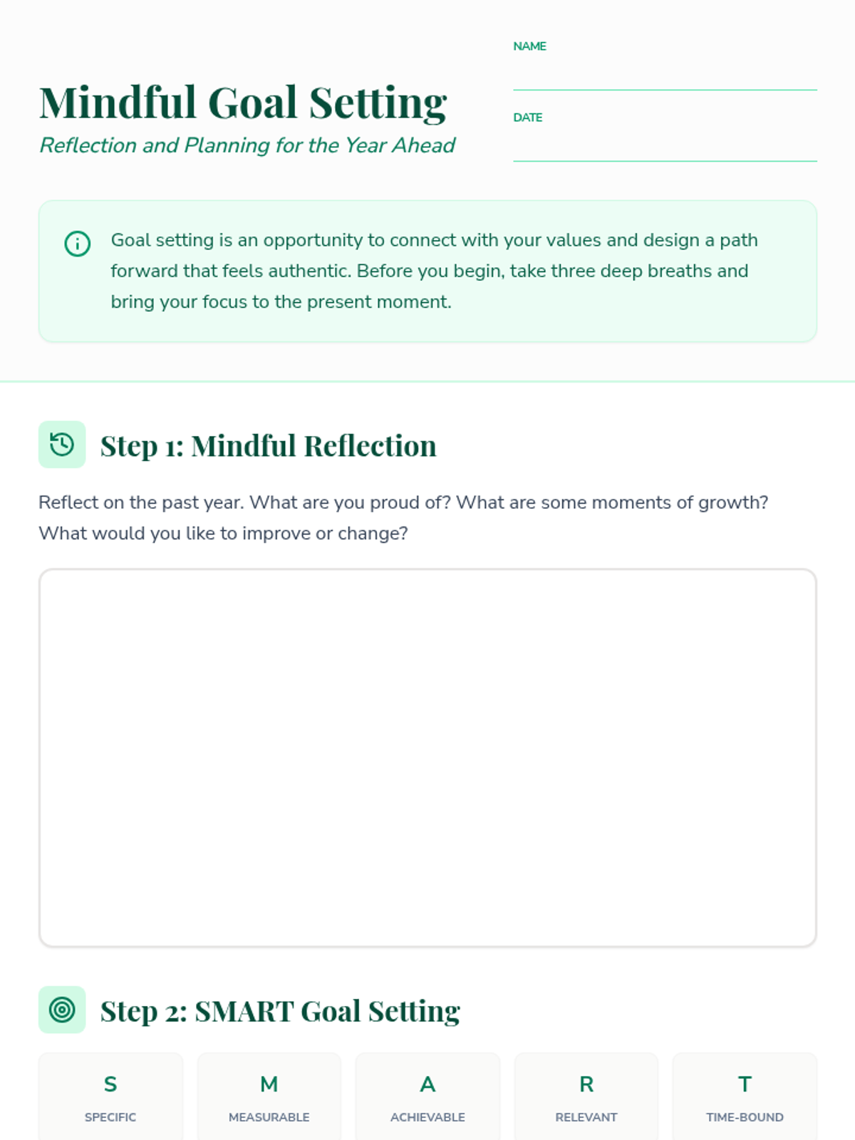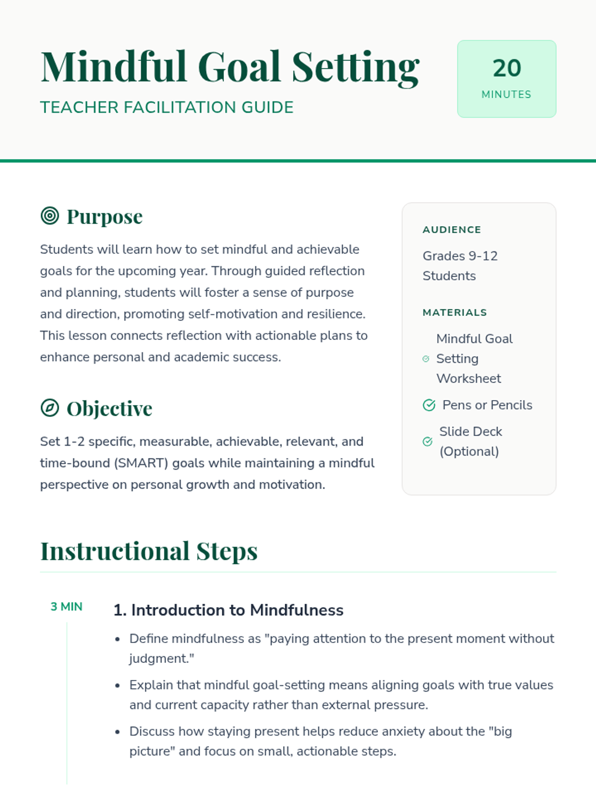 A mindful goal-setting workshop for high school students to reflect on their past year and set SMART goals for the future using mindfulness techniques.