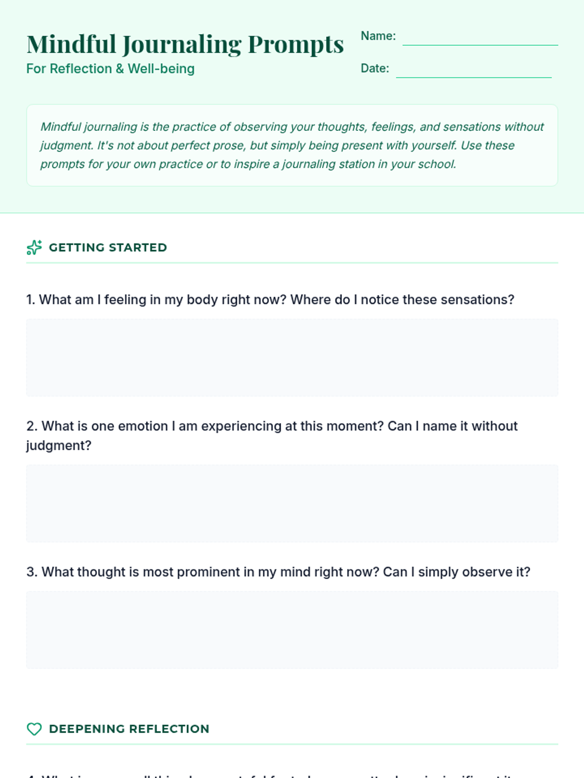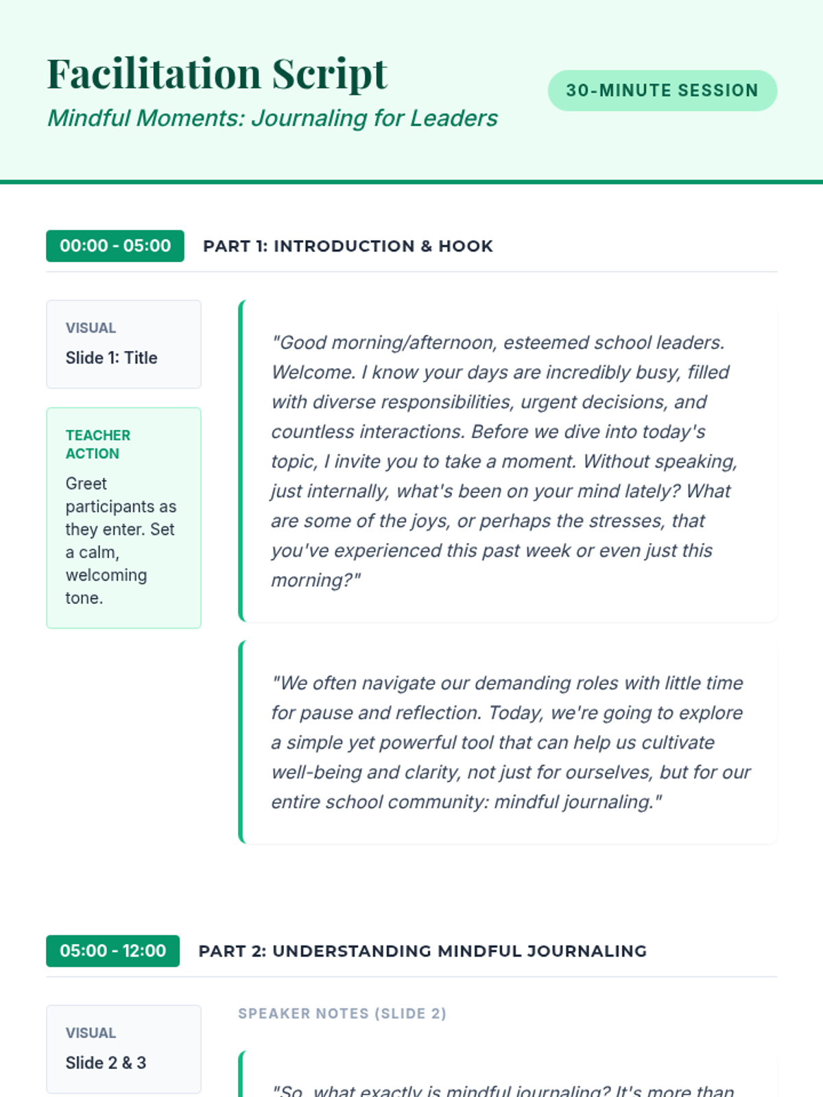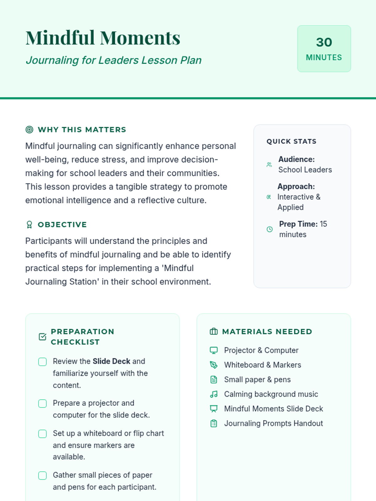 A 30-minute professional development session for school leaders on the benefits and implementation of mindful journaling to promote well-being and a reflective school culture.