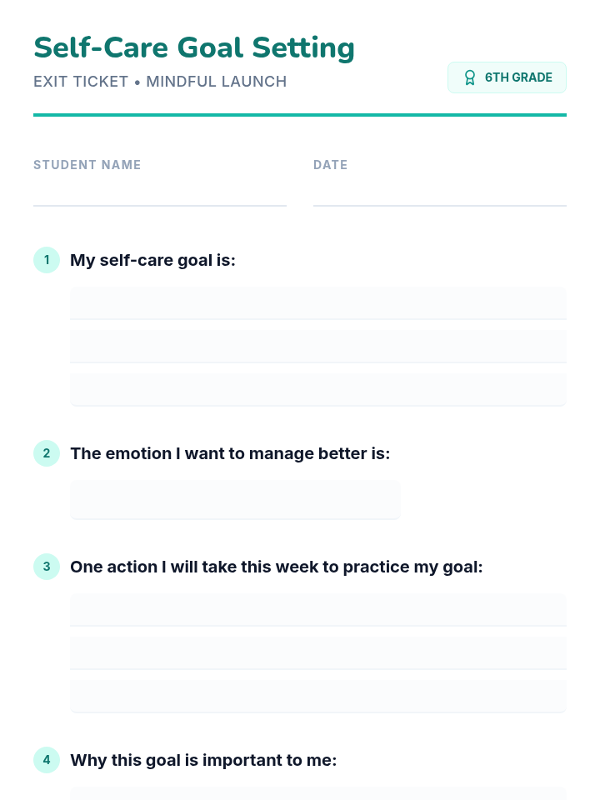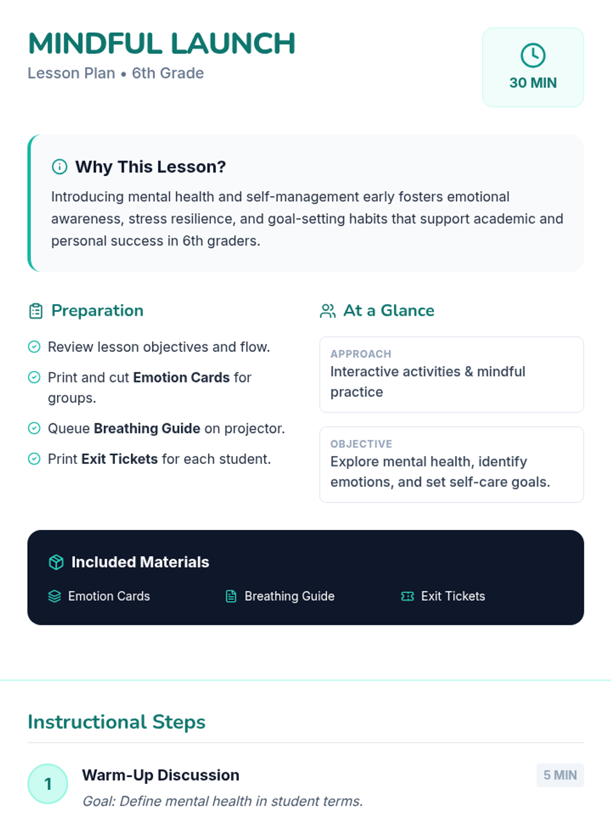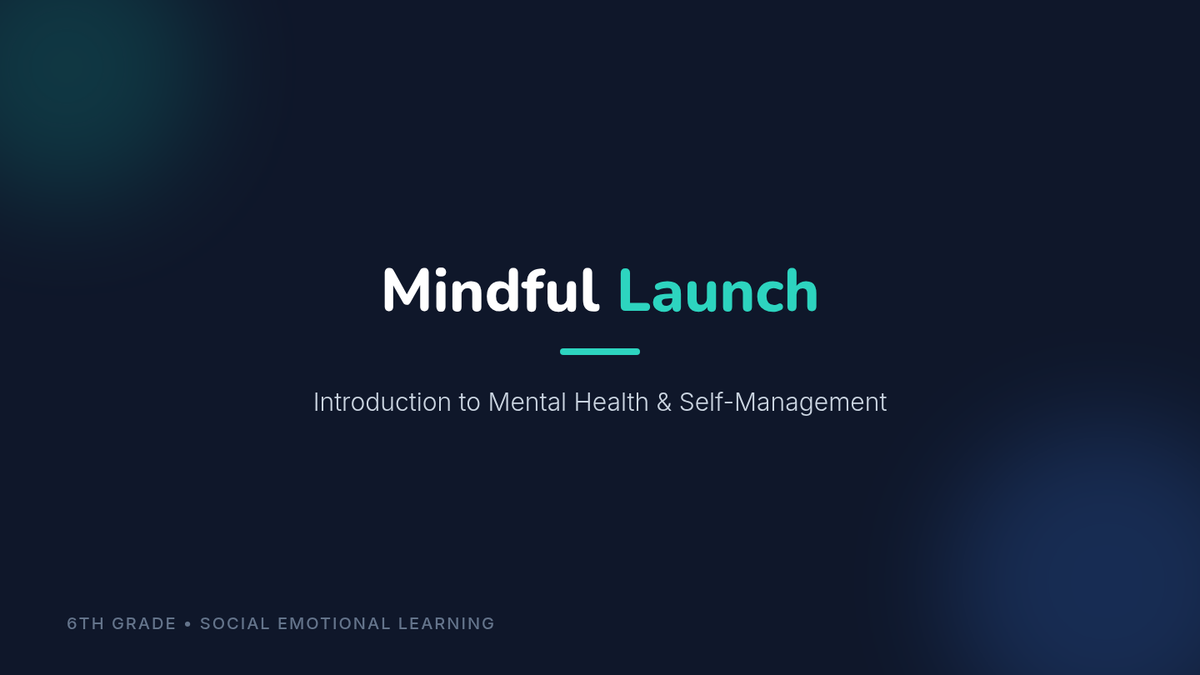 A 30-minute introductory session for 6th graders to explore mental health, identify emotions, practice mindful breathing, and set personal self-care goals.