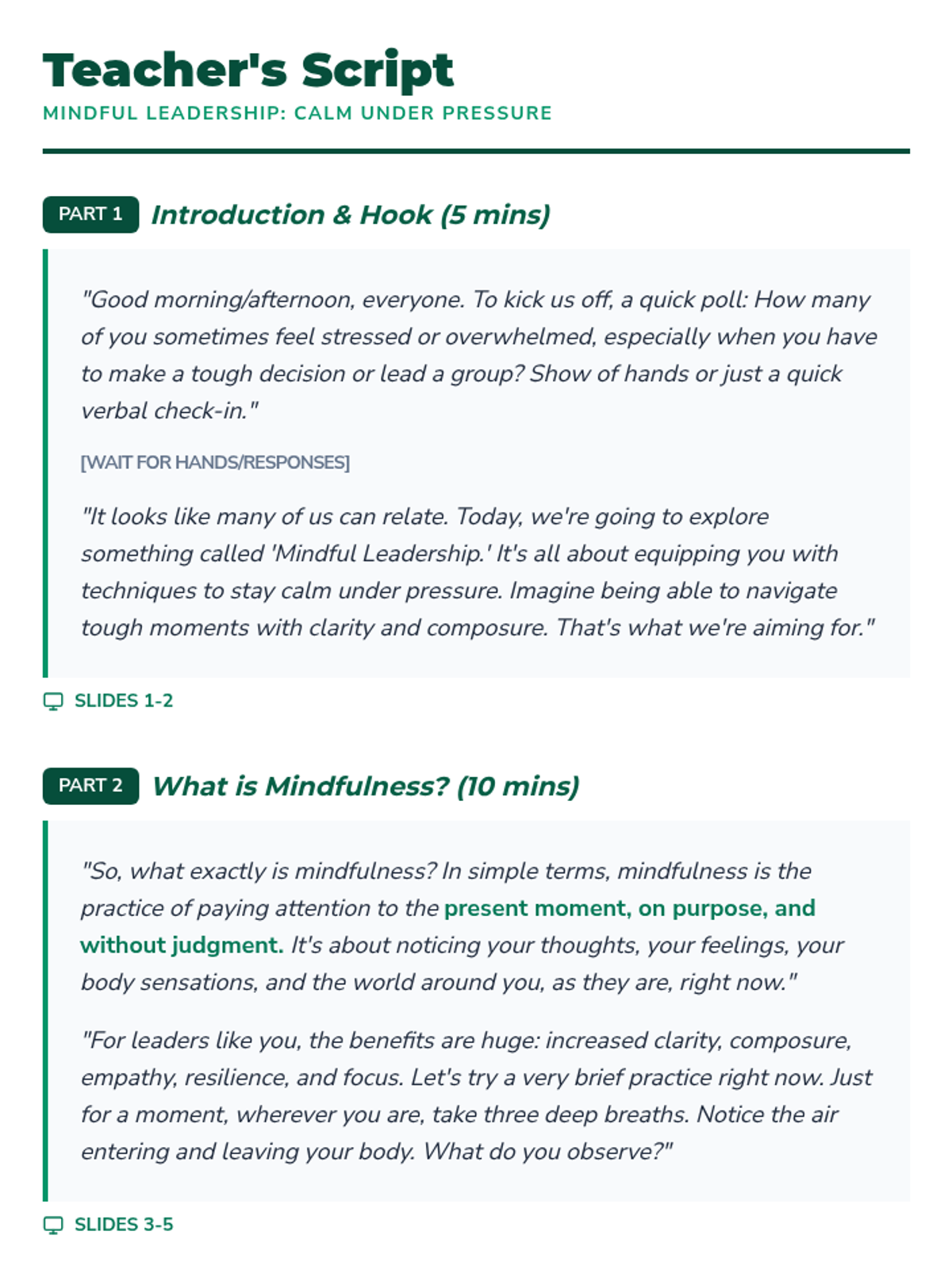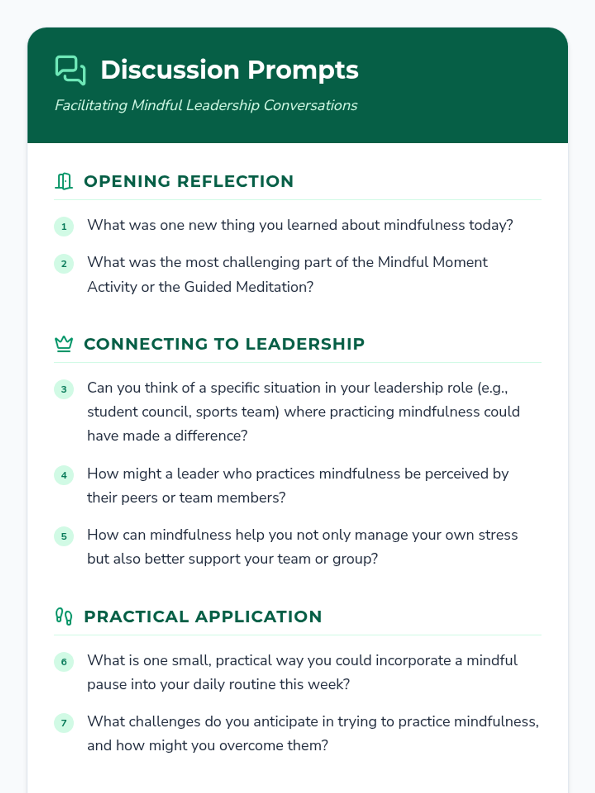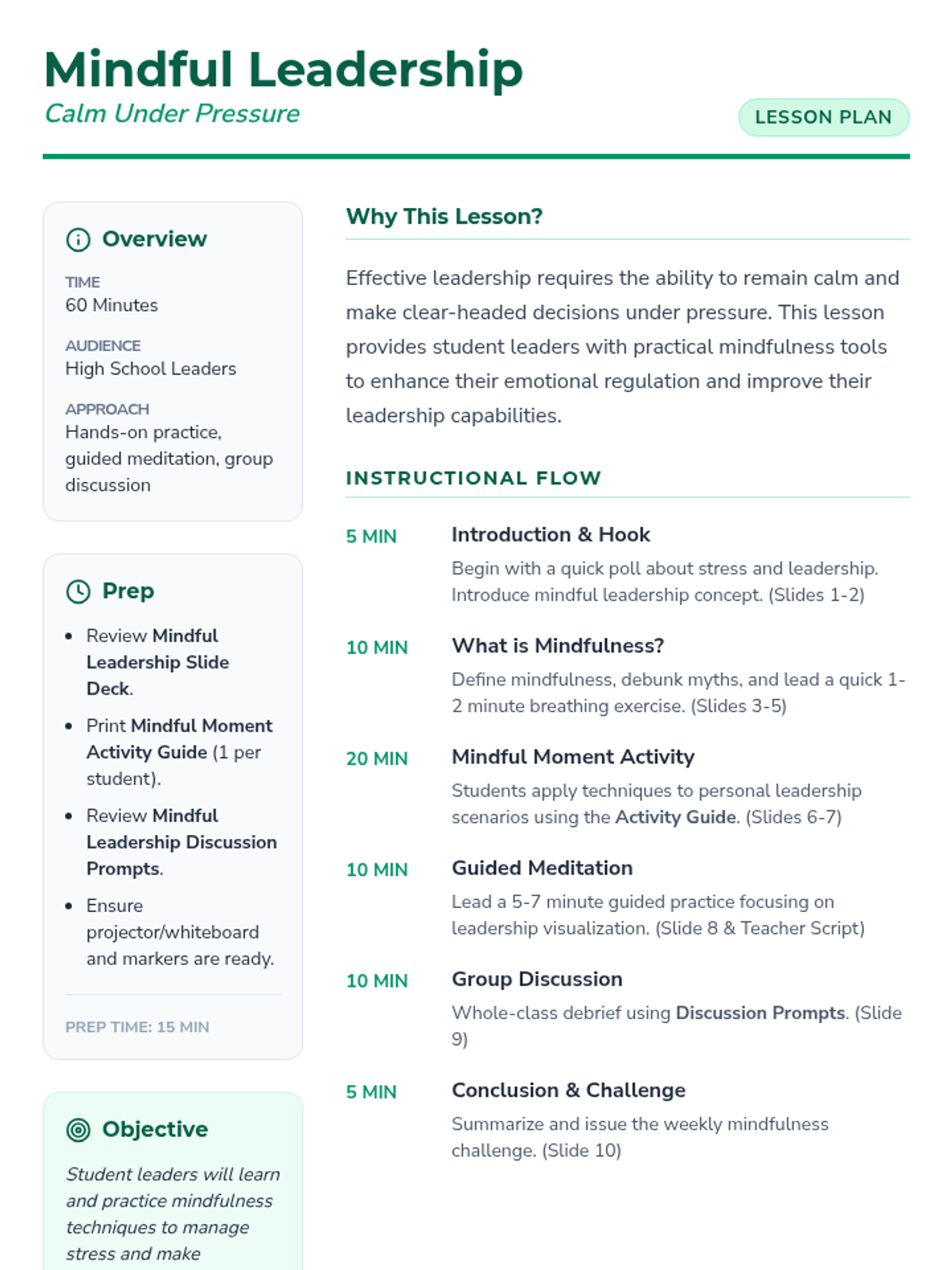 This module equips student leaders with mindfulness techniques to manage stress and make thoughtful decisions during challenging situations. It will help students enhance emotional regulation and leadership effectiveness. Designed for high school student leaders, this lesson can be completed in one 60-minute session.