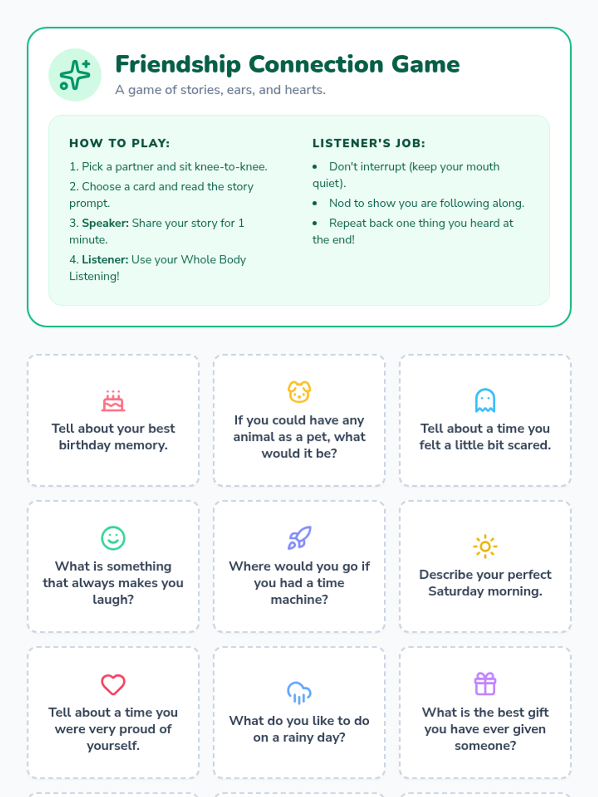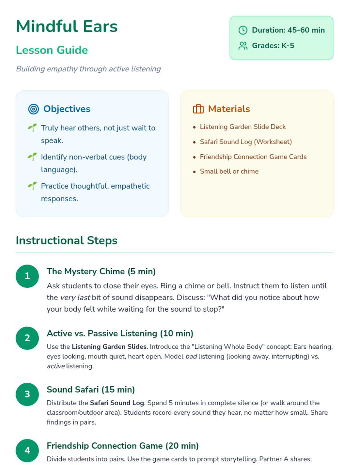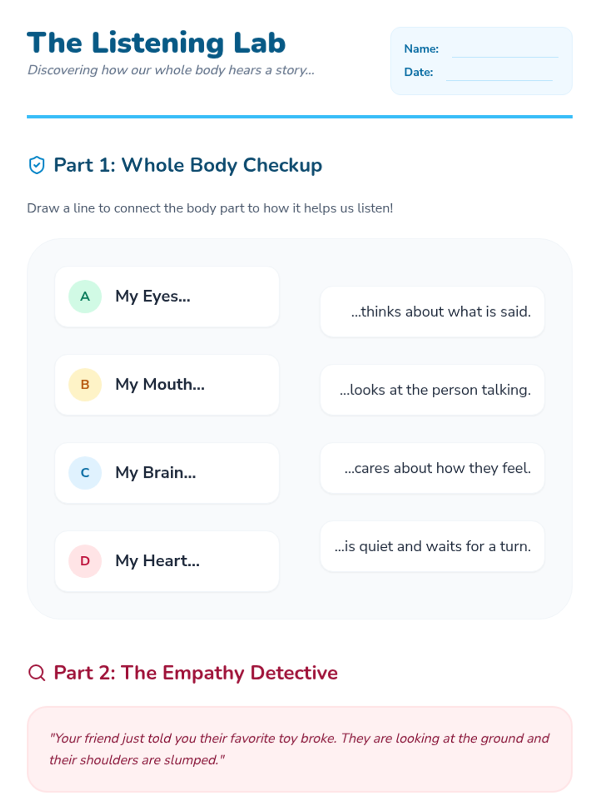 Students explore active listening through interactive storytelling, sound exploration, and paired sharing to build empathy and communication skills.