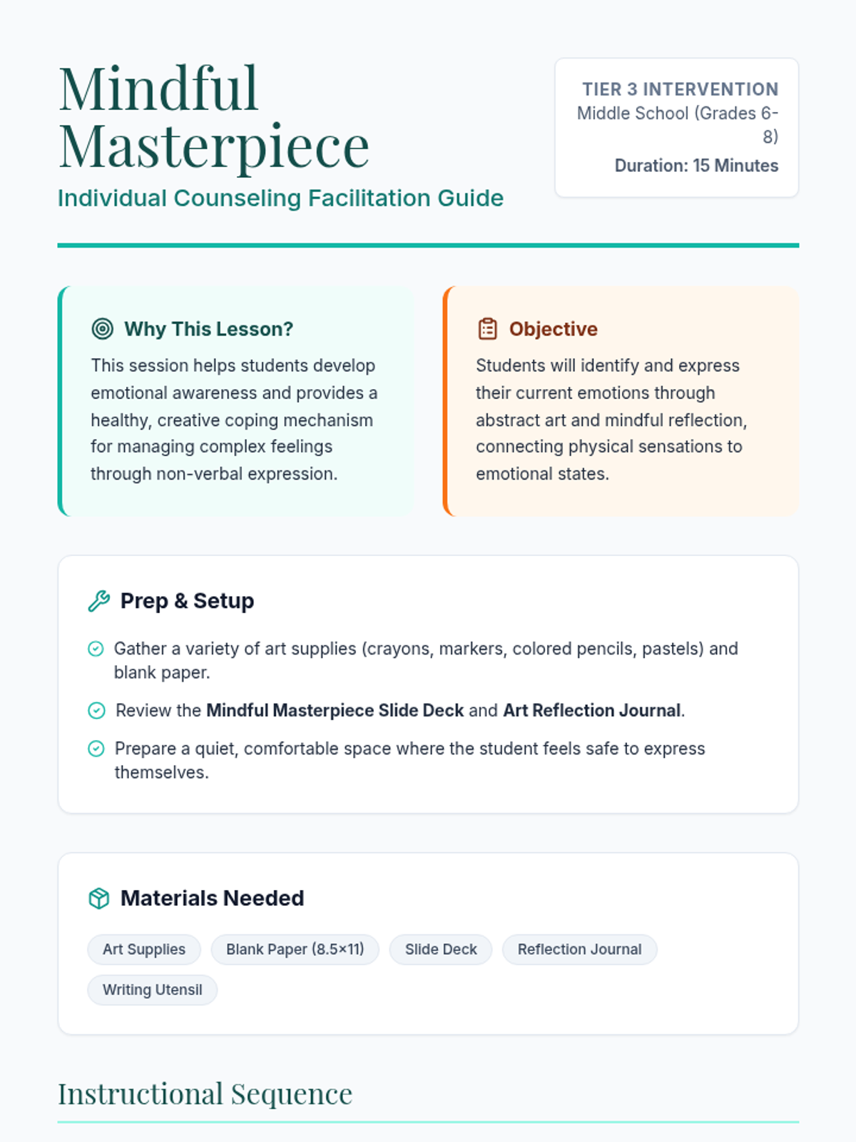 A 15-minute individual counseling session for middle school students that uses abstract art and mindfulness to explore and express emotions.