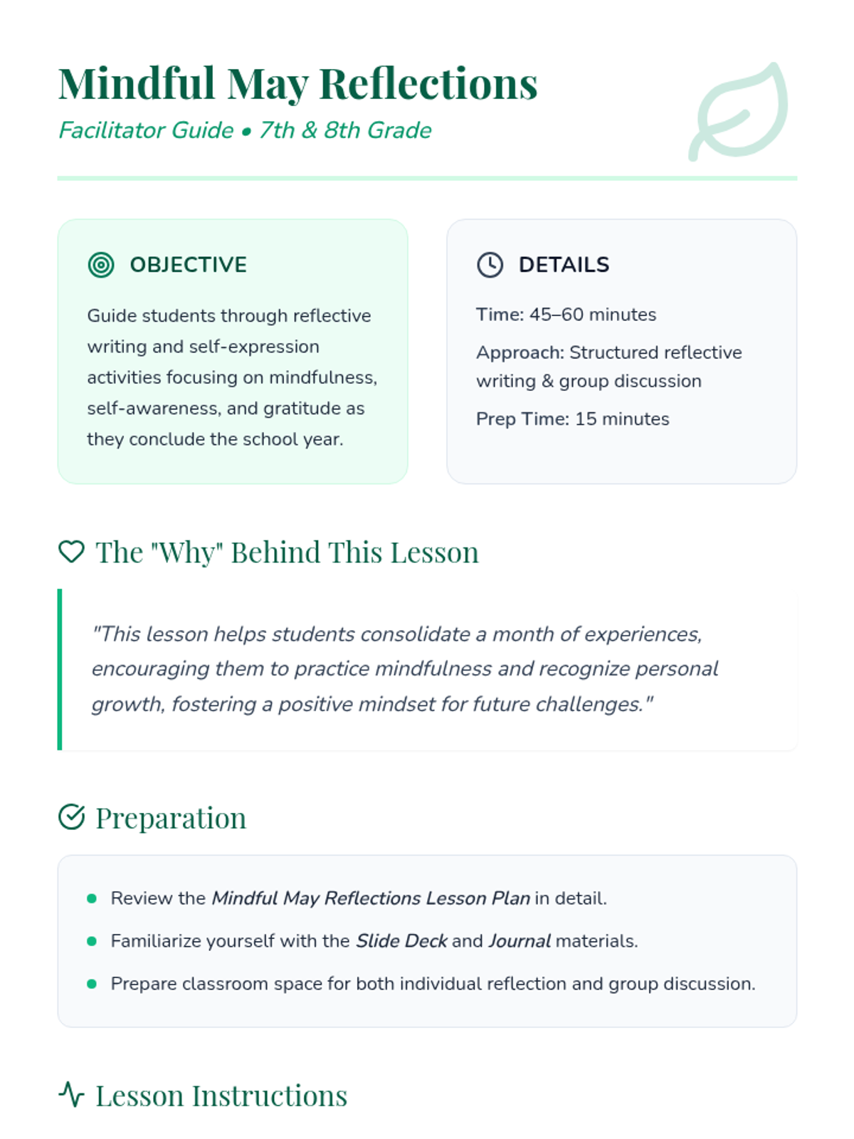 A reflective end-of-year lesson for middle schoolers focusing on mindfulness, gratitude, and personal growth through guided writing and discussion.