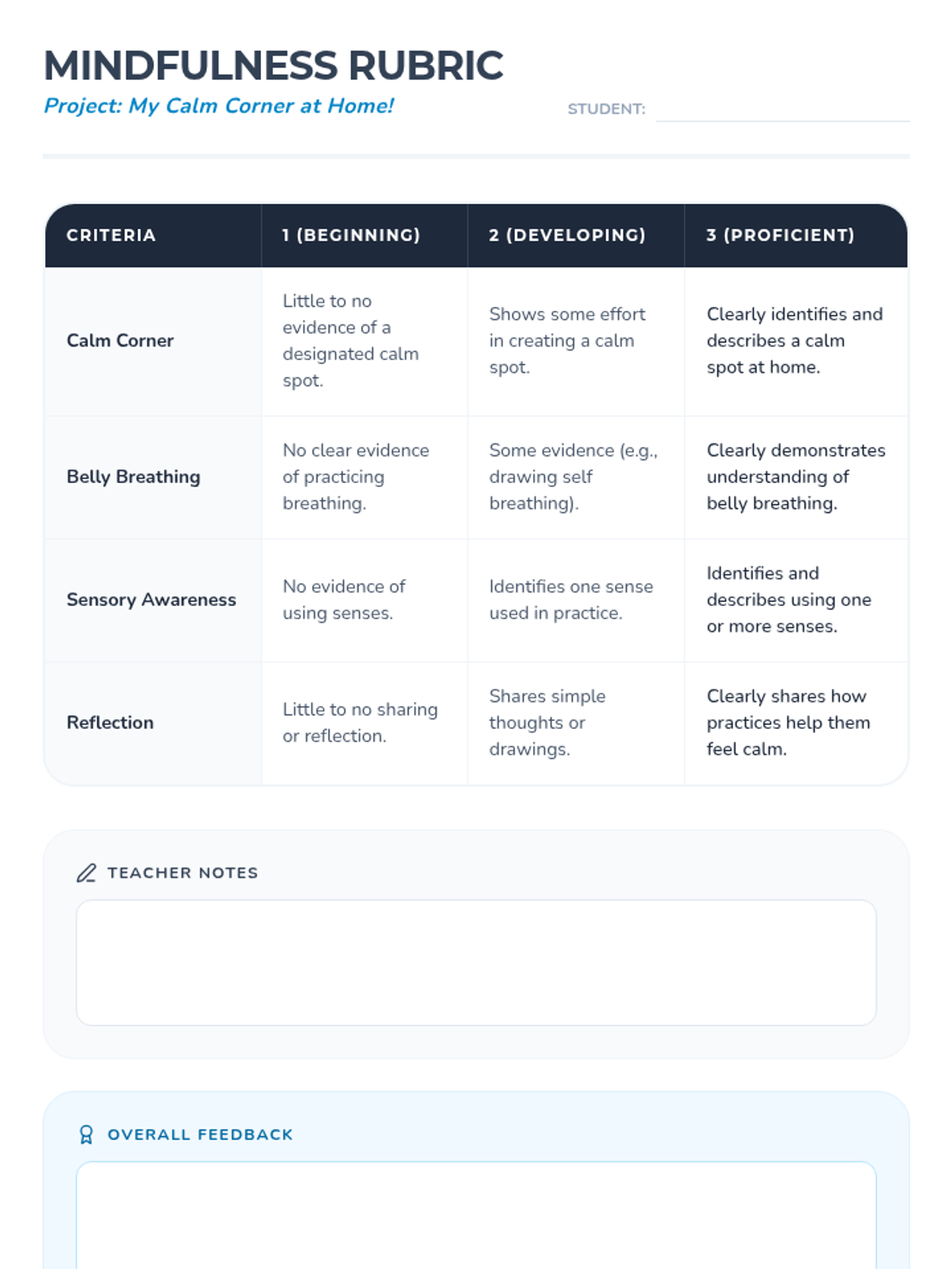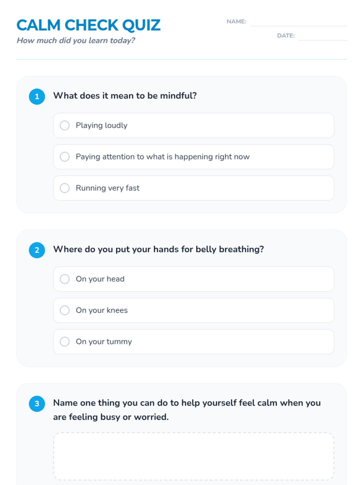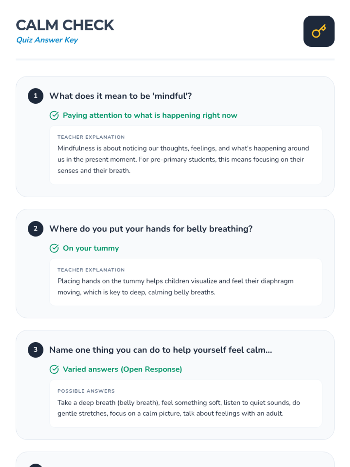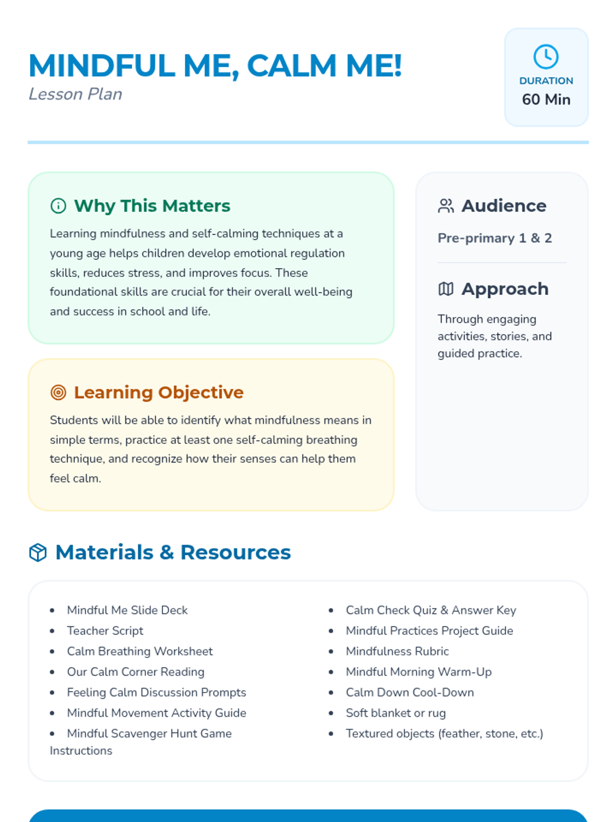 A 60-minute lesson for pre-primary students introducing mindfulness, belly breathing, and sensory awareness to build emotional regulation skills.