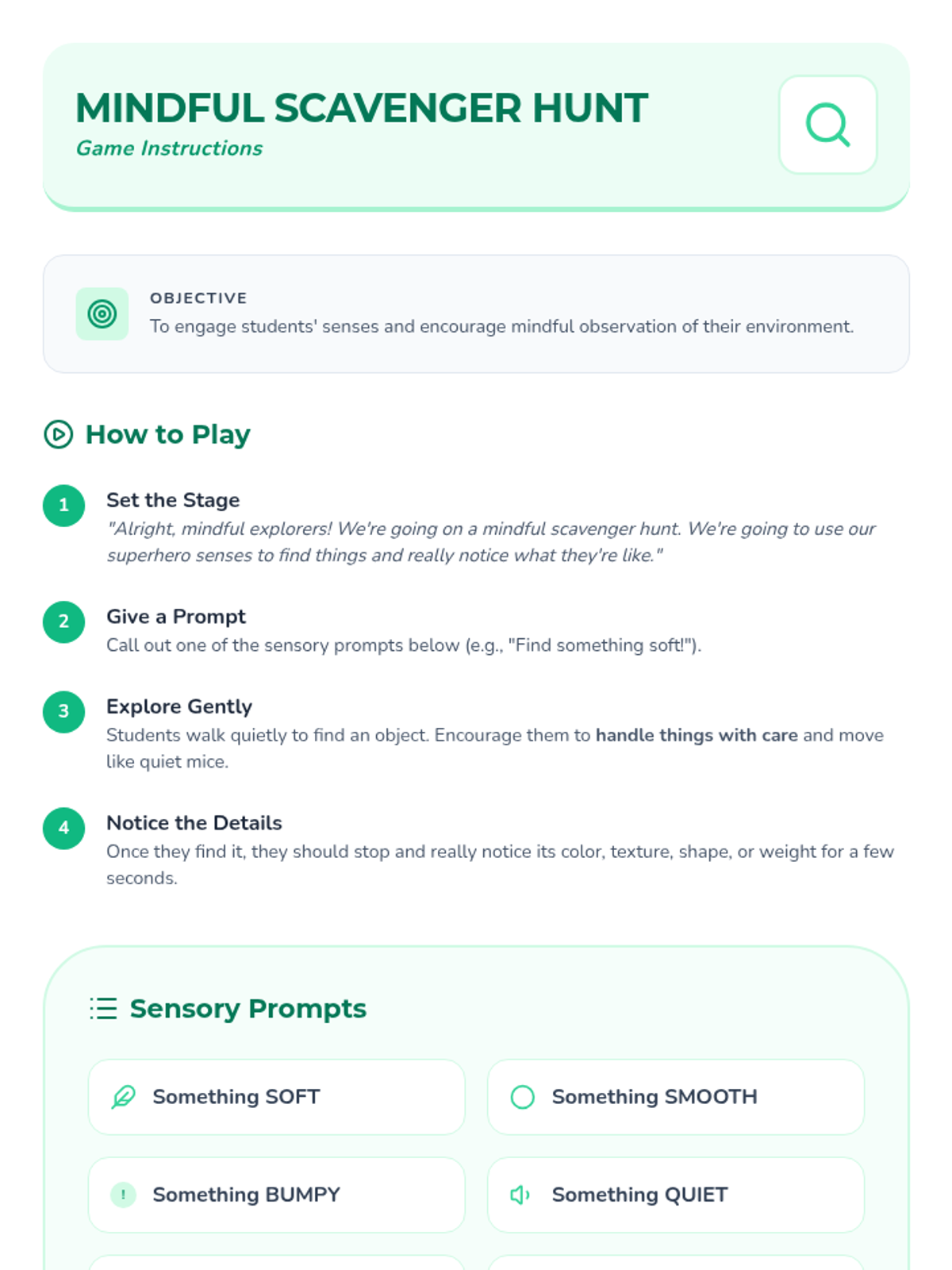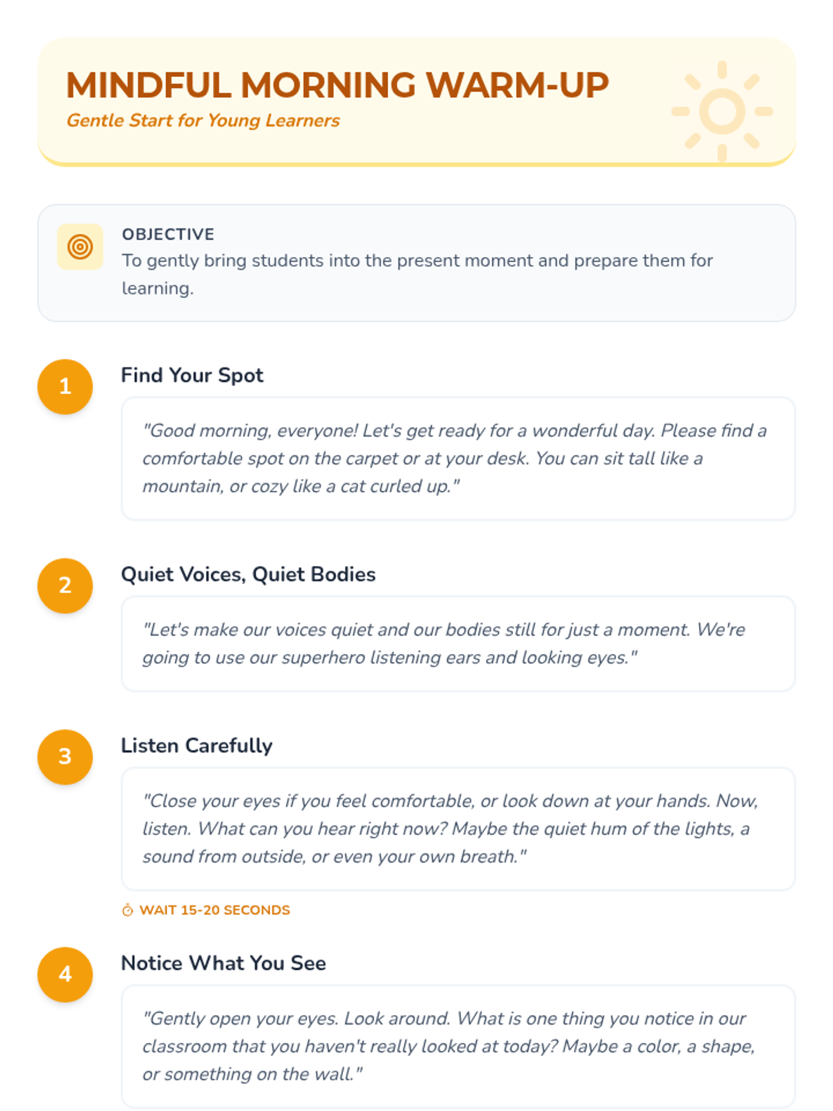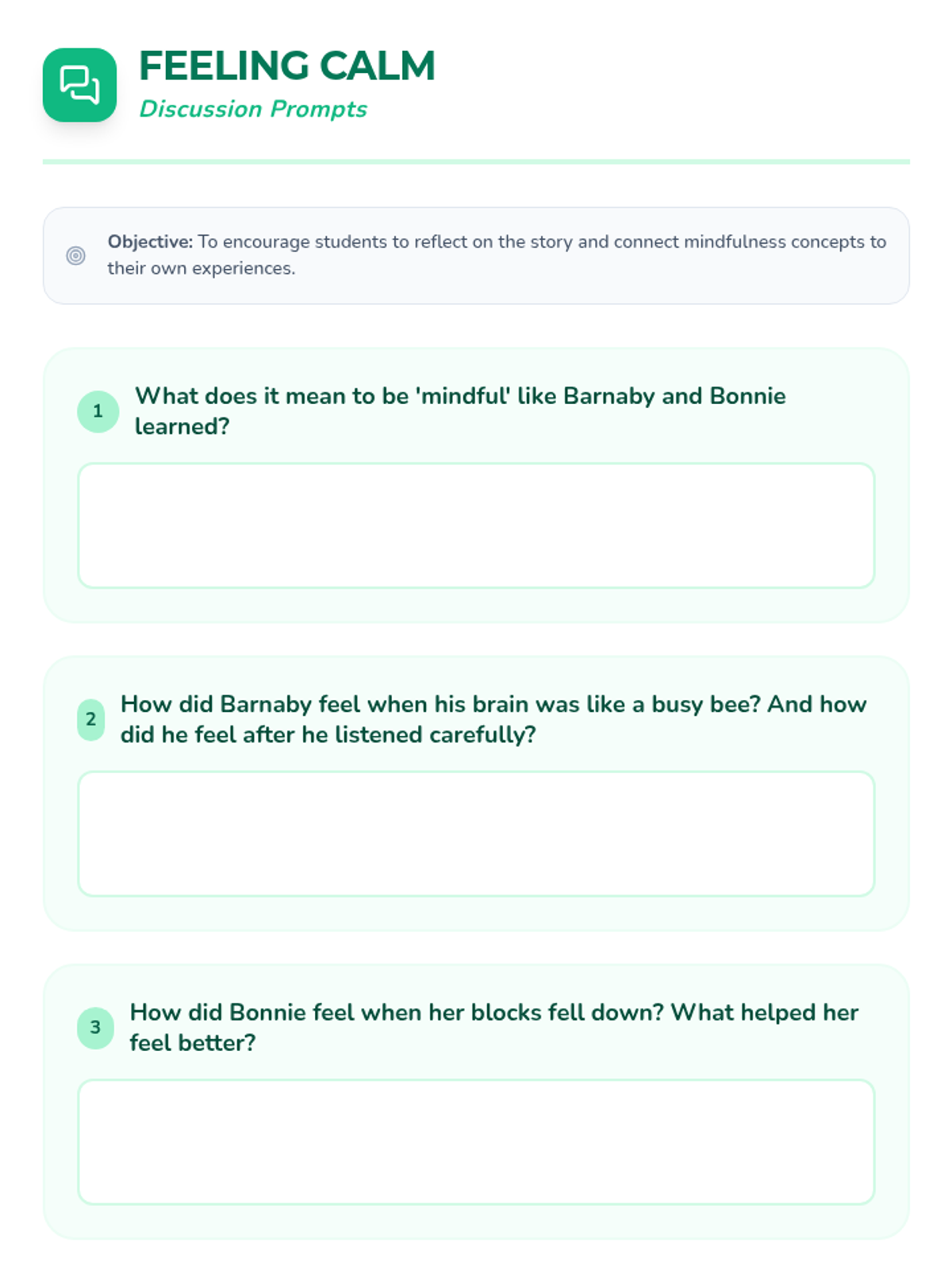 A 60-minute lesson for pre-primary students introducing mindfulness, belly breathing, and sensory awareness to build emotional regulation skills.