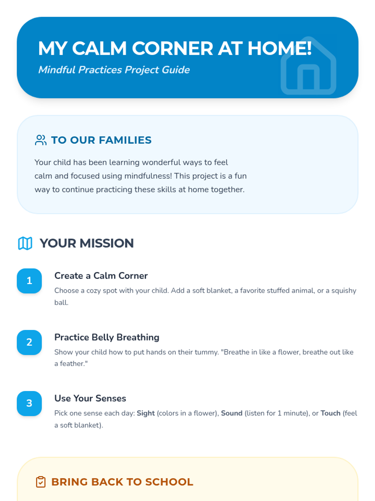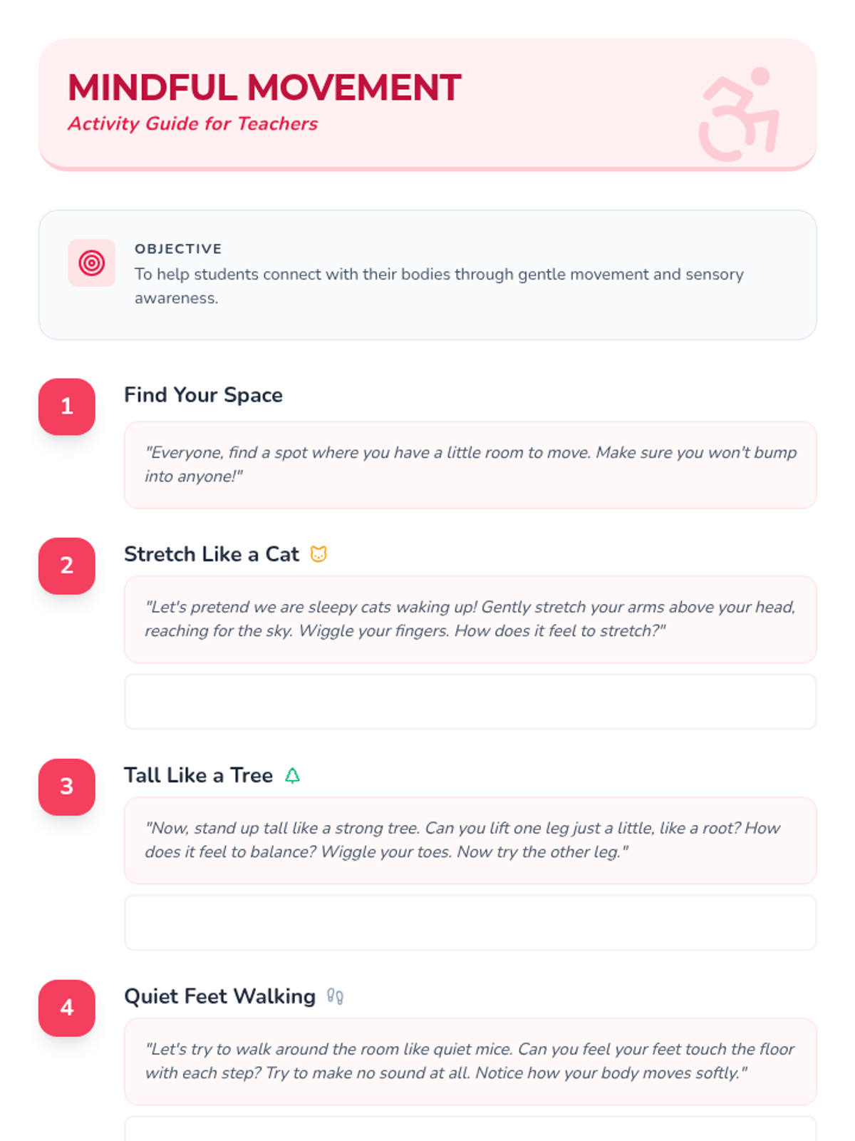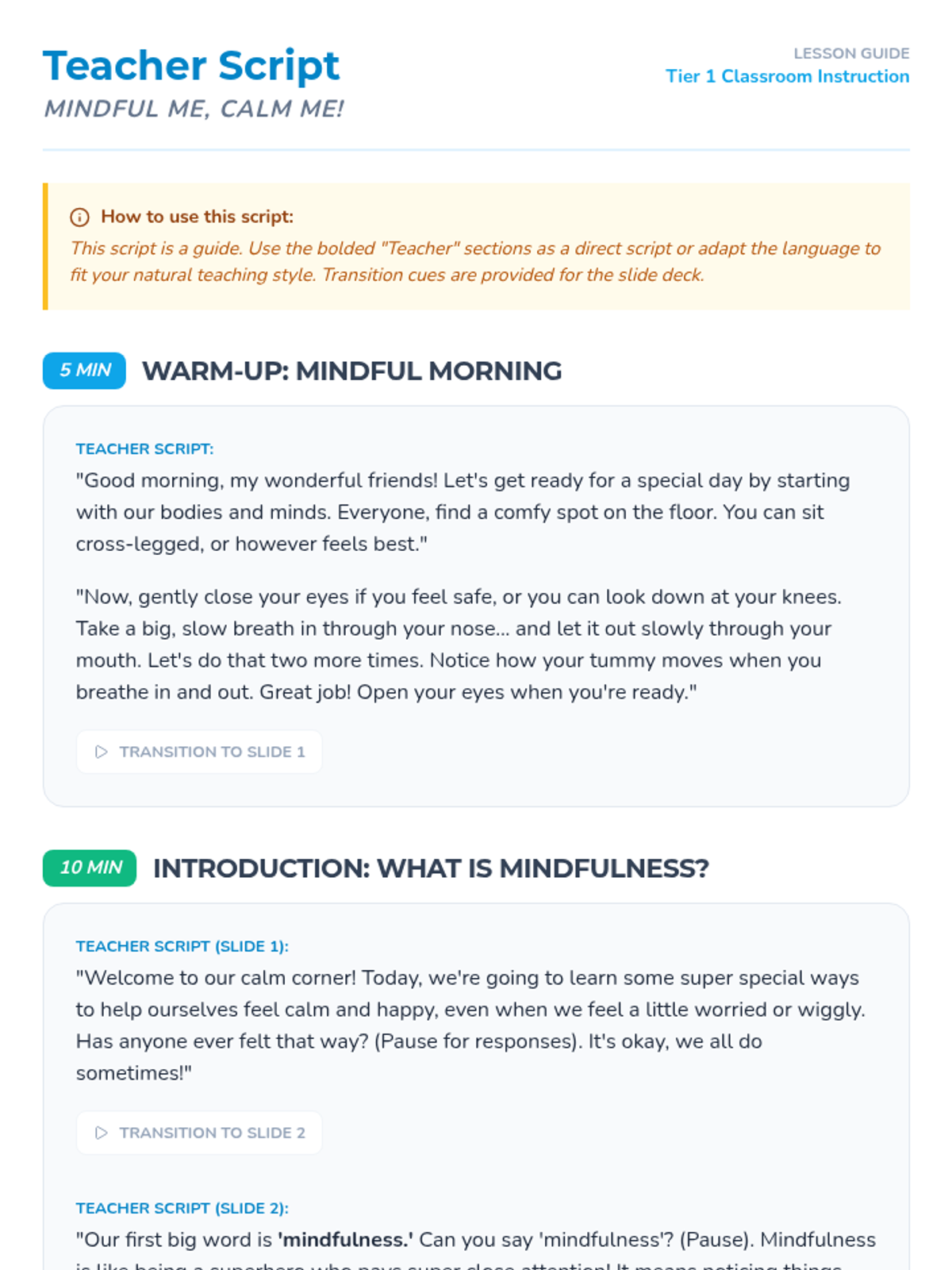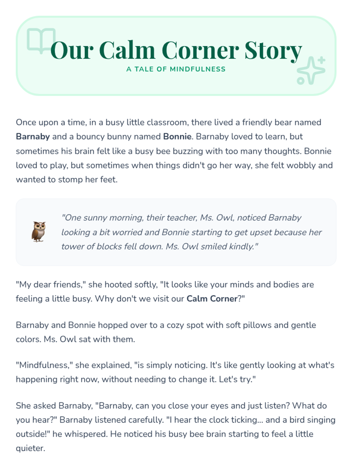 A 60-minute lesson for pre-primary students introducing mindfulness, belly breathing, and sensory awareness to build emotional regulation skills.