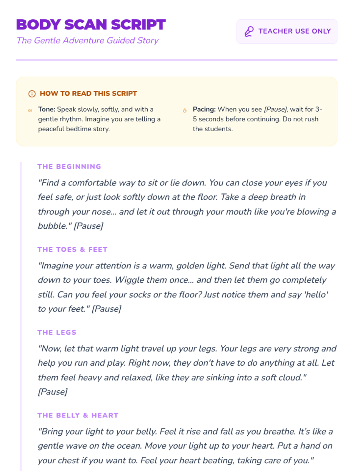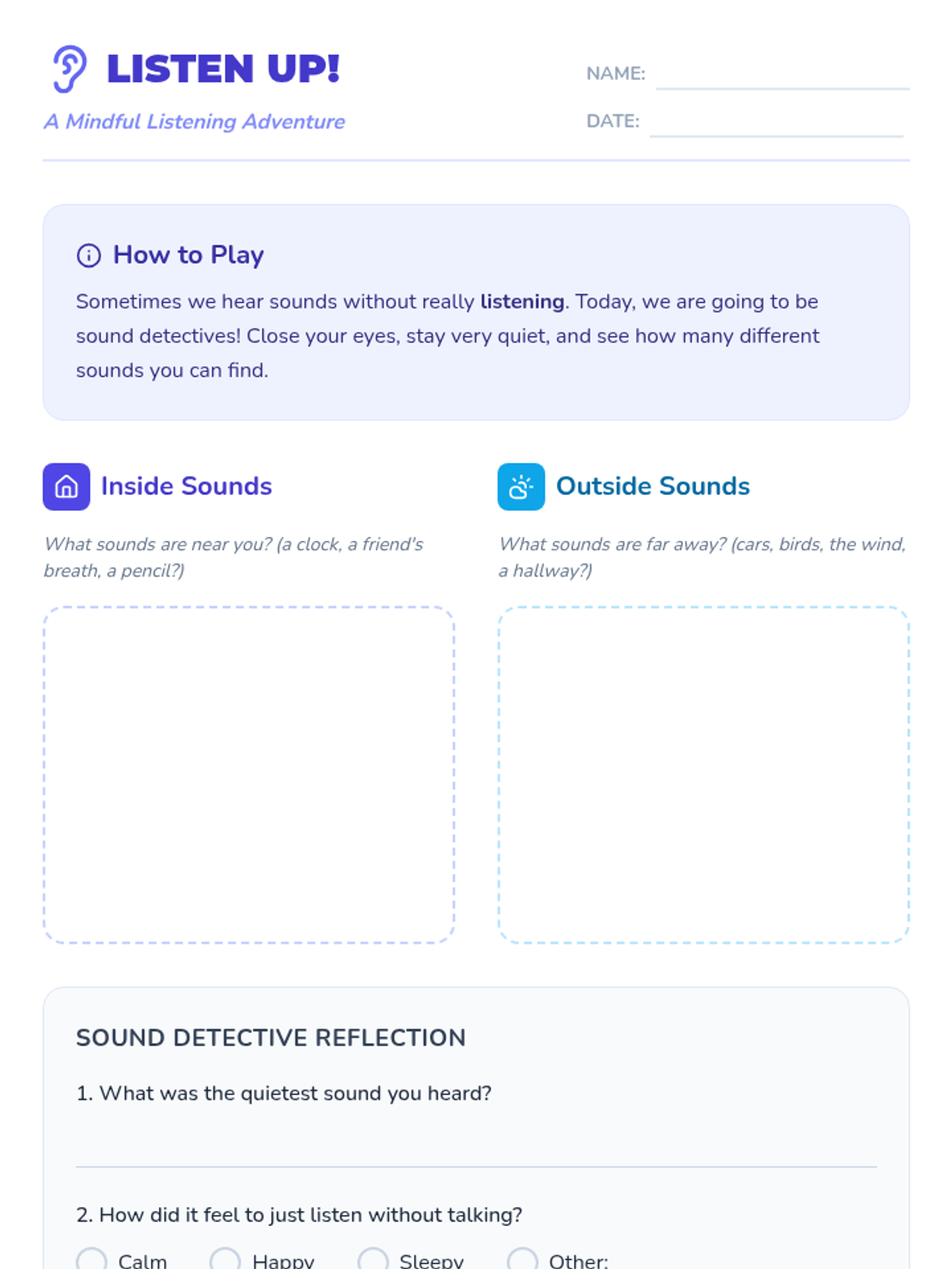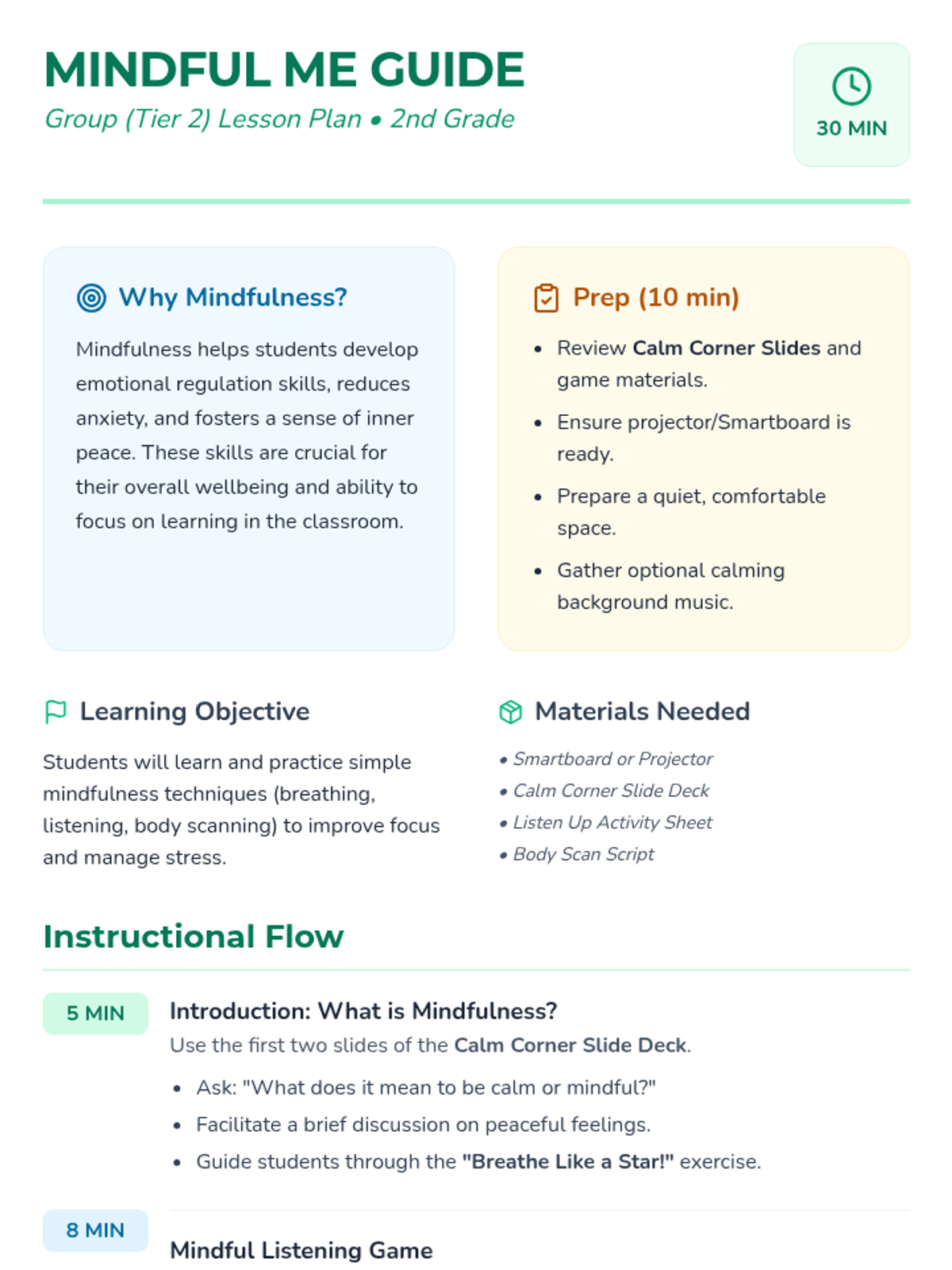 A mindfulness lesson for 2nd graders to learn focus and stress management through breathing, listening, and body awareness.