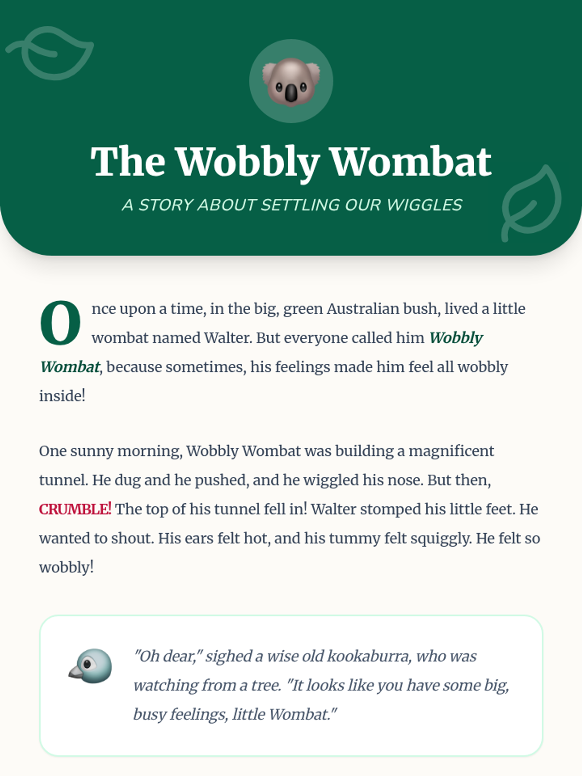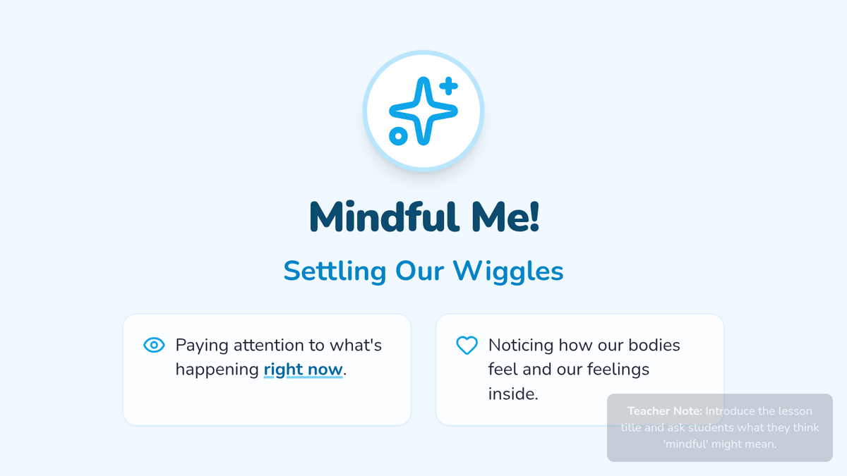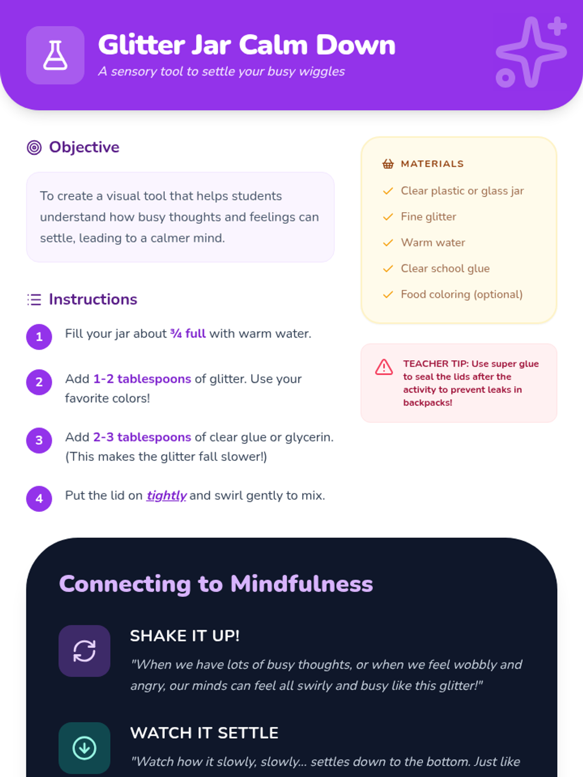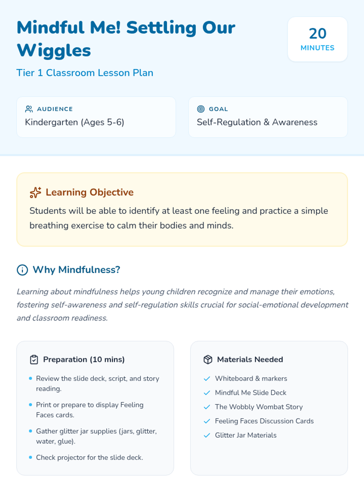 A 20-minute interactive kindergarten lesson introducing mindfulness through the story of 'The Wobbly Wombat' and a sensory glitter jar activity.