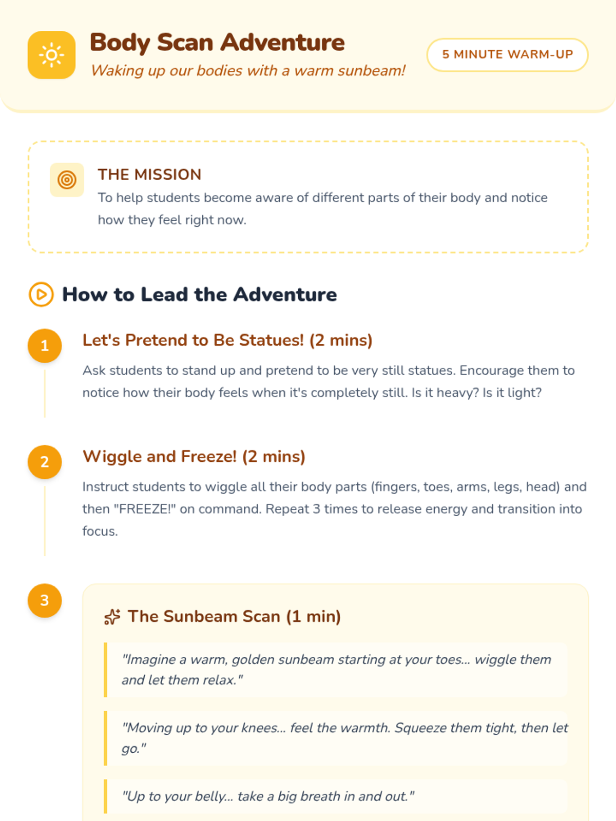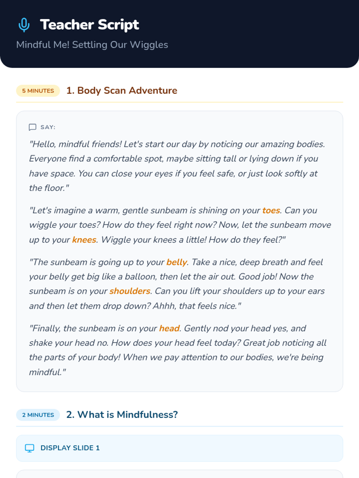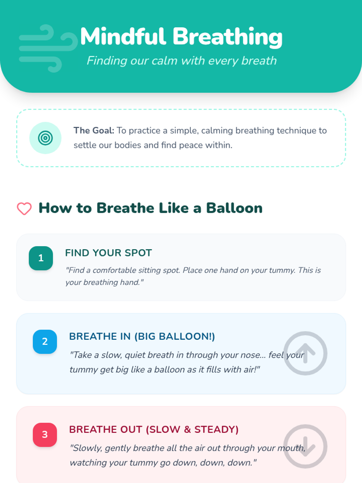 A 20-minute interactive kindergarten lesson introducing mindfulness through the story of 'The Wobbly Wombat' and a sensory glitter jar activity.