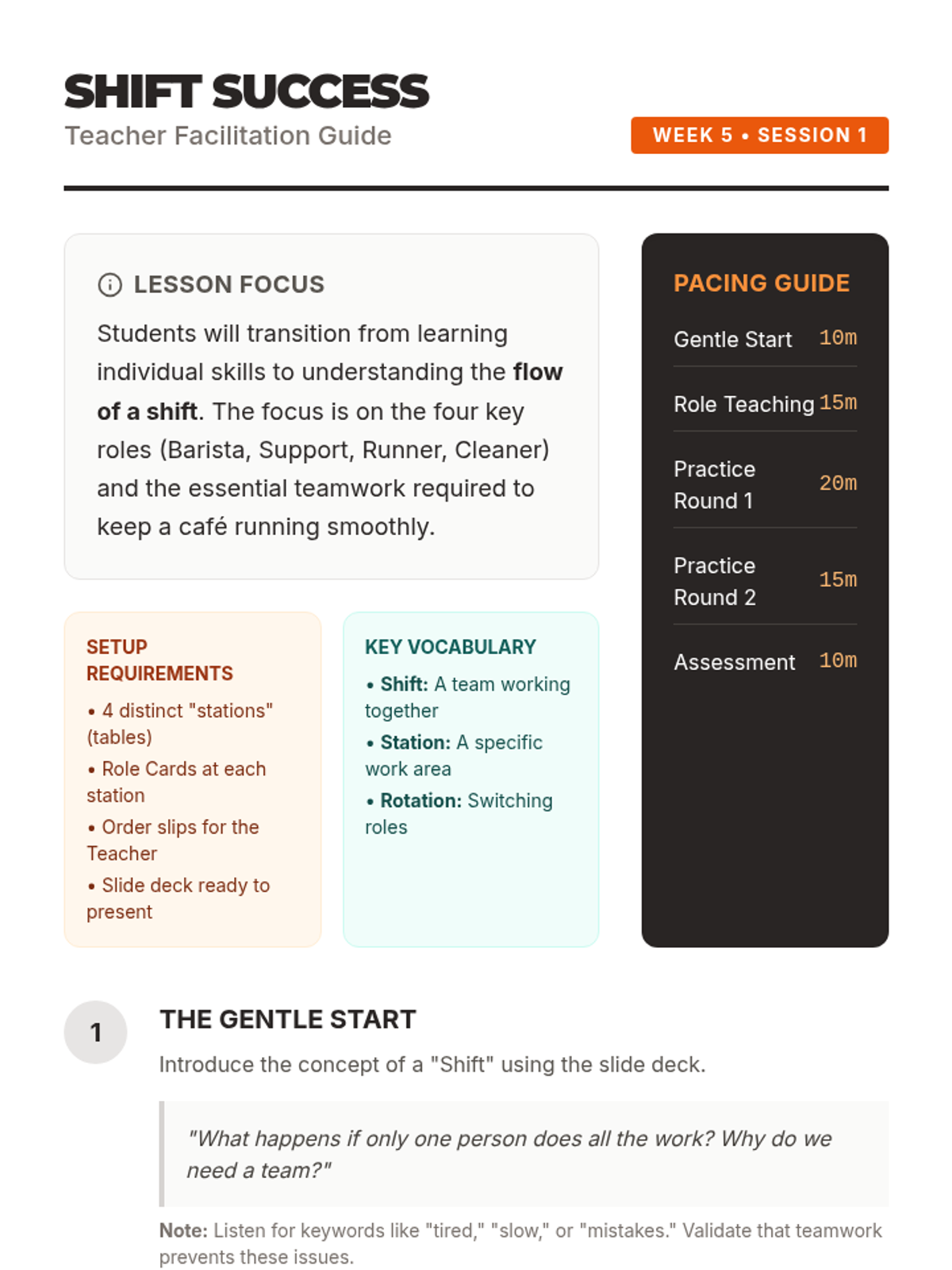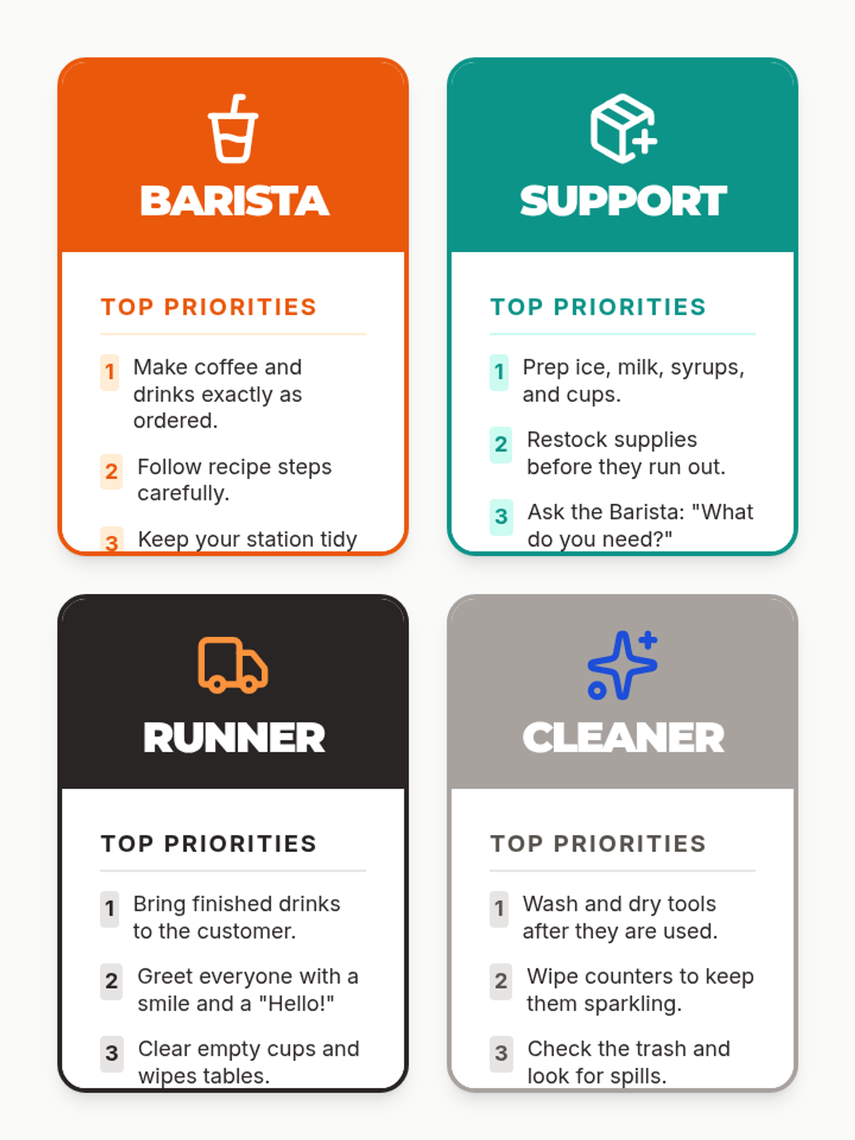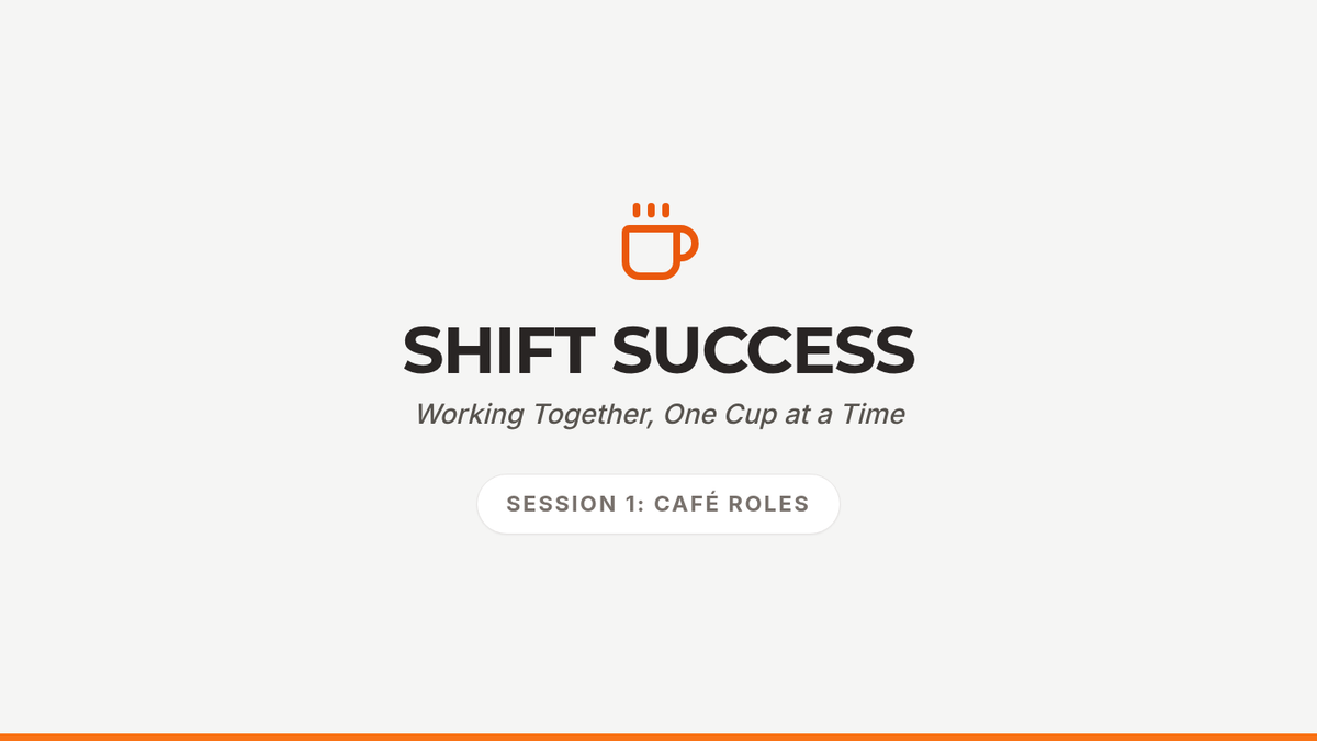 A foundational lesson on cafe operations, focusing on the four key roles (Barista, Support, Runner, Cleaner) and how they collaborate during a shift. Students will practice role-switching and teamwork through simulated drink orders.
