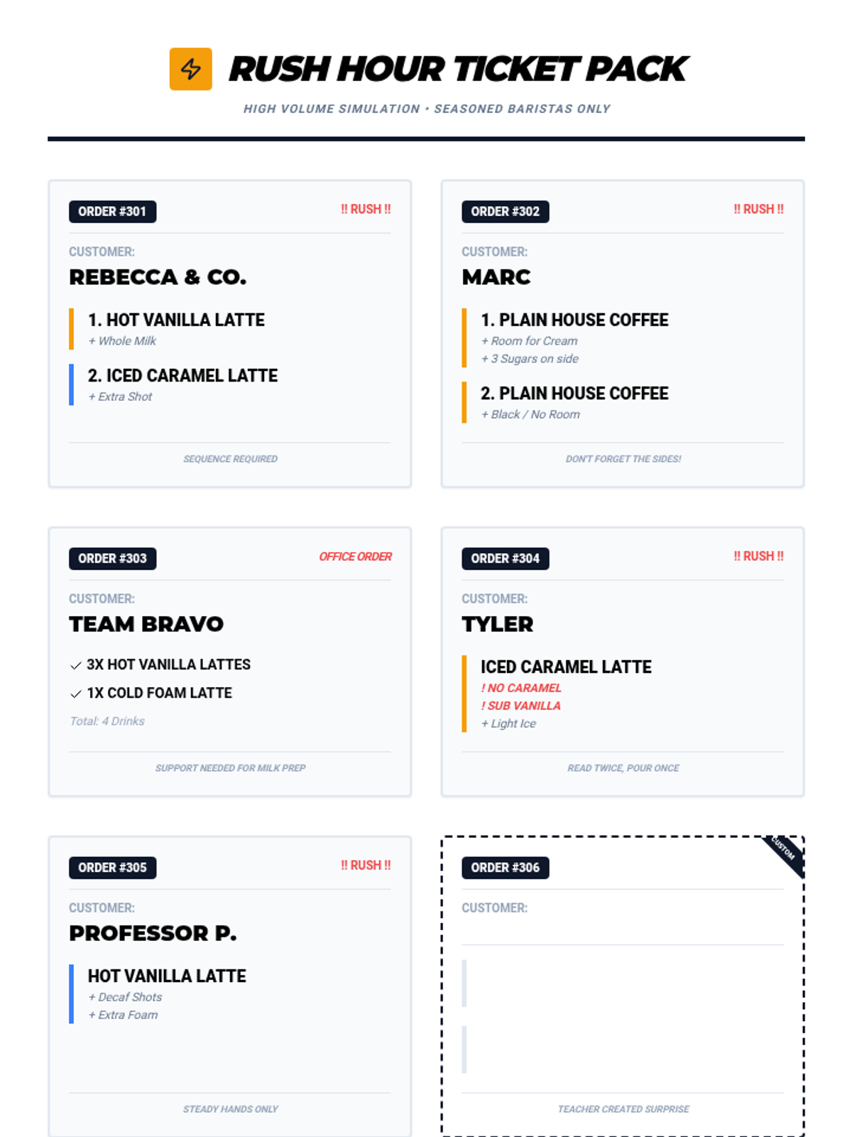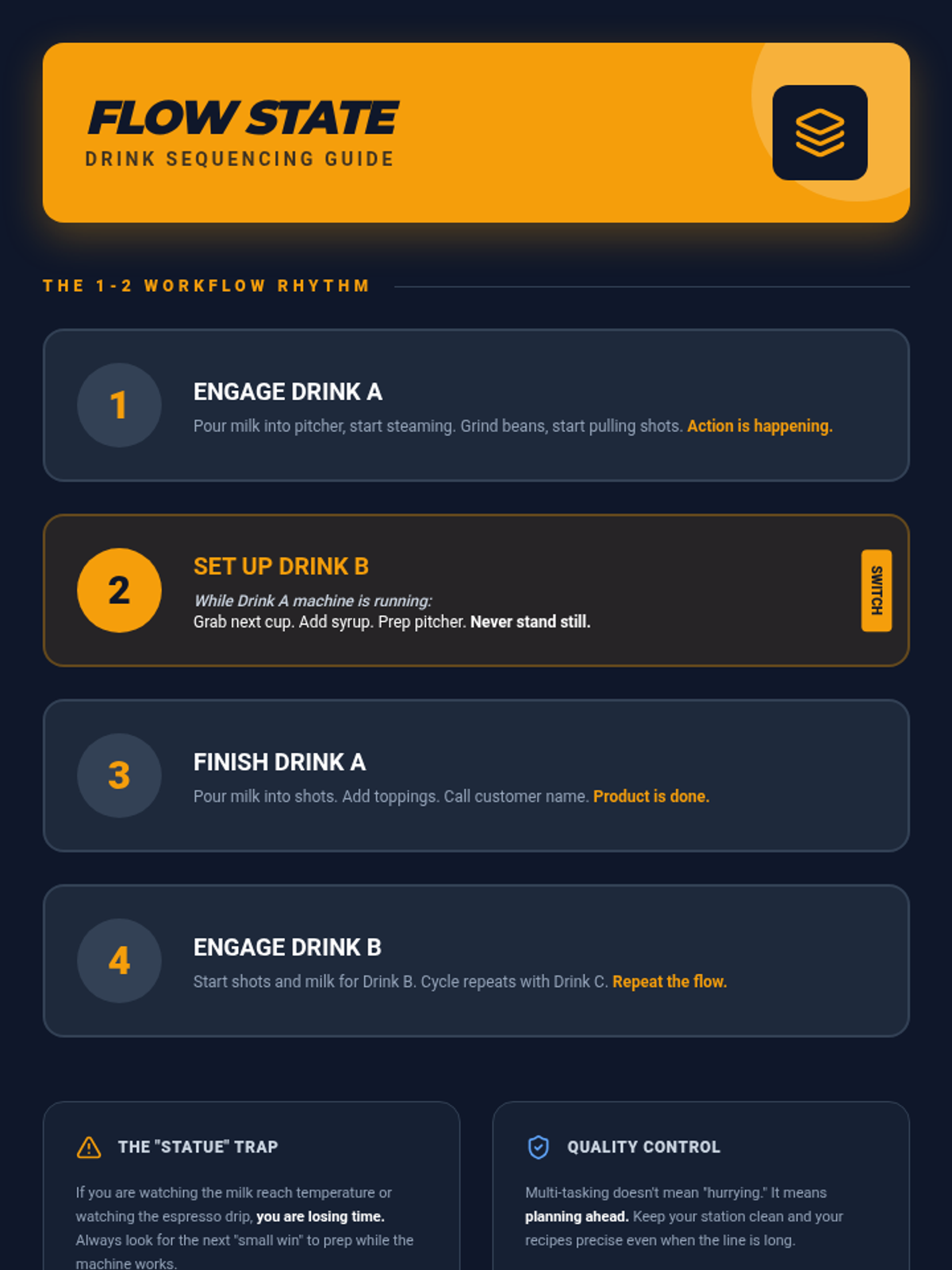 This lesson prepares students for high-volume periods in the cafe. It focuses on maintaining drink quality while increasing speed, implementing 'sequencing' (starting a second drink while the first finishes), and managing a growing line of orders.