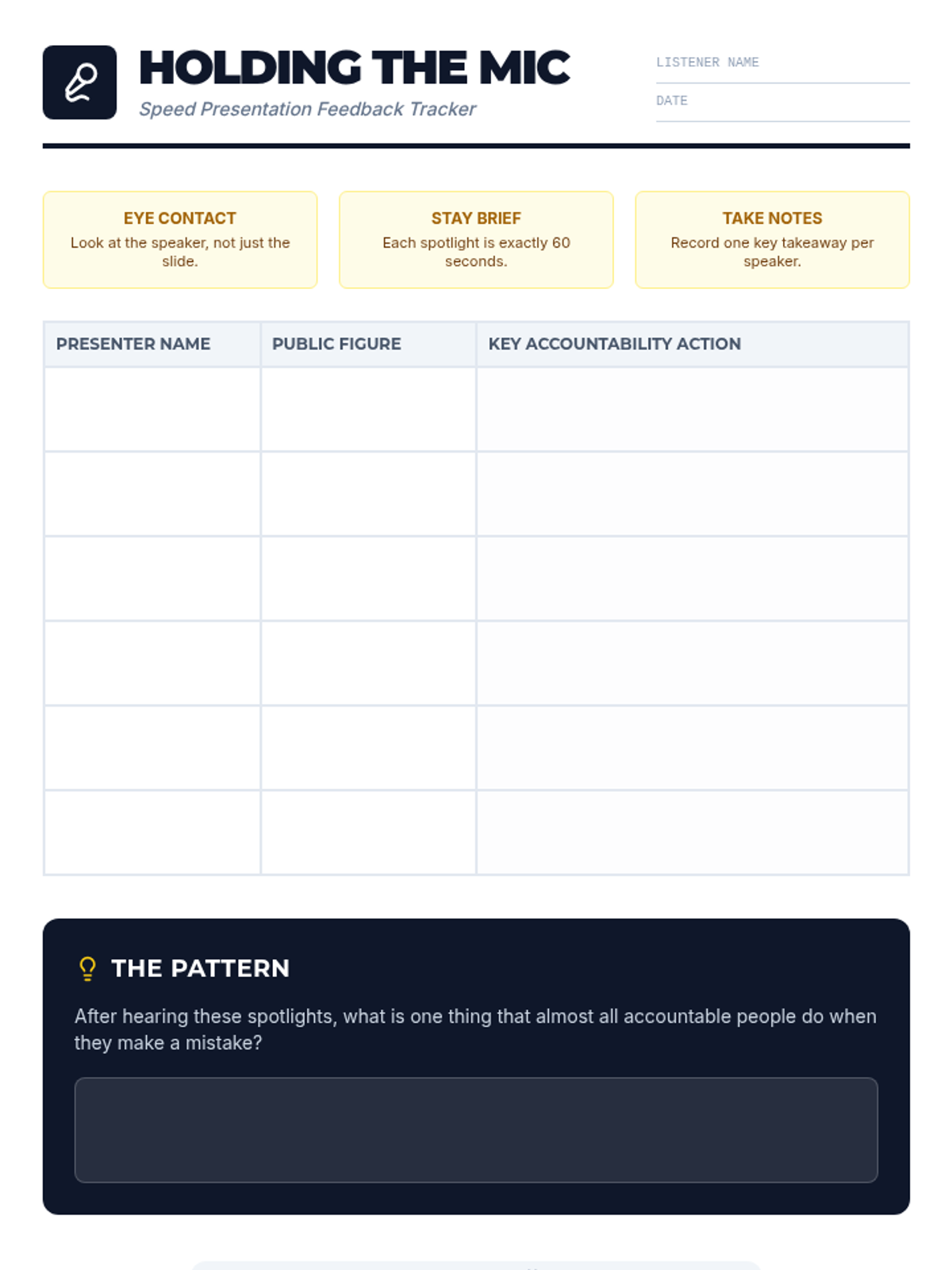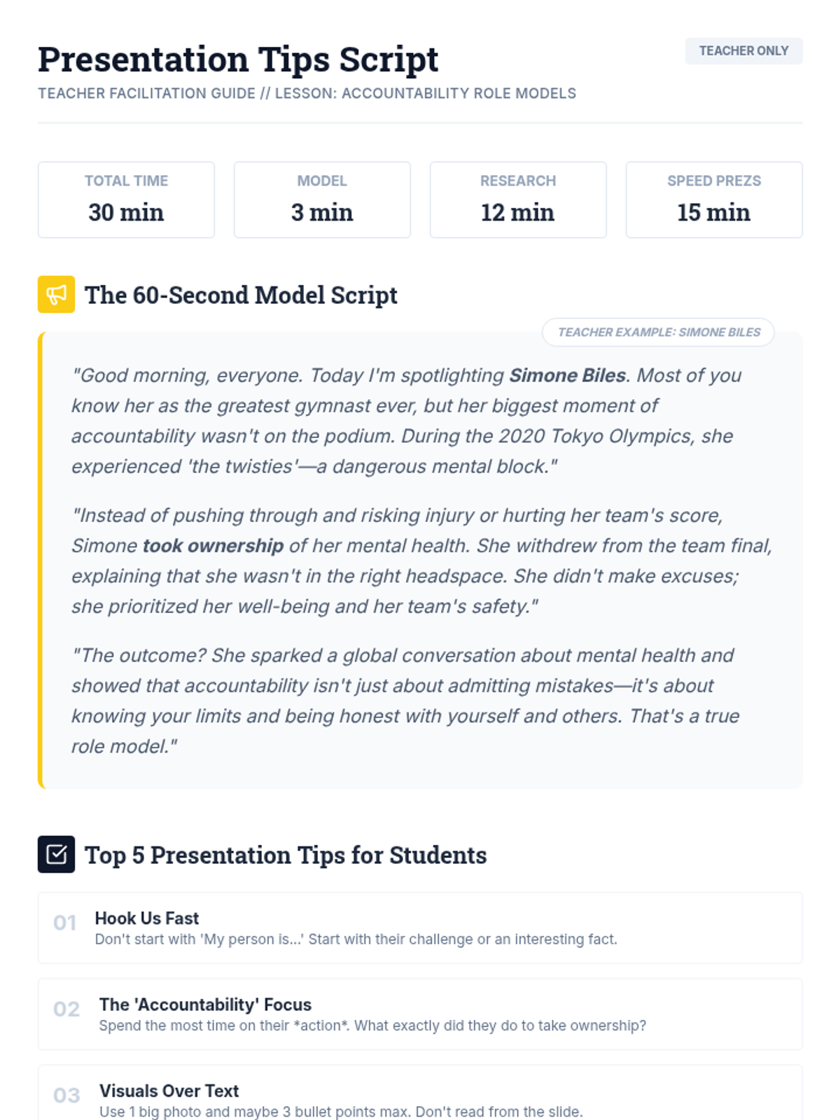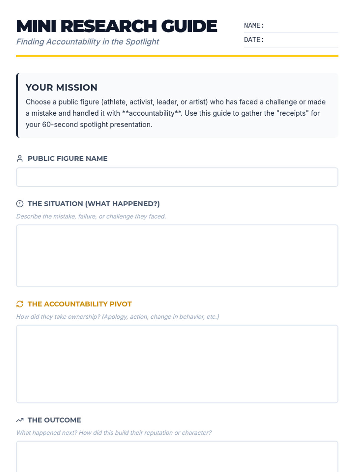 A 30-minute lesson where 8th-grade students research public figures who demonstrate accountability and present their findings through a 'One-Slide Spotlight' presentation.