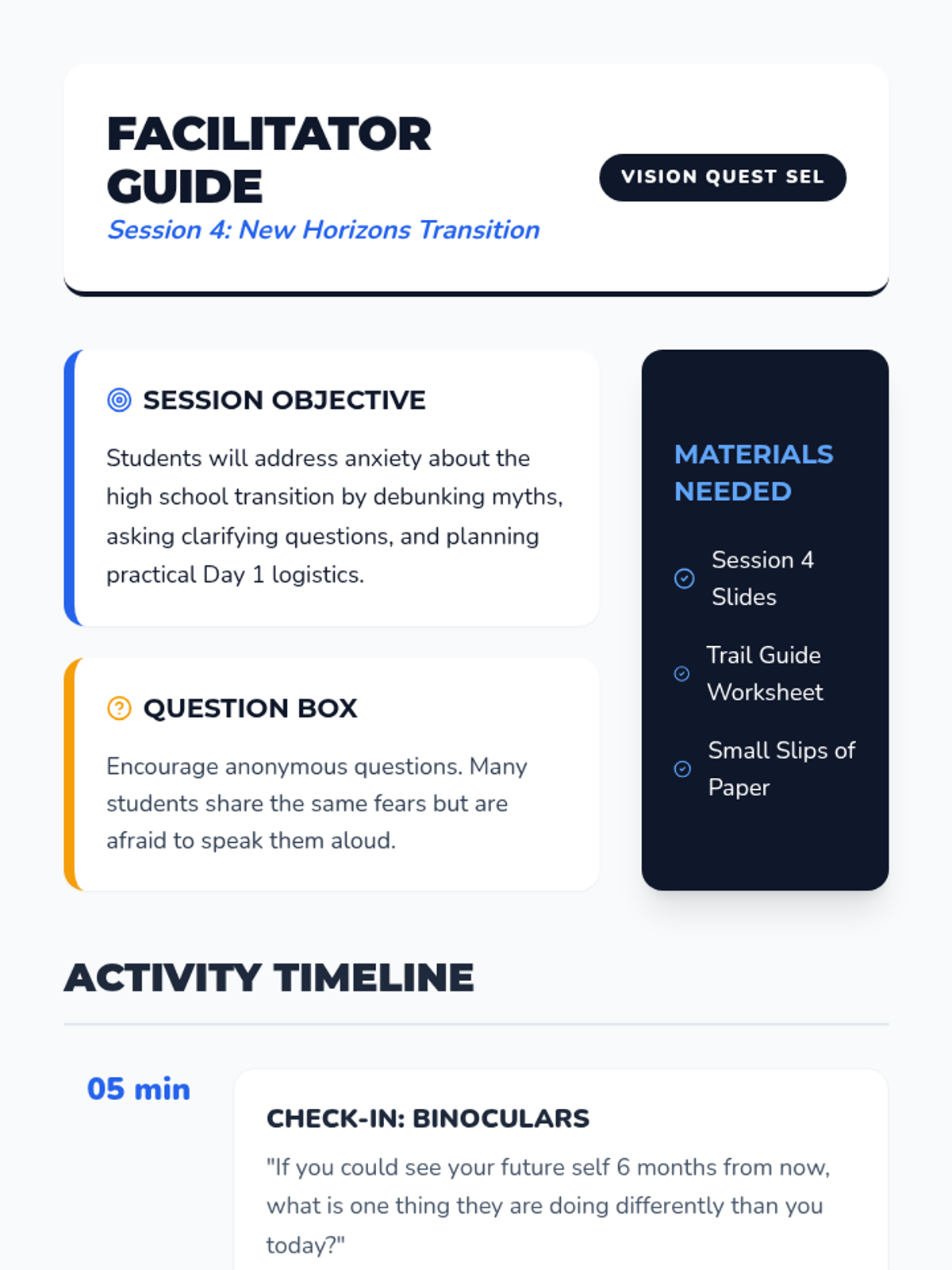 Students address common myths about high school, learn practical survival tips, and plan for their first week in a new environment.