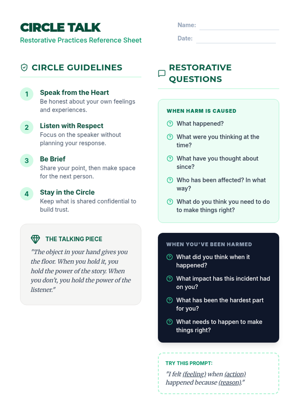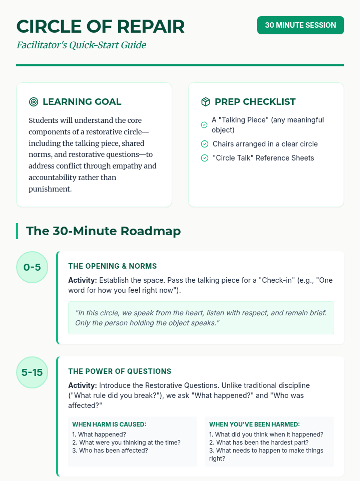 A 30-minute introductory lesson on the structure and purpose of restorative circles to resolve conflict and repair harm in a community setting.