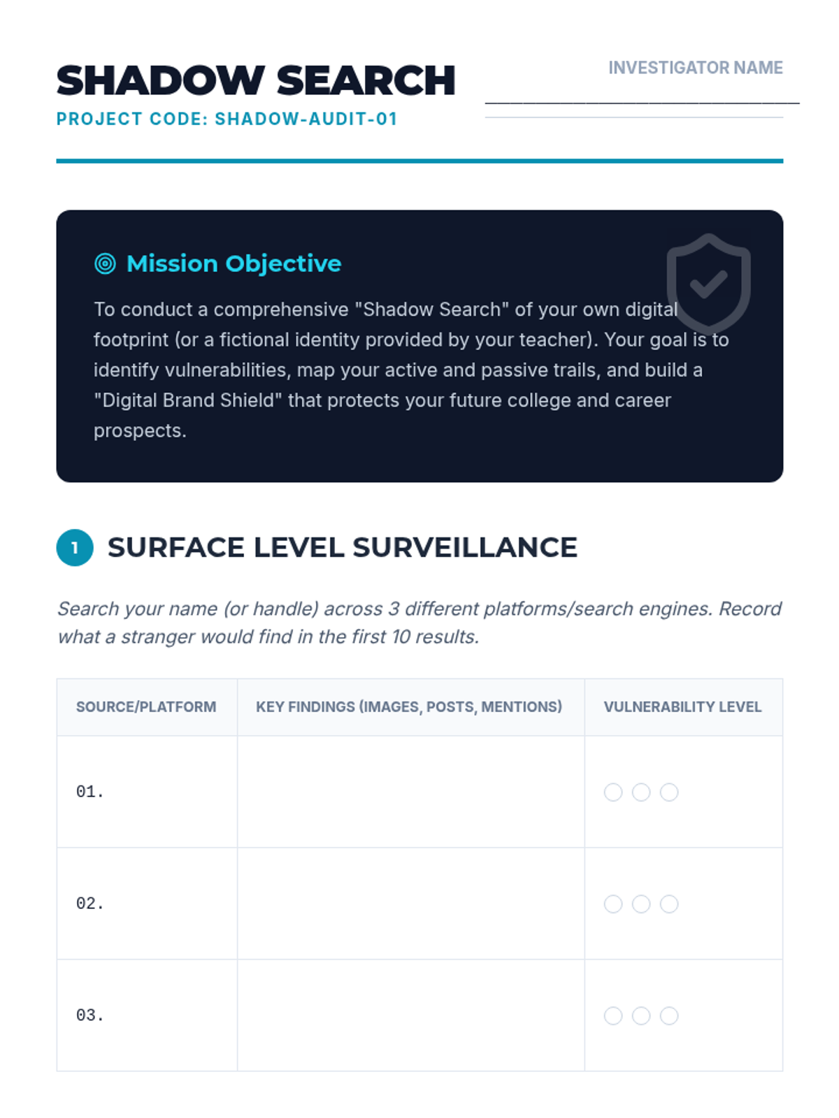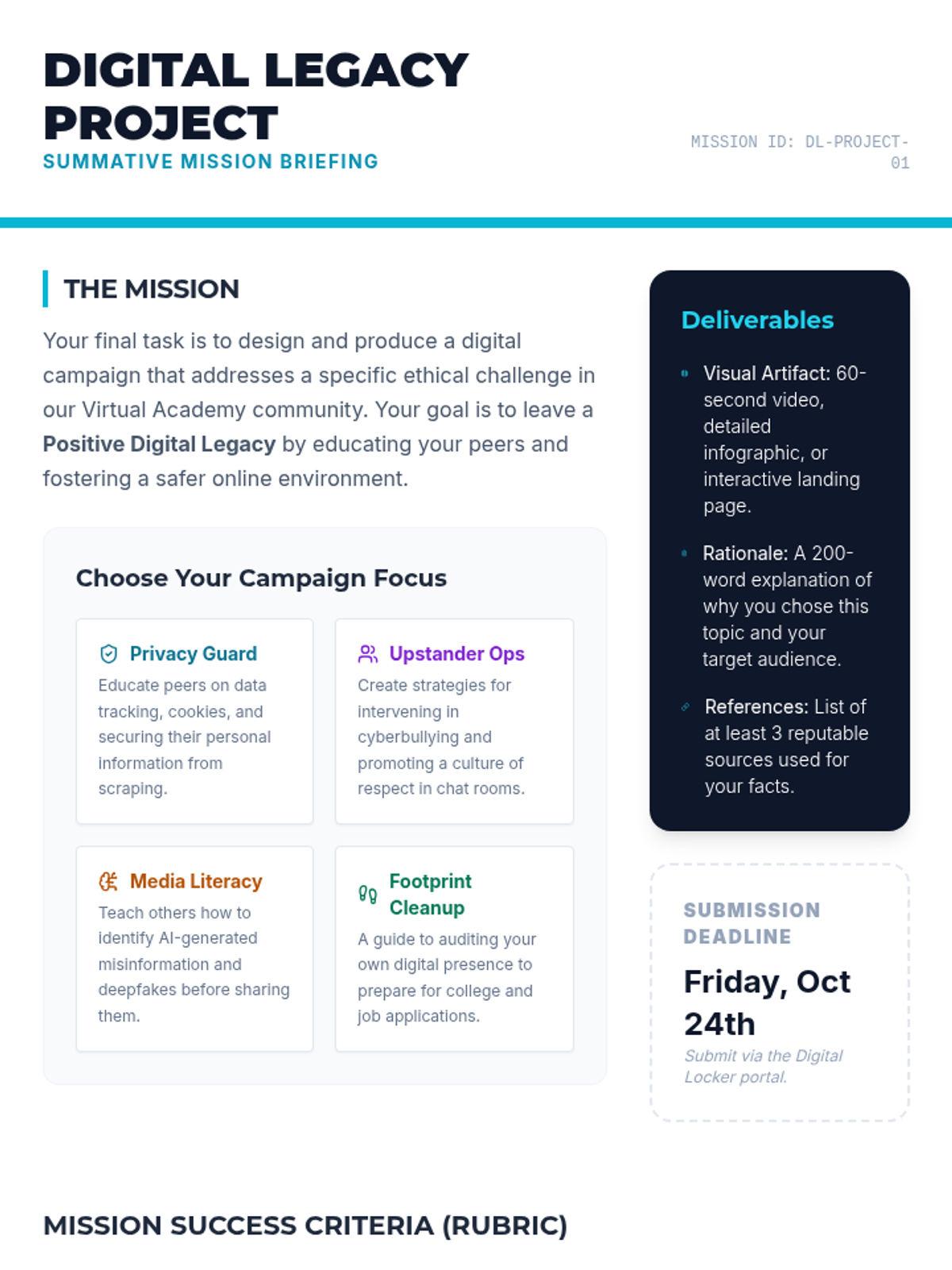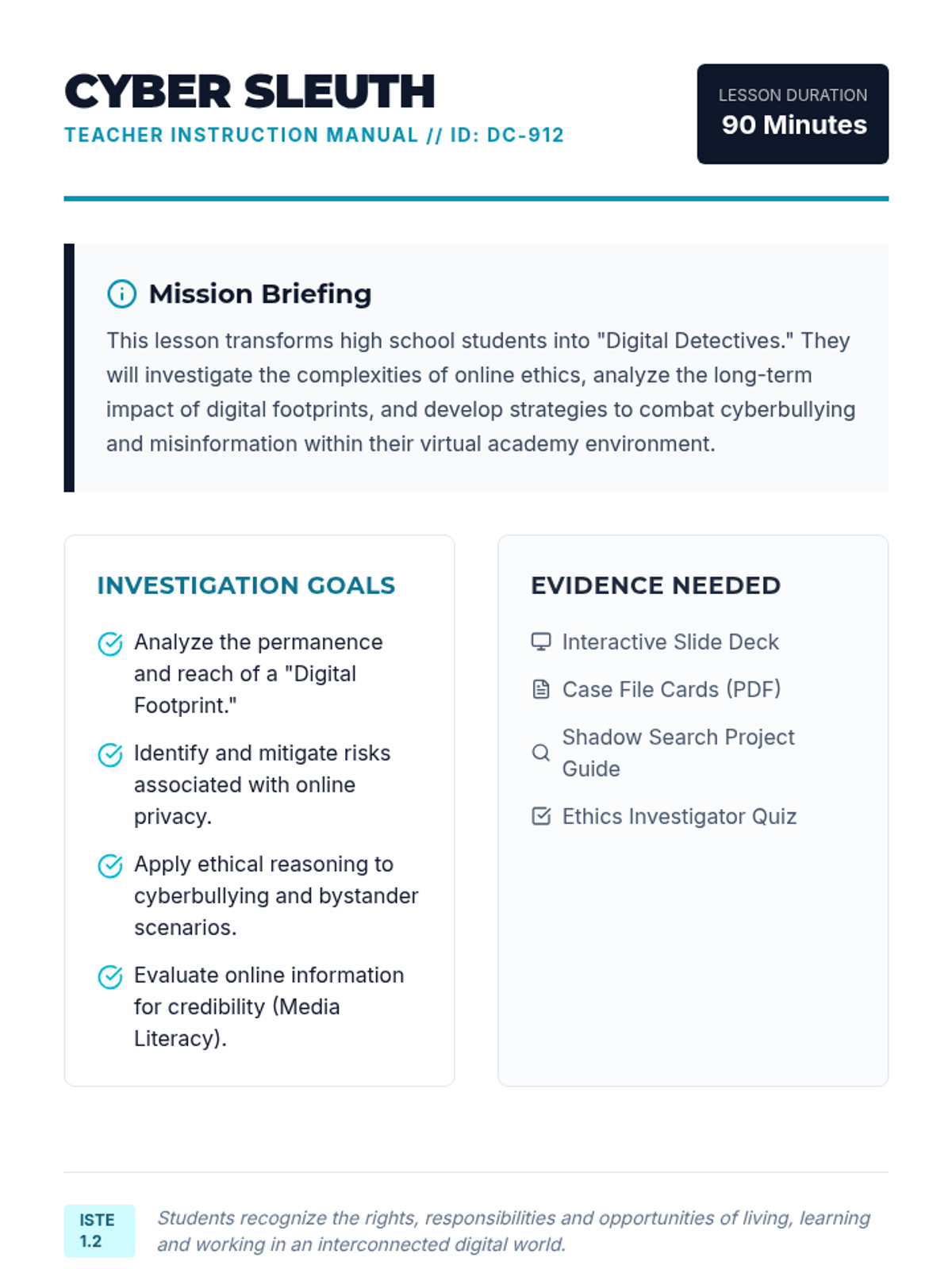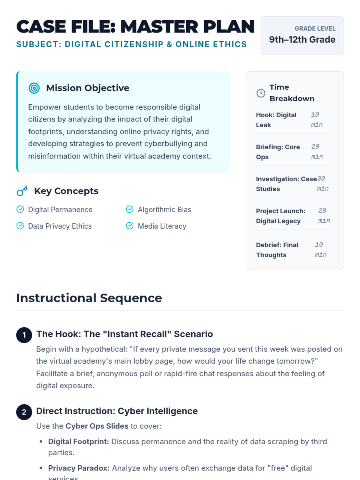 A comprehensive lesson for high school students on navigating the complexities of digital citizenship, focusing on privacy, ethics, and media literacy in a virtual environment.