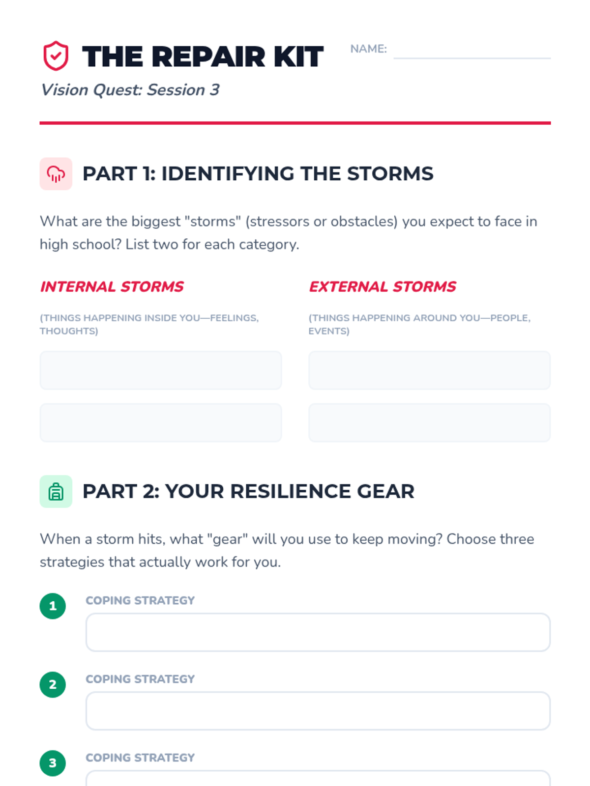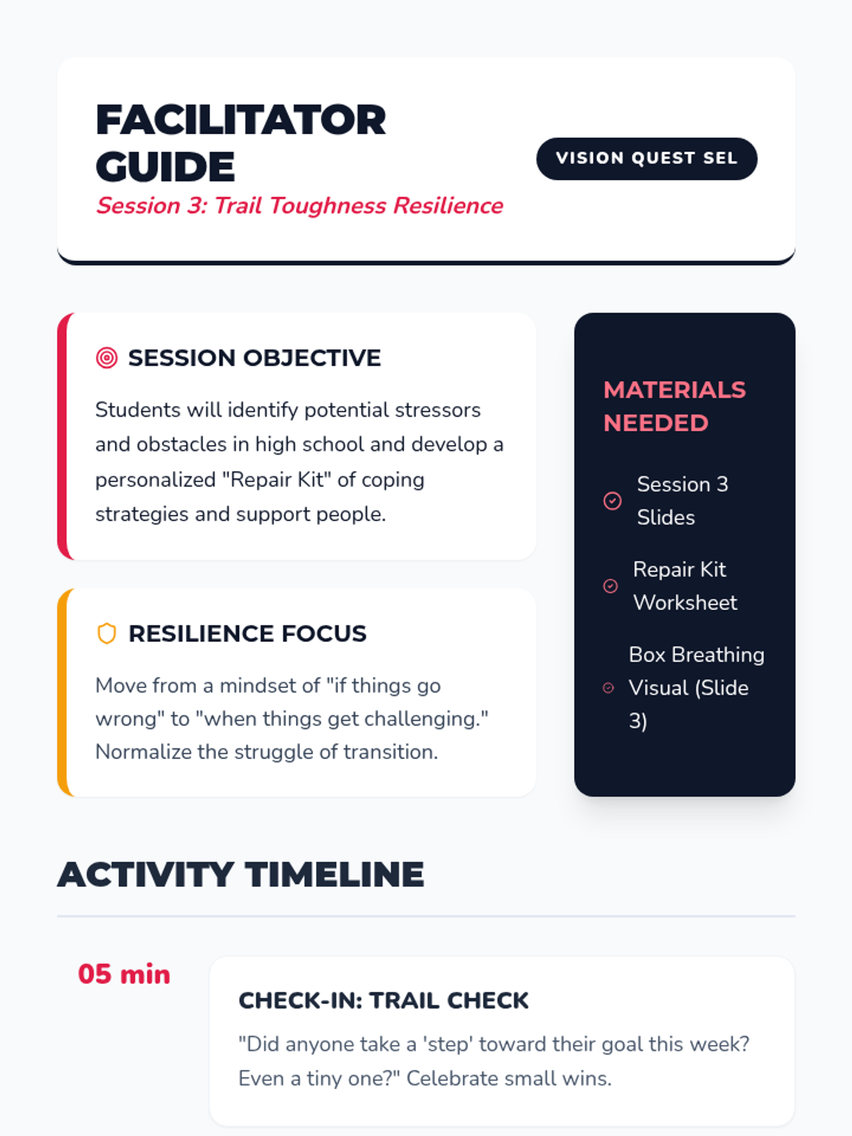 Students identify potential obstacles to their goals and develop healthy coping strategies to build resilience for the high school transition.