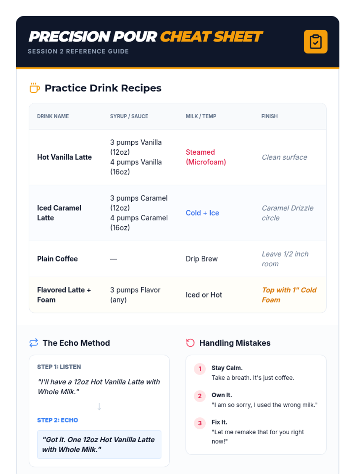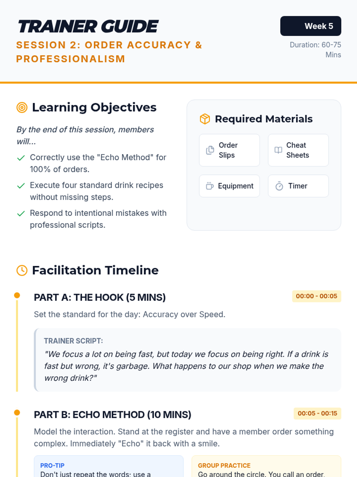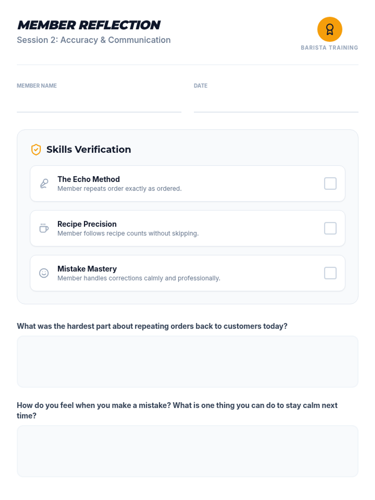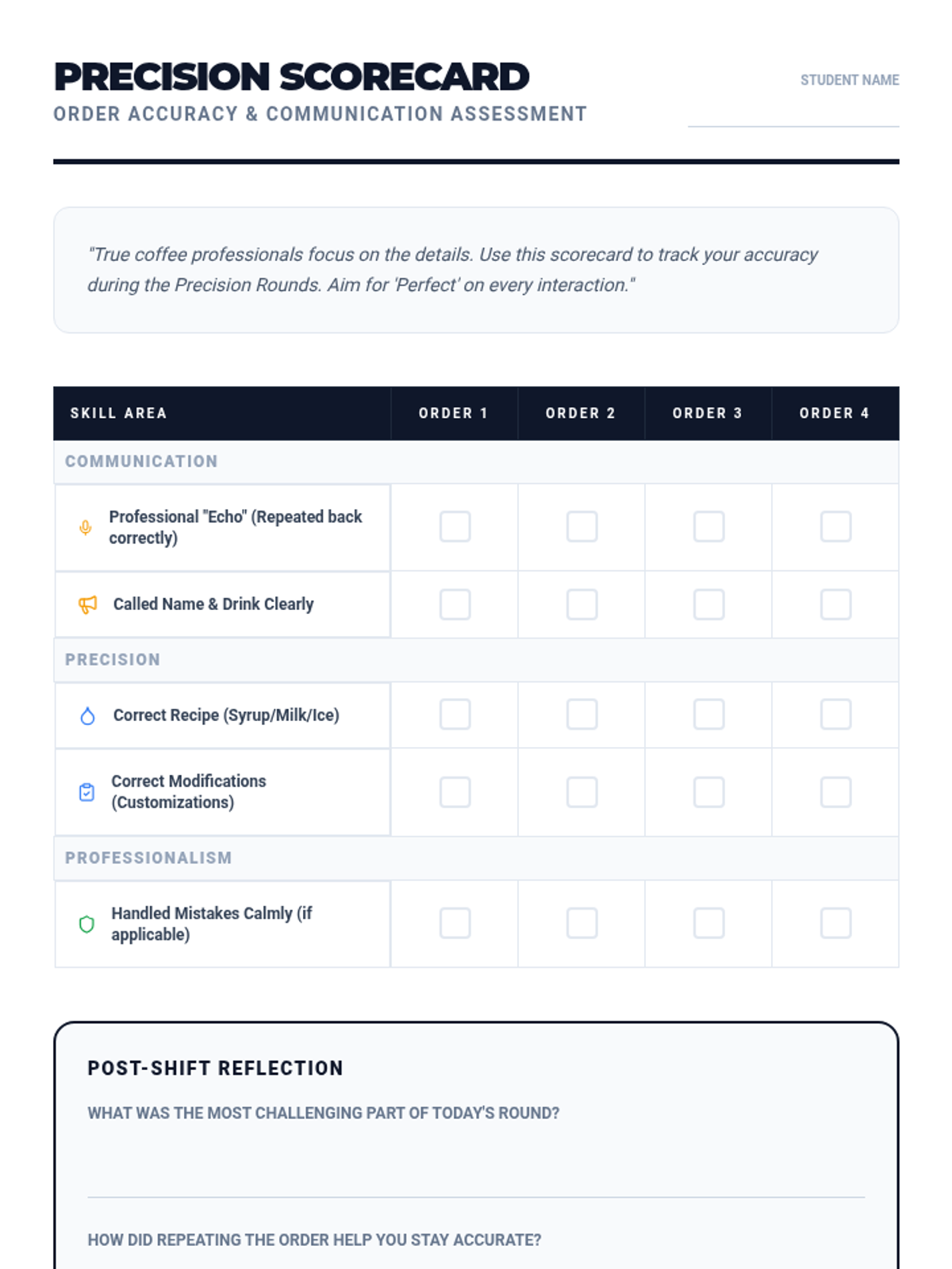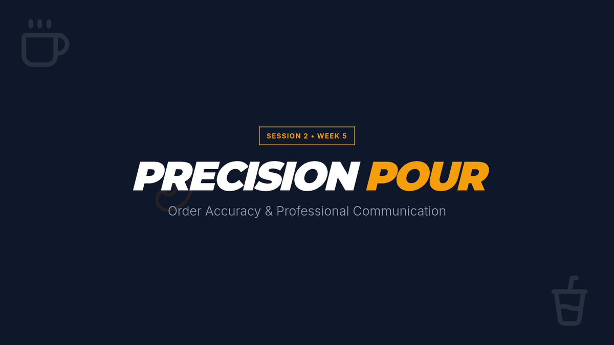 A training session focused on barista accuracy, professional communication through order repetition, and handling mistakes with grace.