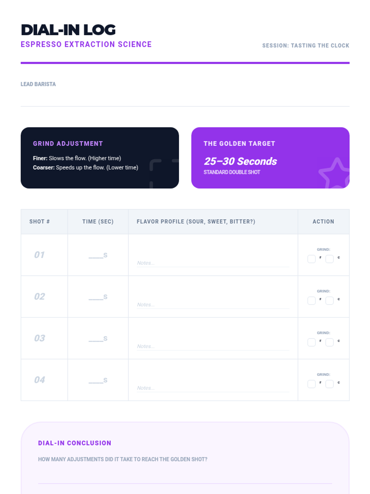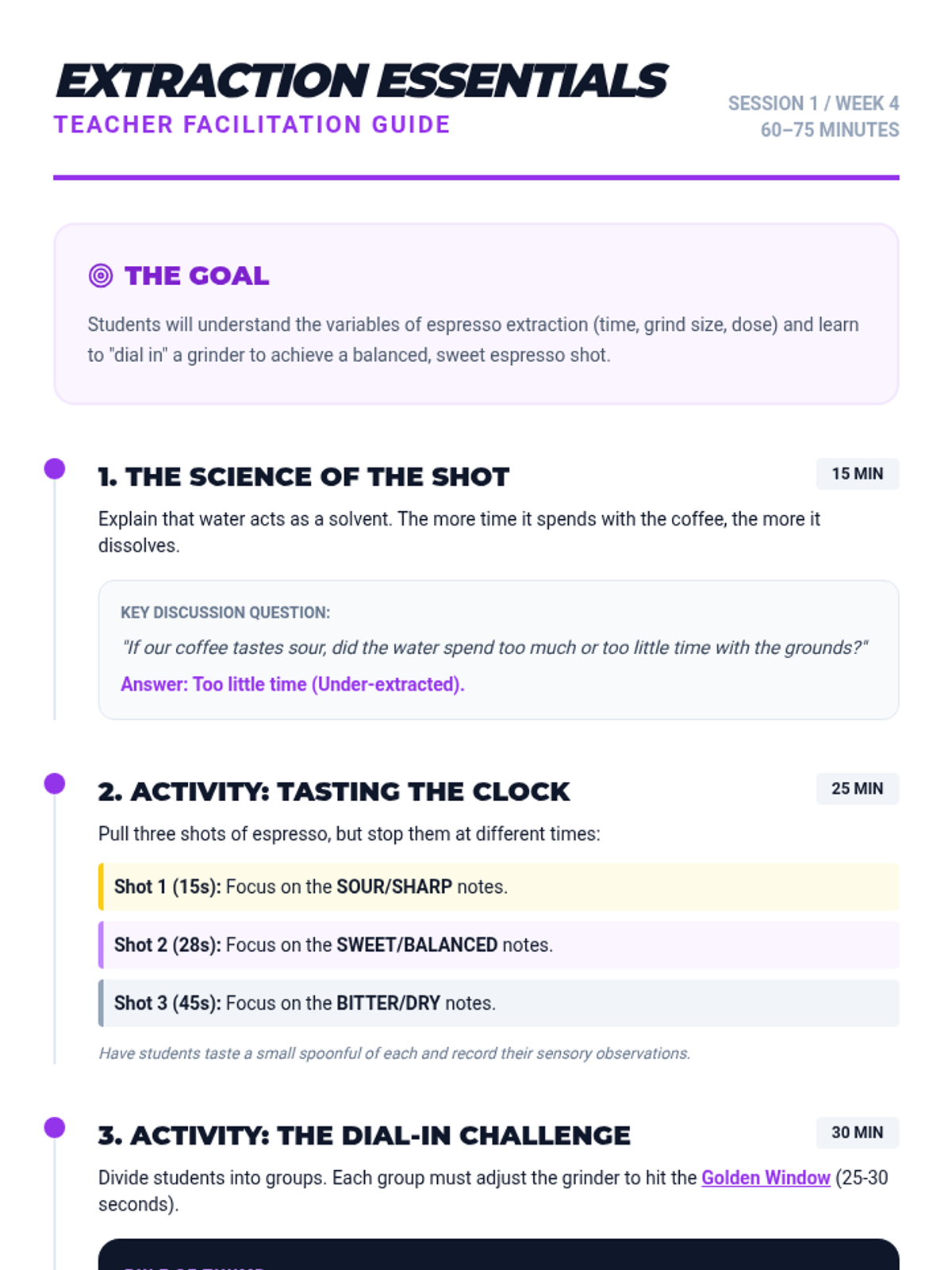 This lesson explores the science of espresso extraction. Students learn to identify the 'Golden Shot' by adjusting grind size and timing, and develop their palate to recognize under-extracted (sour) and over-extracted (bitter) coffee.