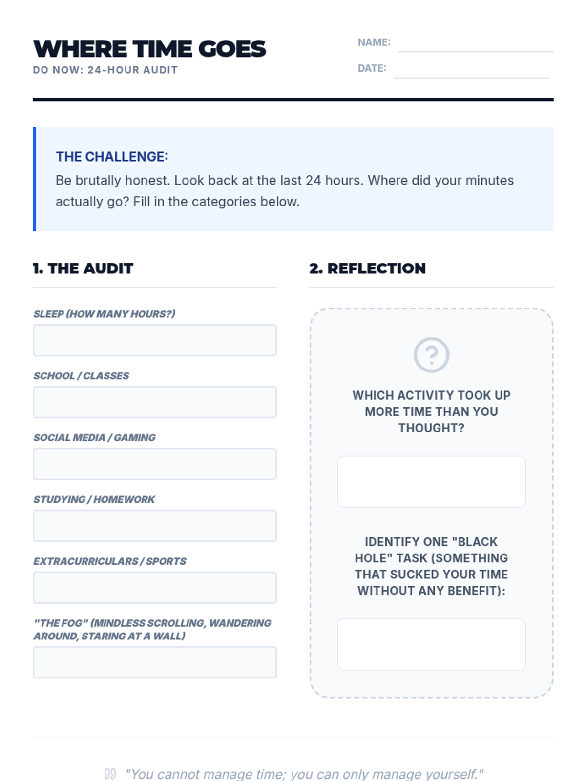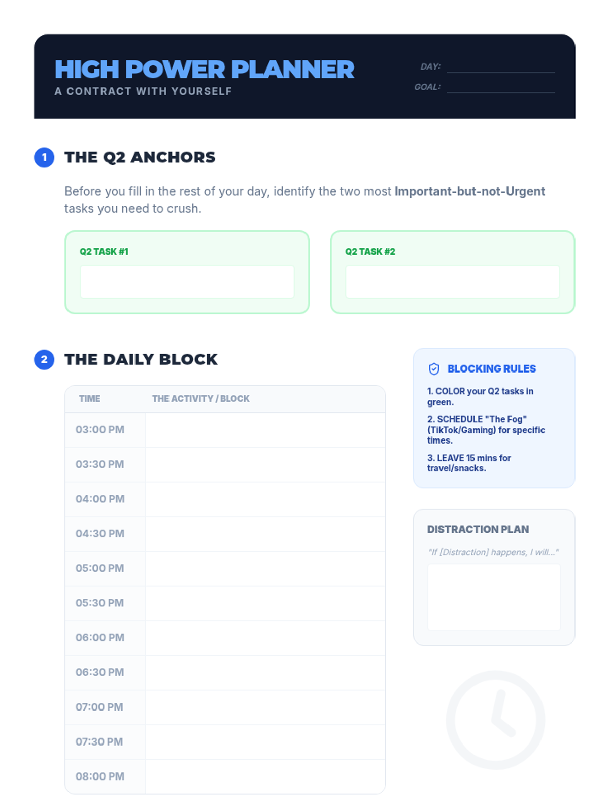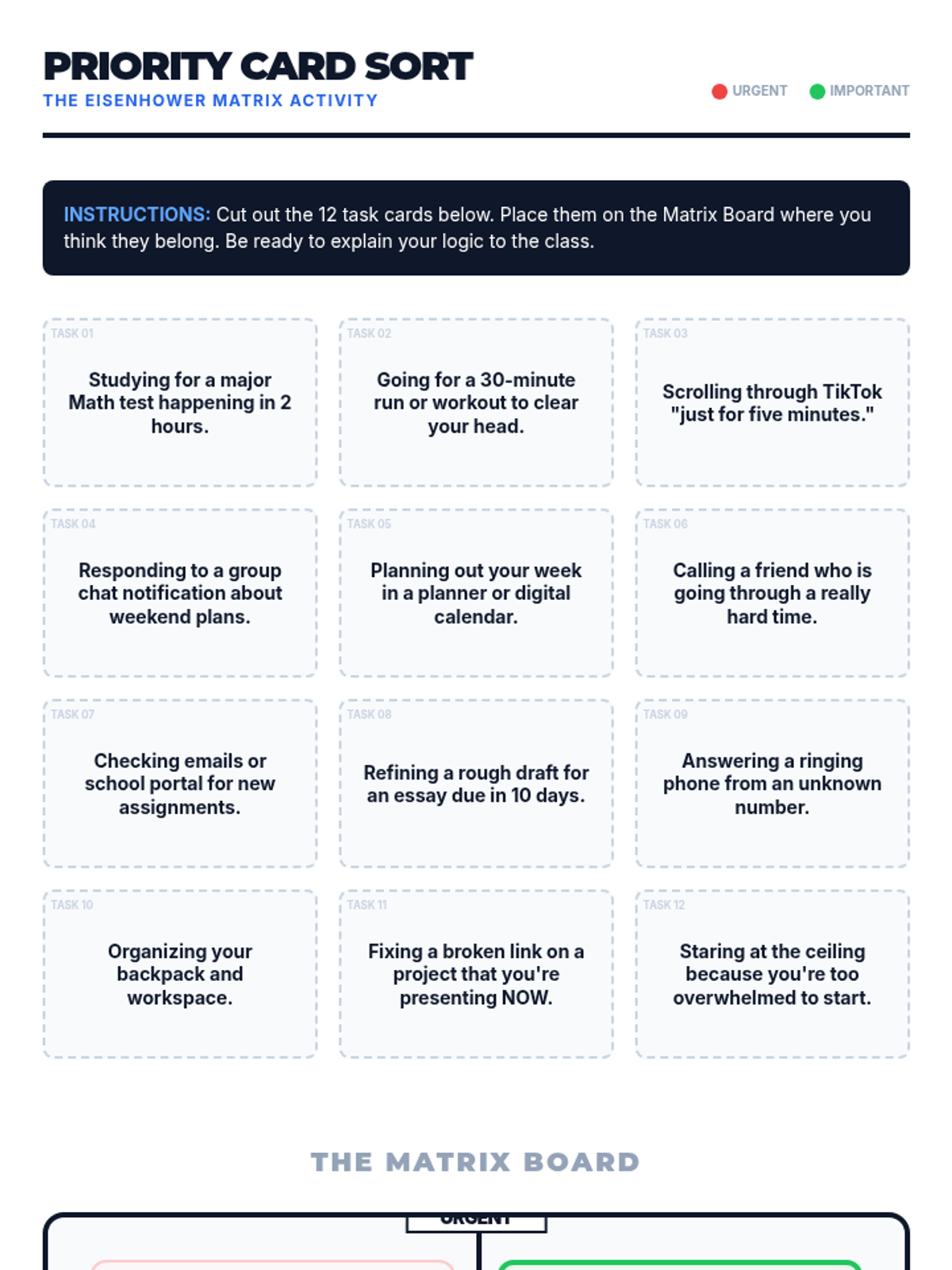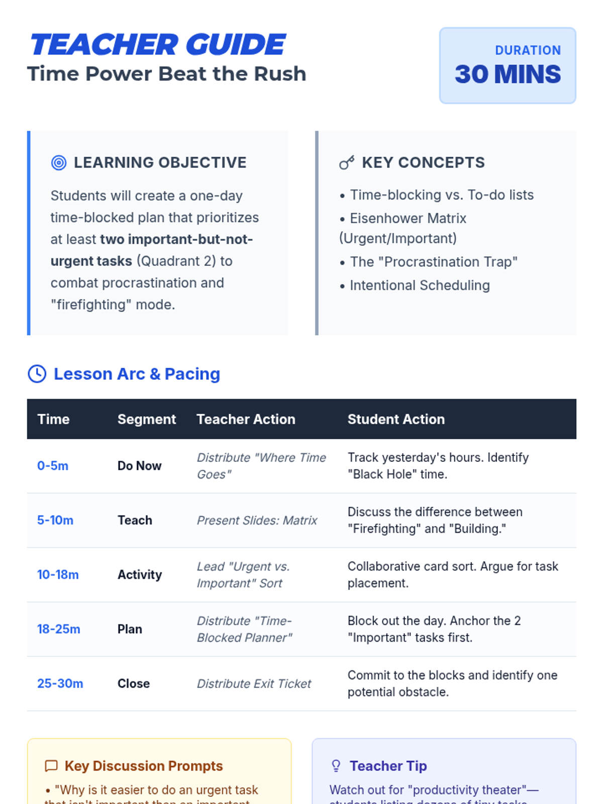A high-energy 30-minute lesson designed for 9th graders to master the art of time-blocking using the Eisenhower Matrix. Students will learn to distinguish between urgent and important tasks and create a concrete daily plan that prioritizes long-term goals over immediate distractions.