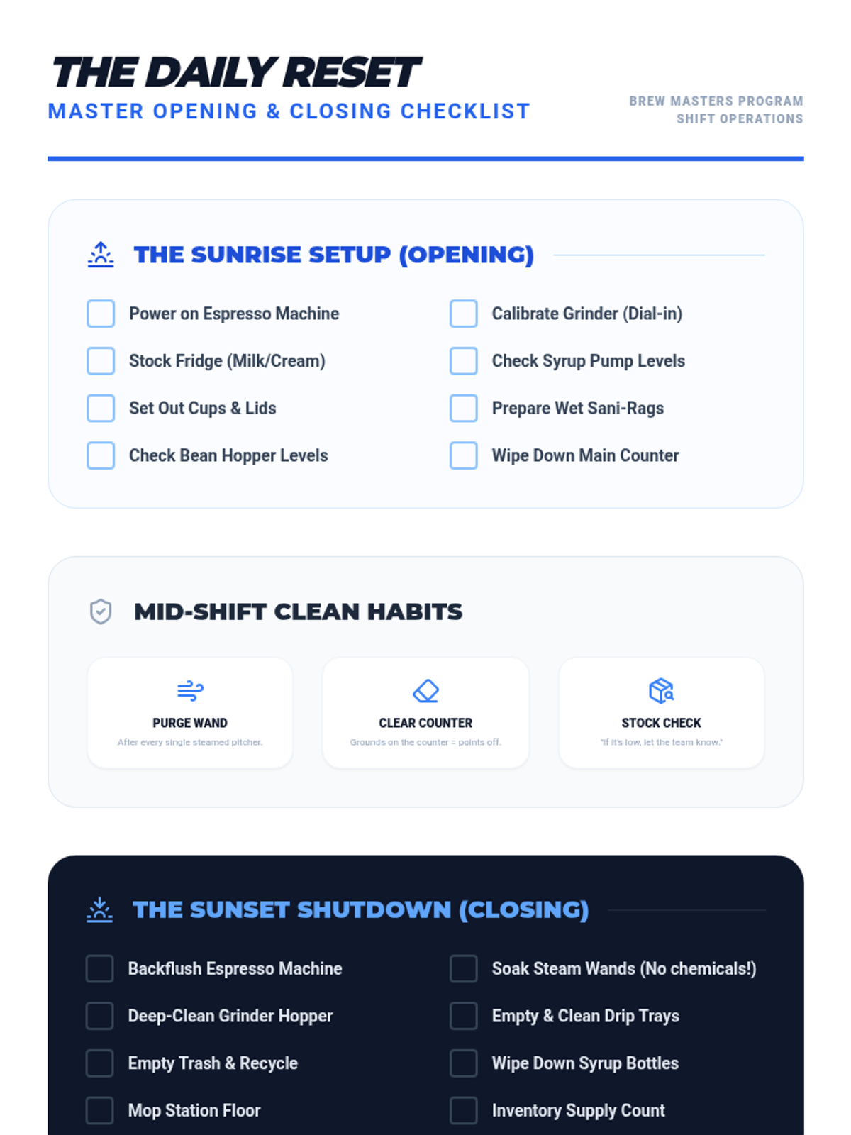 This lesson focuses on the critical 'bookends' of a cafe shift: opening setup and closing breakdown. Students learn to maintain equipment longevity, follow hygiene protocols, and ensure the station is always ready for the next crew.