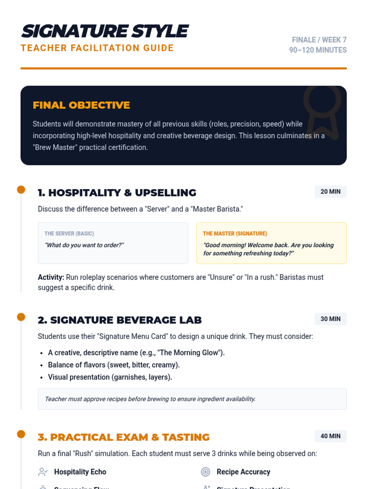 In this final lesson, students master the art of hospitality and 'signature' service. They learn how to suggest drinks to customers, handle complex scenarios with grace, and design their own signature beverage for the cafe menu.