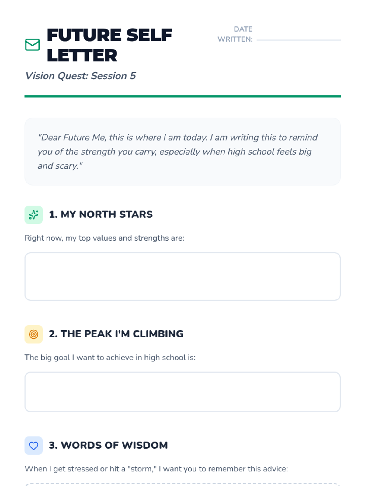 Students synthesize their learnings from the group, reflect on their growth, and write a letter to their future selves to be opened after their first semester of high school.
