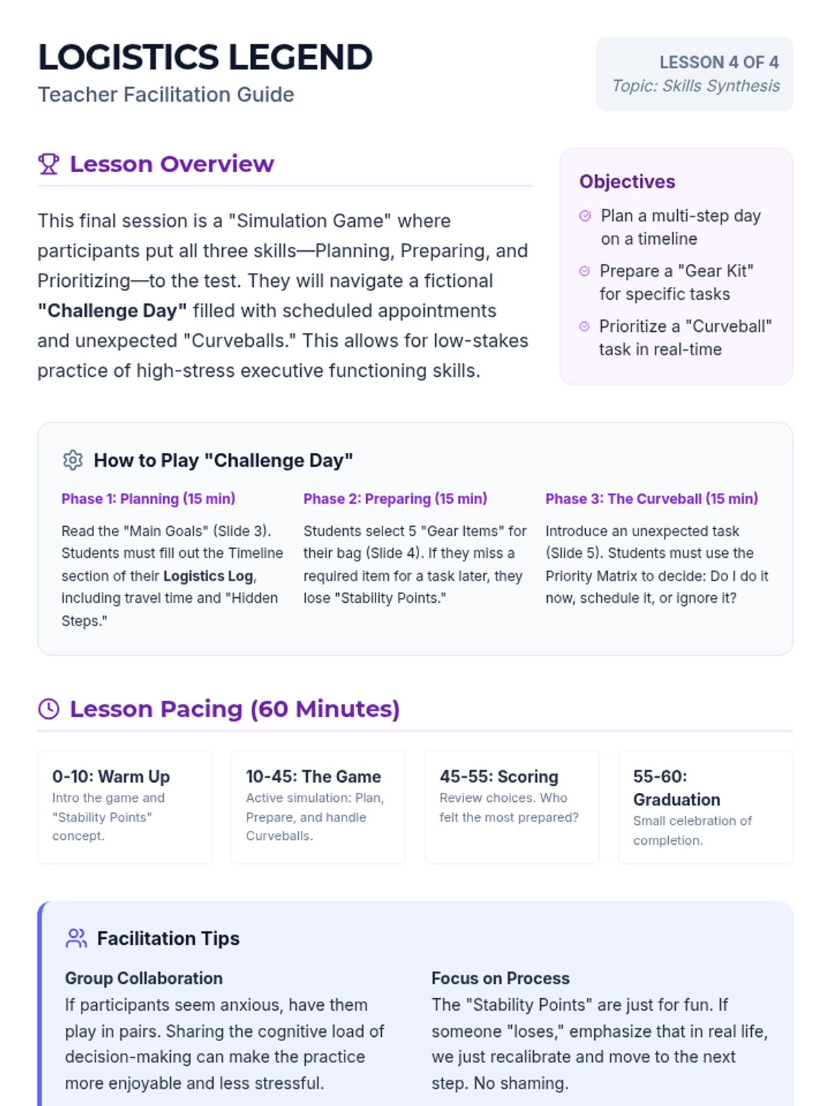 A high-energy, simulation-based session where participants apply planning, preparing, and prioritizing skills to navigate a series of realistic "Challenge Scenarios" in a game format.