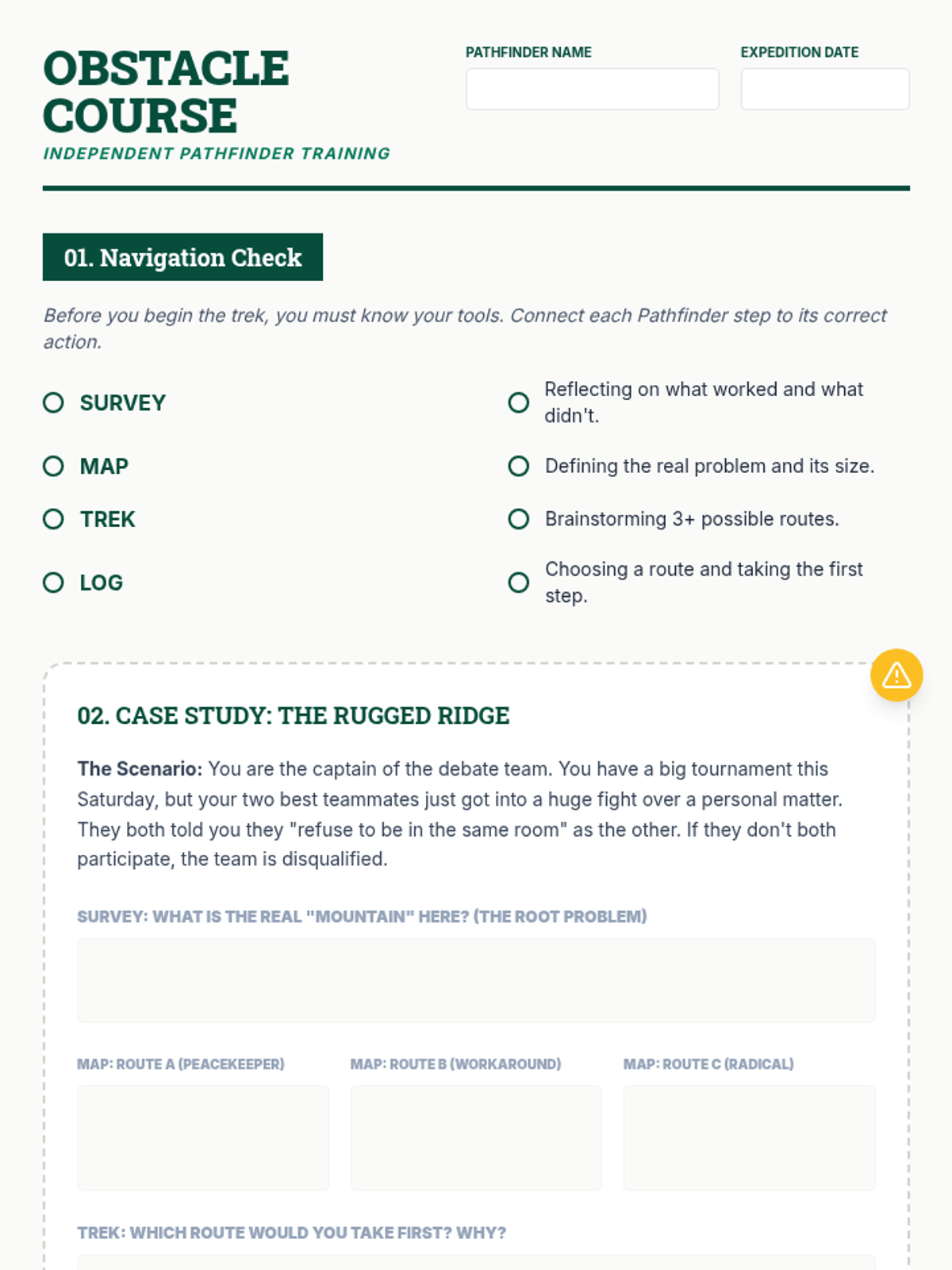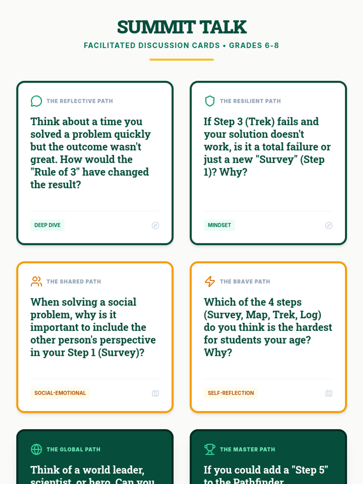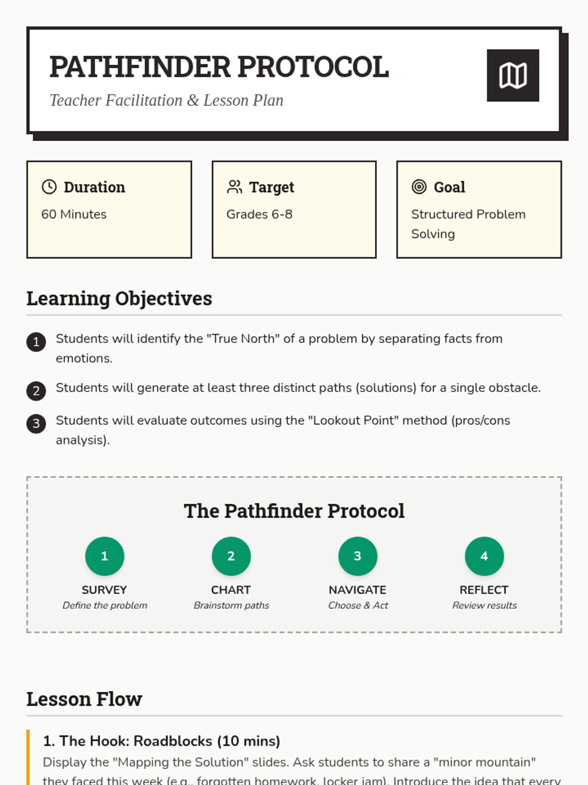 A comprehensive lesson for middle schoolers to master a structured problem-solving process using the 'Pathfinder Protocol', applicable to both social and academic challenges.