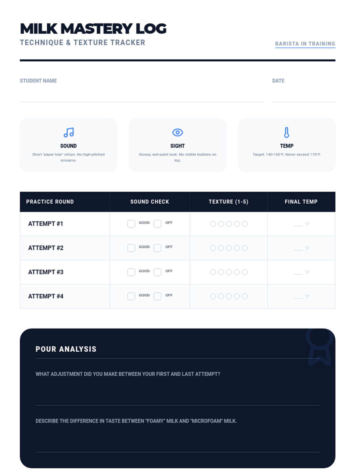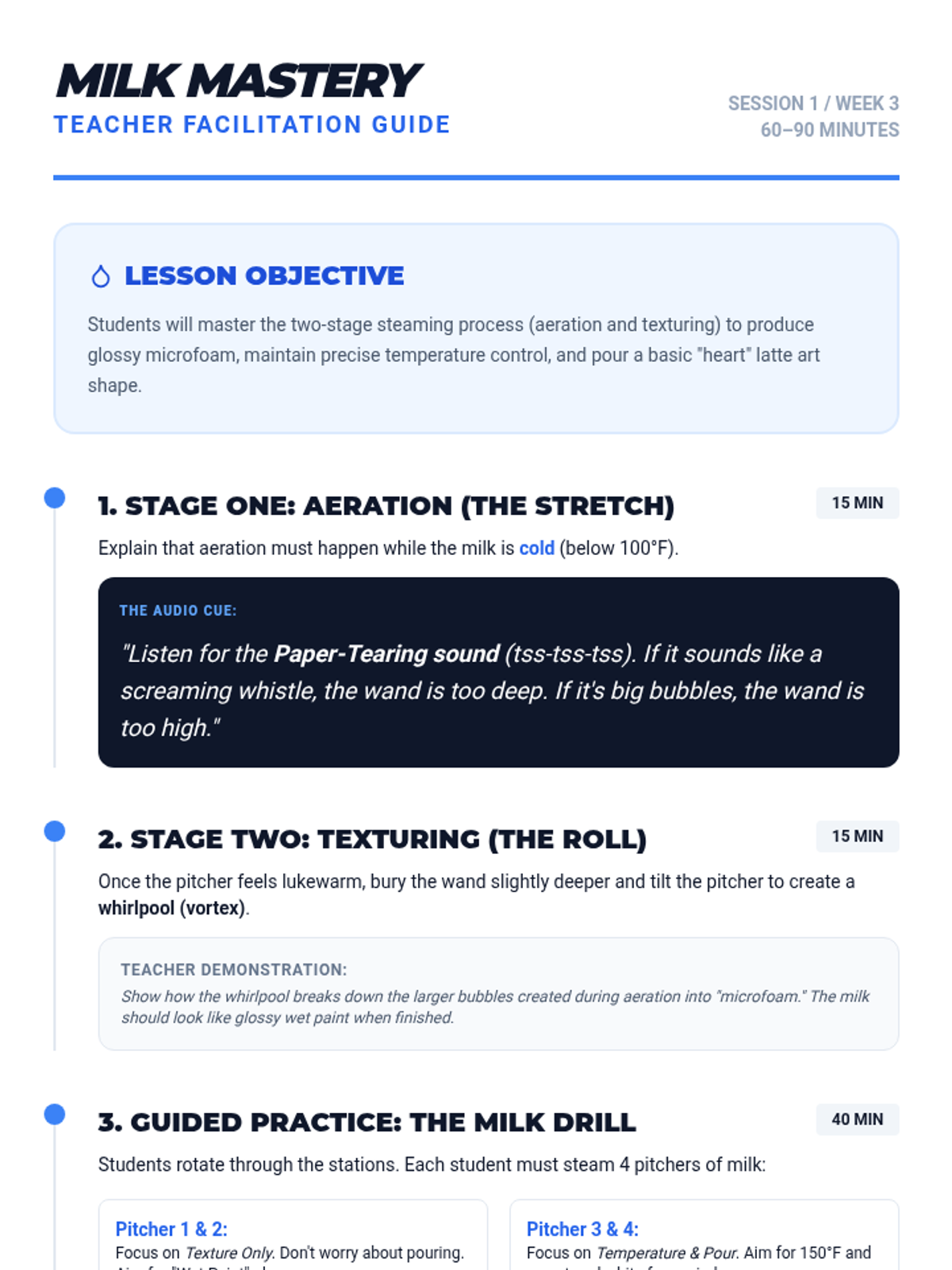 This lesson dives into the science and technique of milk steaming. Students learn to create perfect microfoam, master temperature control, and practice basic latte art to elevate the quality and presentation of every drink.