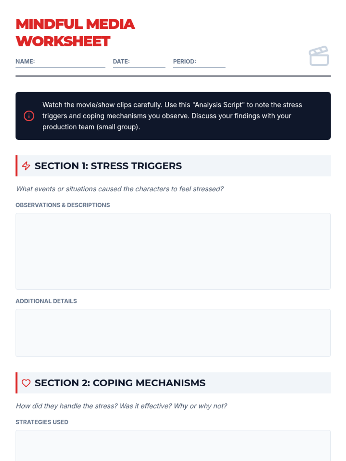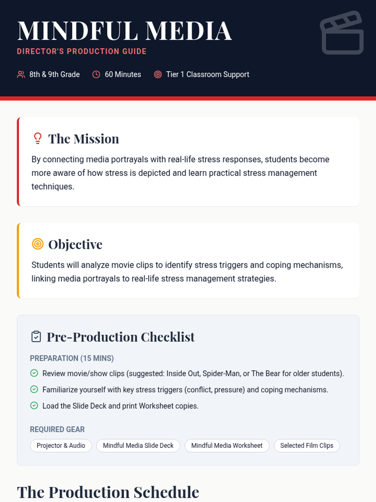 A lesson that explores stress triggers and coping mechanisms by analyzing popular media clips, helping 8th and 9th graders connect fictional portrayals to real-life stress management.