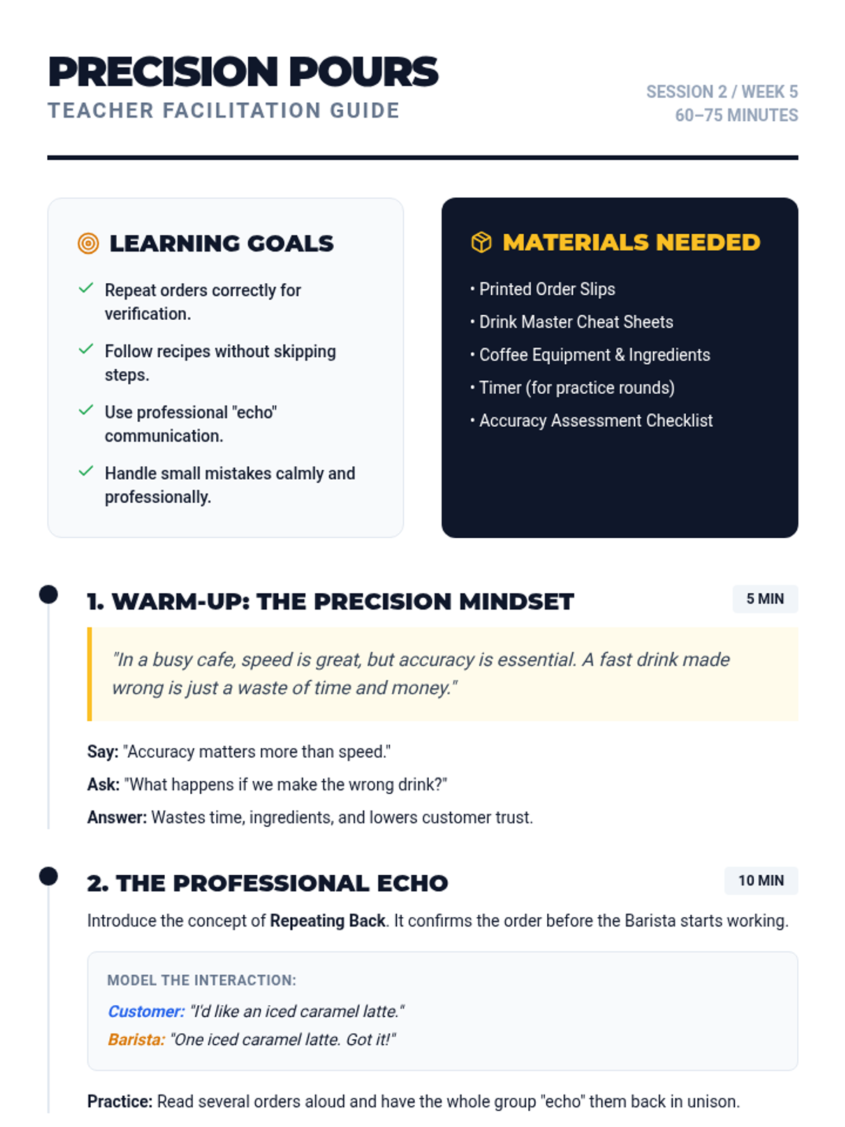 This lesson focuses on the technical accuracy of drink preparation and professional communication. Students learn to repeat orders for verification, follow recipes precisely, and handle mistakes with composure.