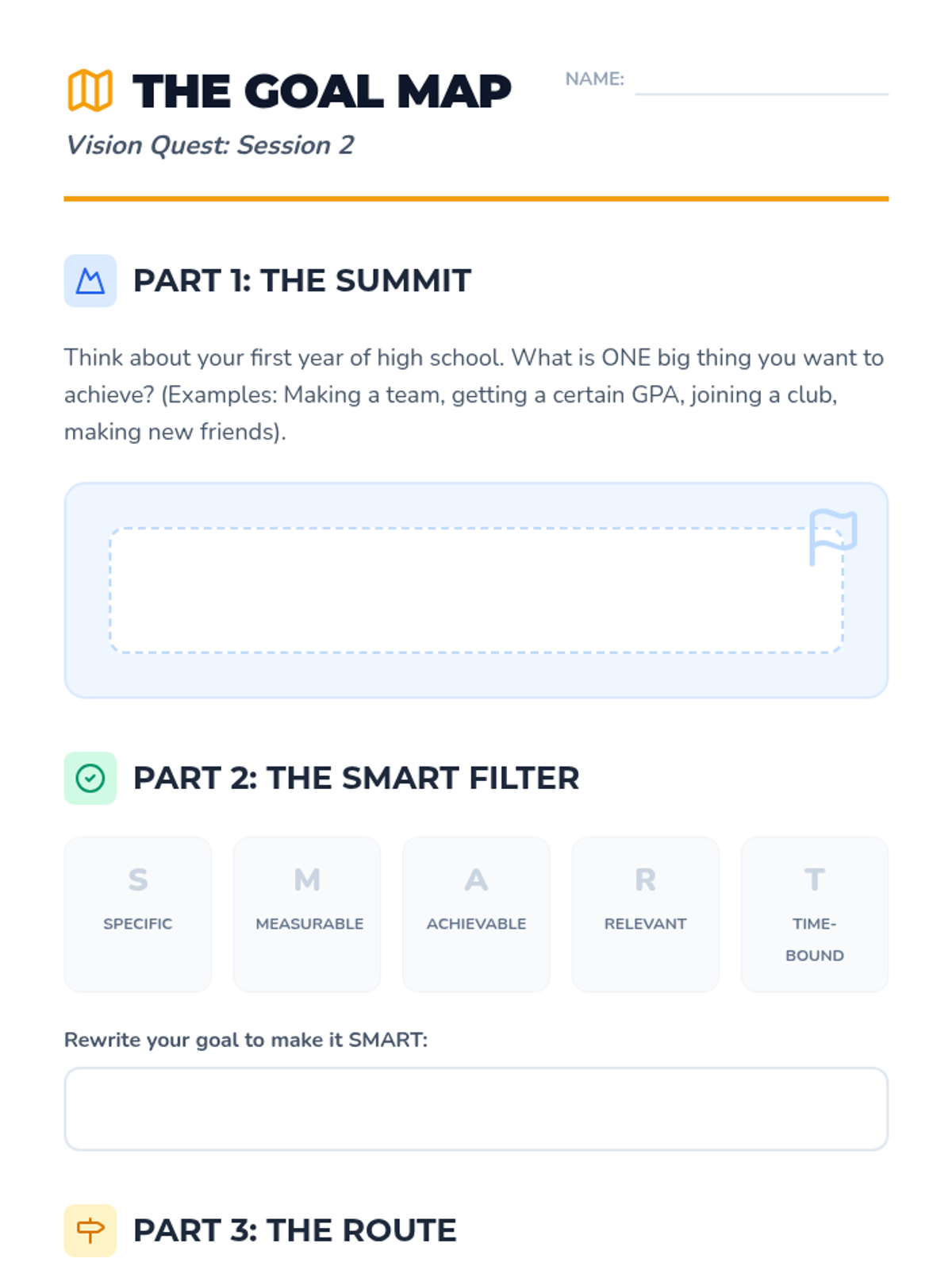 Students learn the SMART goal framework and visualize their long-term aspirations by mapping out smaller, actionable steps.
