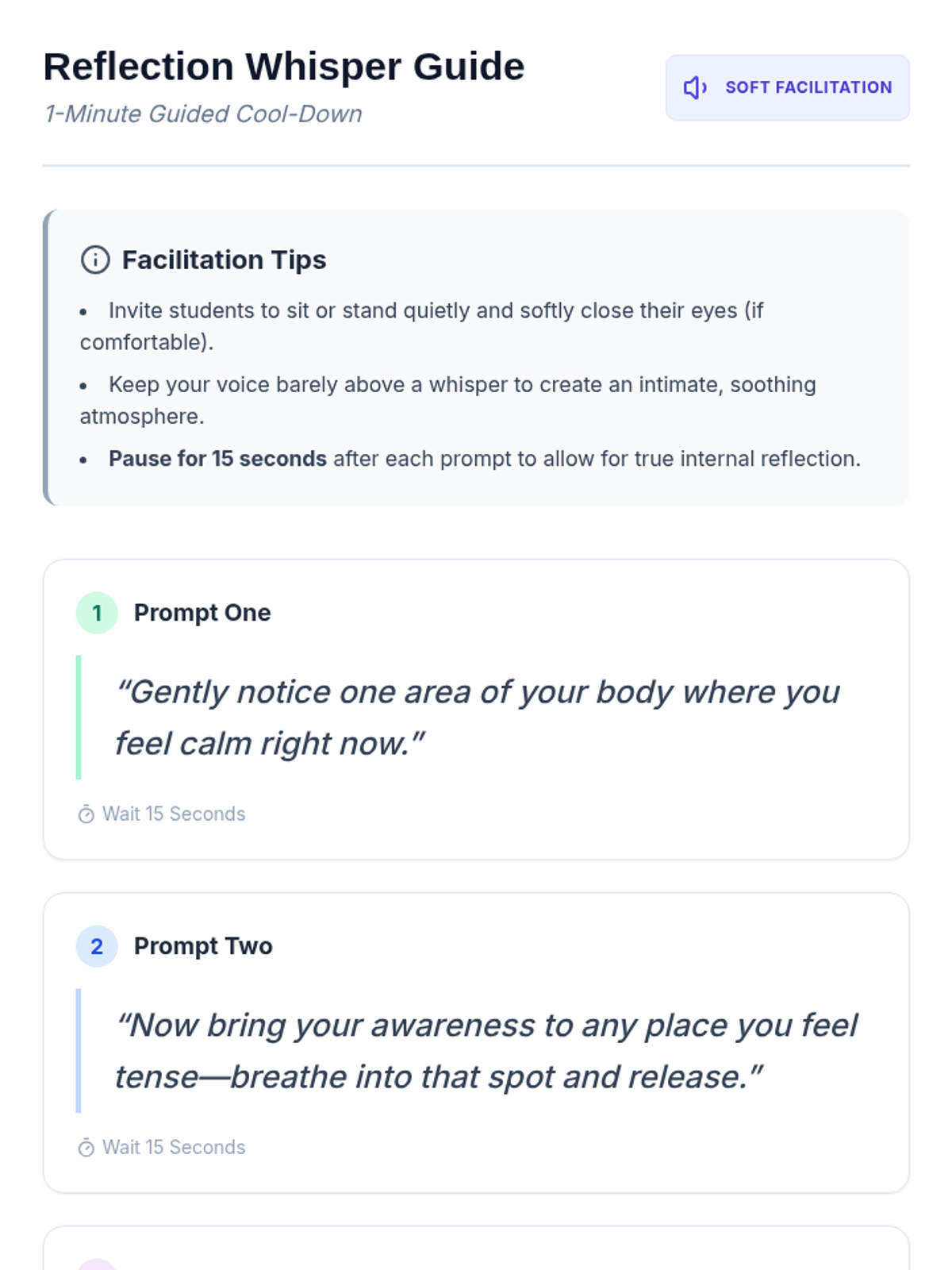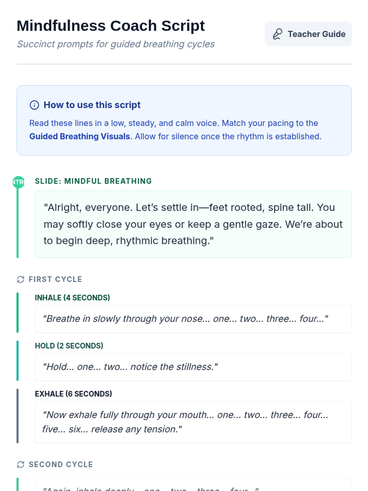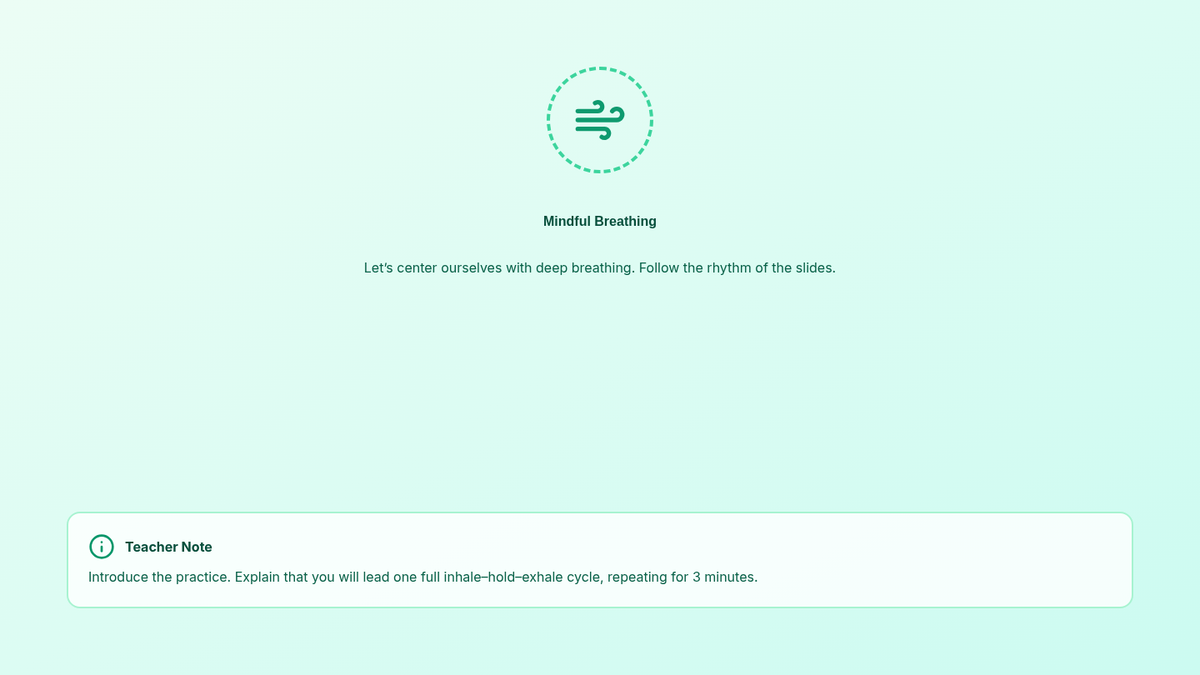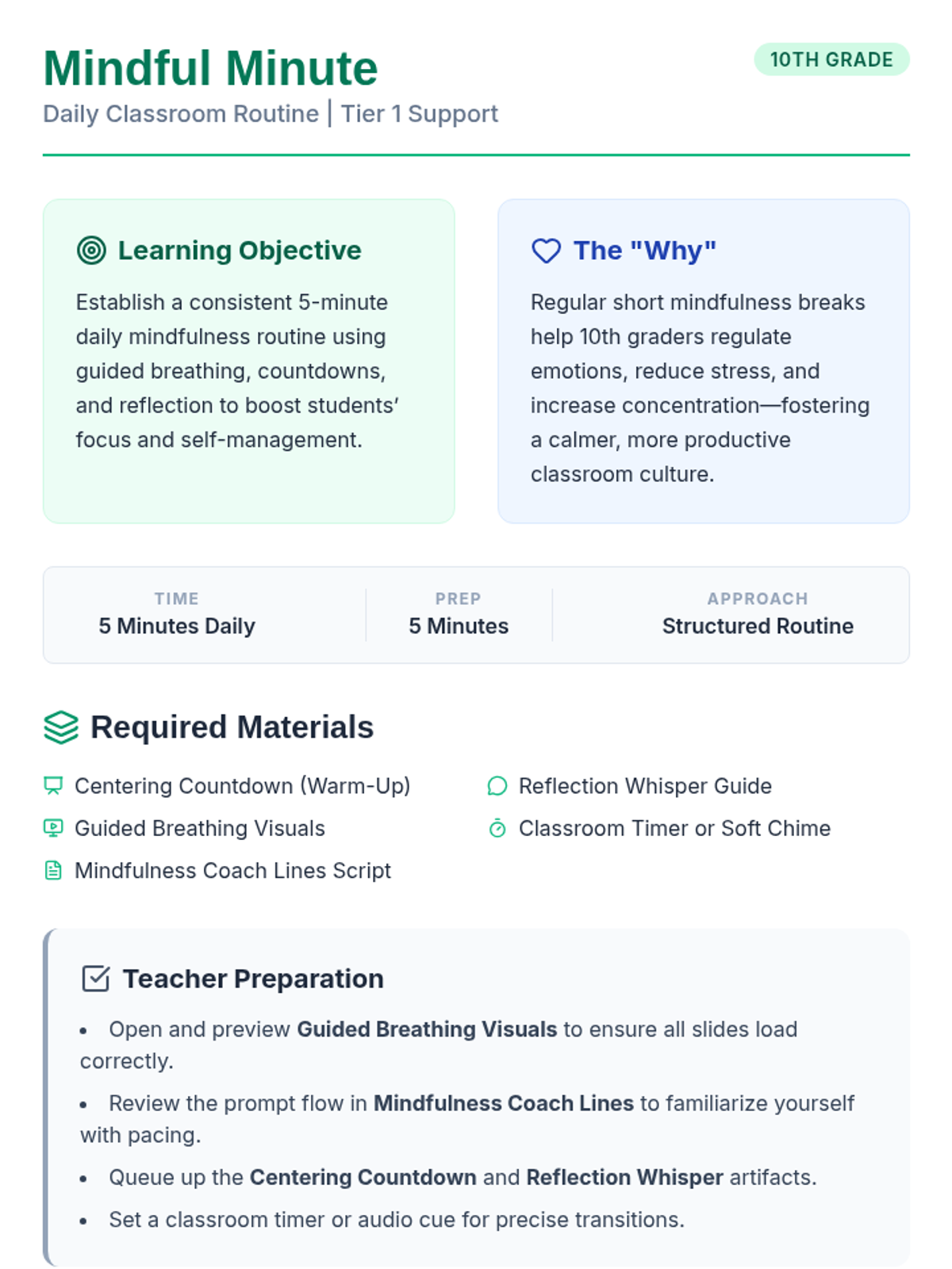 A quick 5-minute classroom routine designed for 10th graders to improve self-management and focus through guided breathing and reflection. This Tier 1 intervention fosters a calm learning environment and helps students transition into a productive mindset.