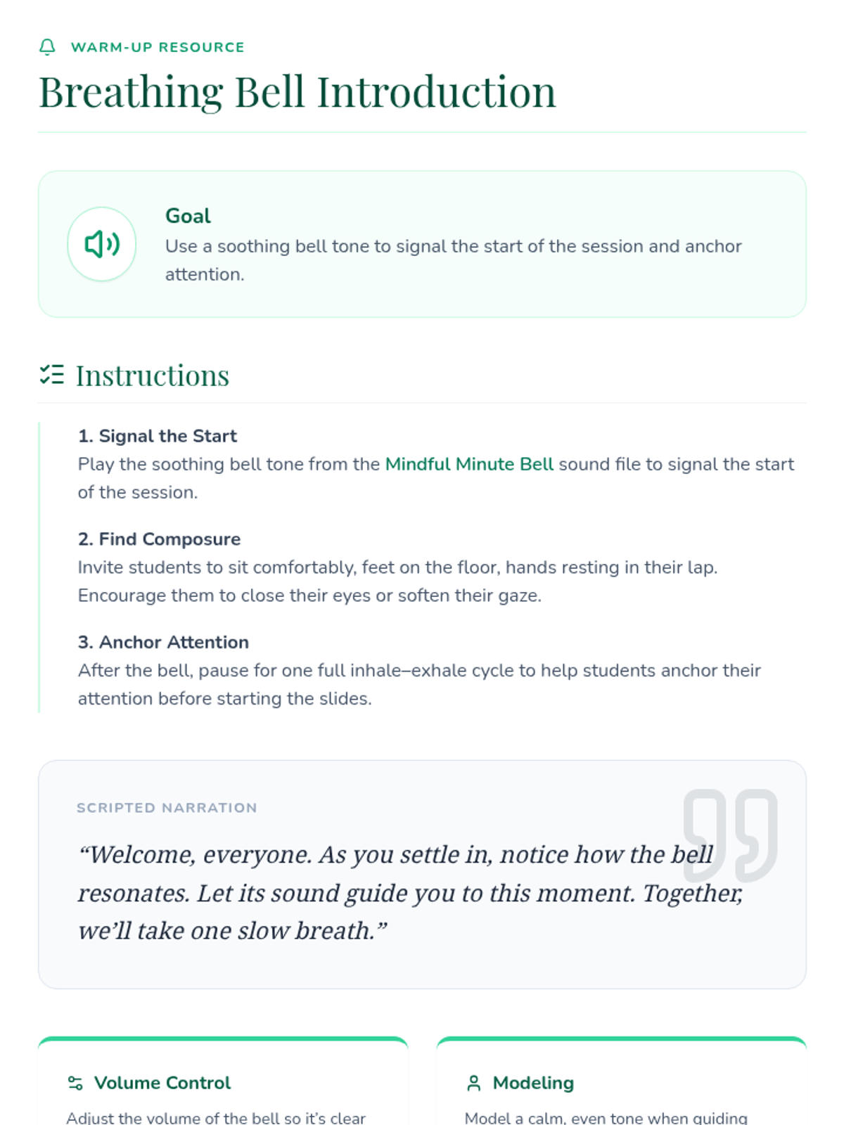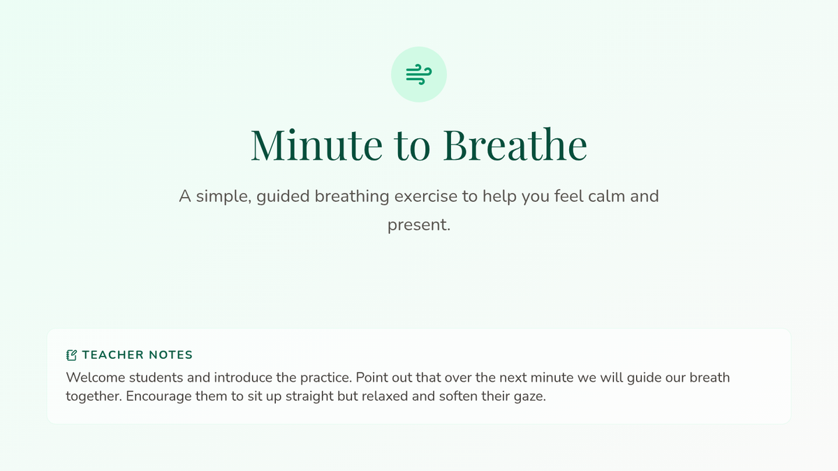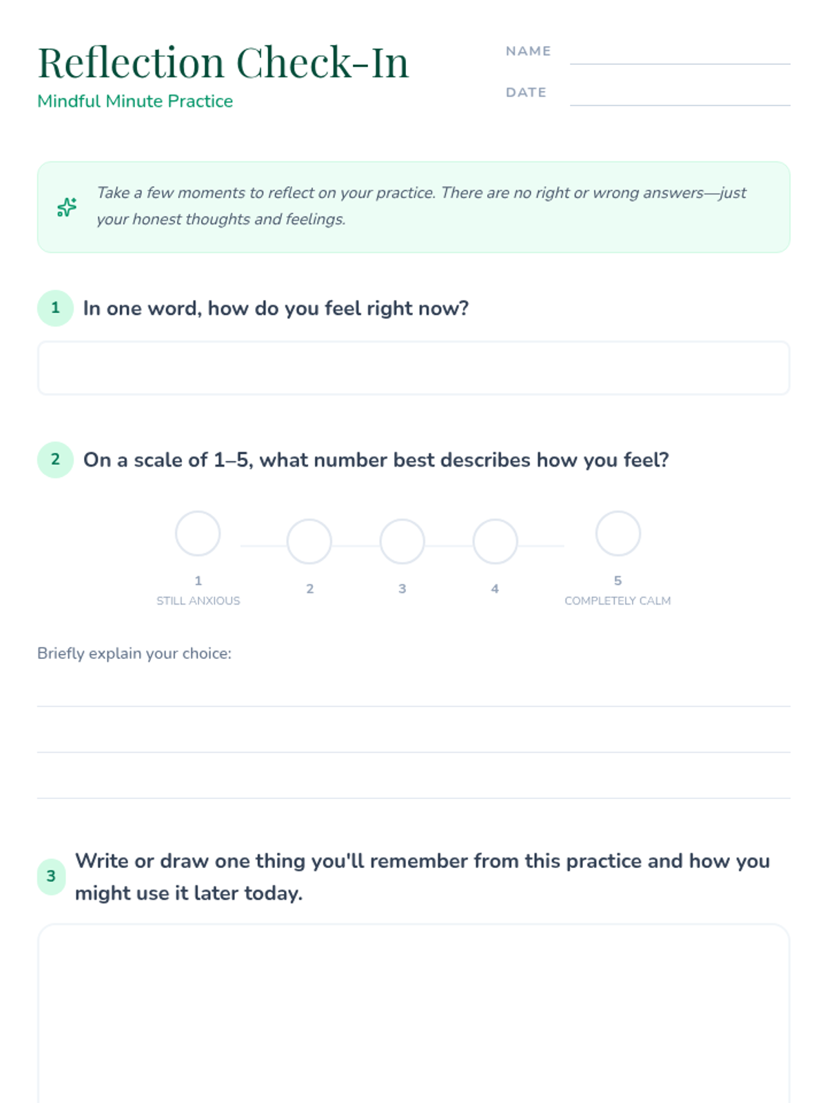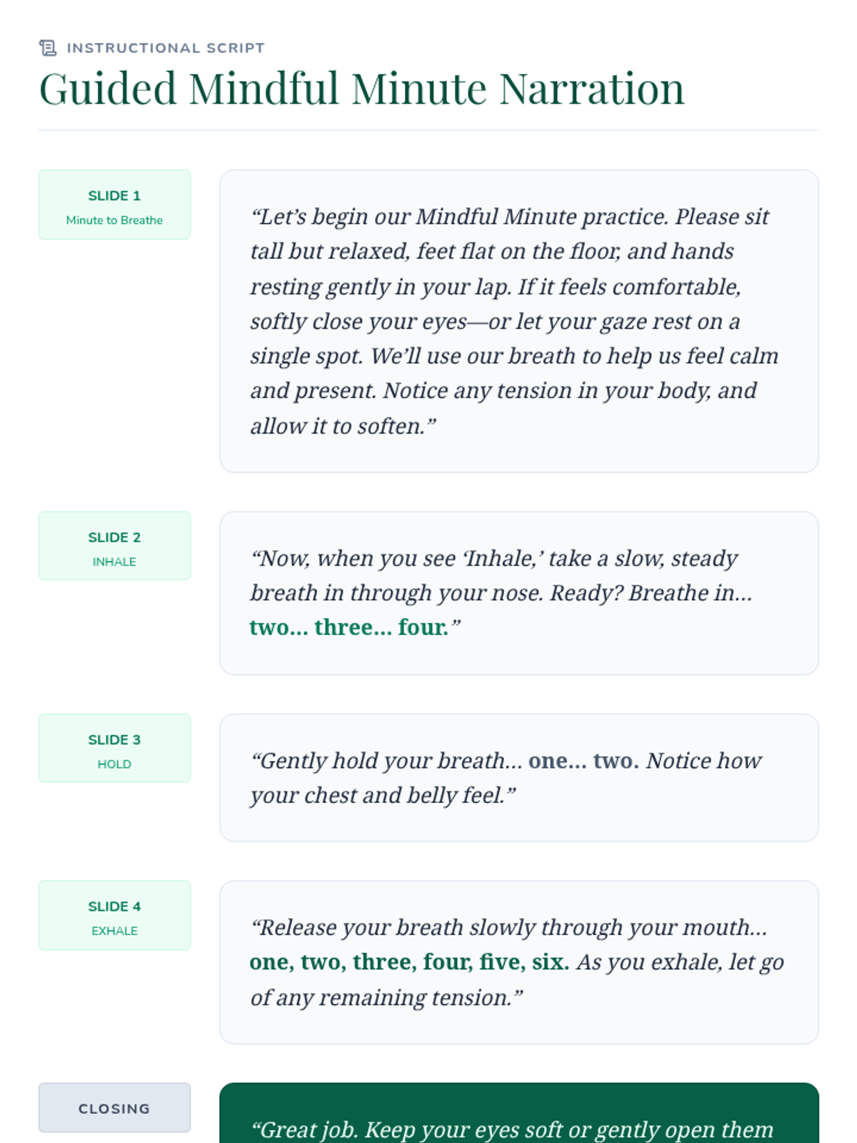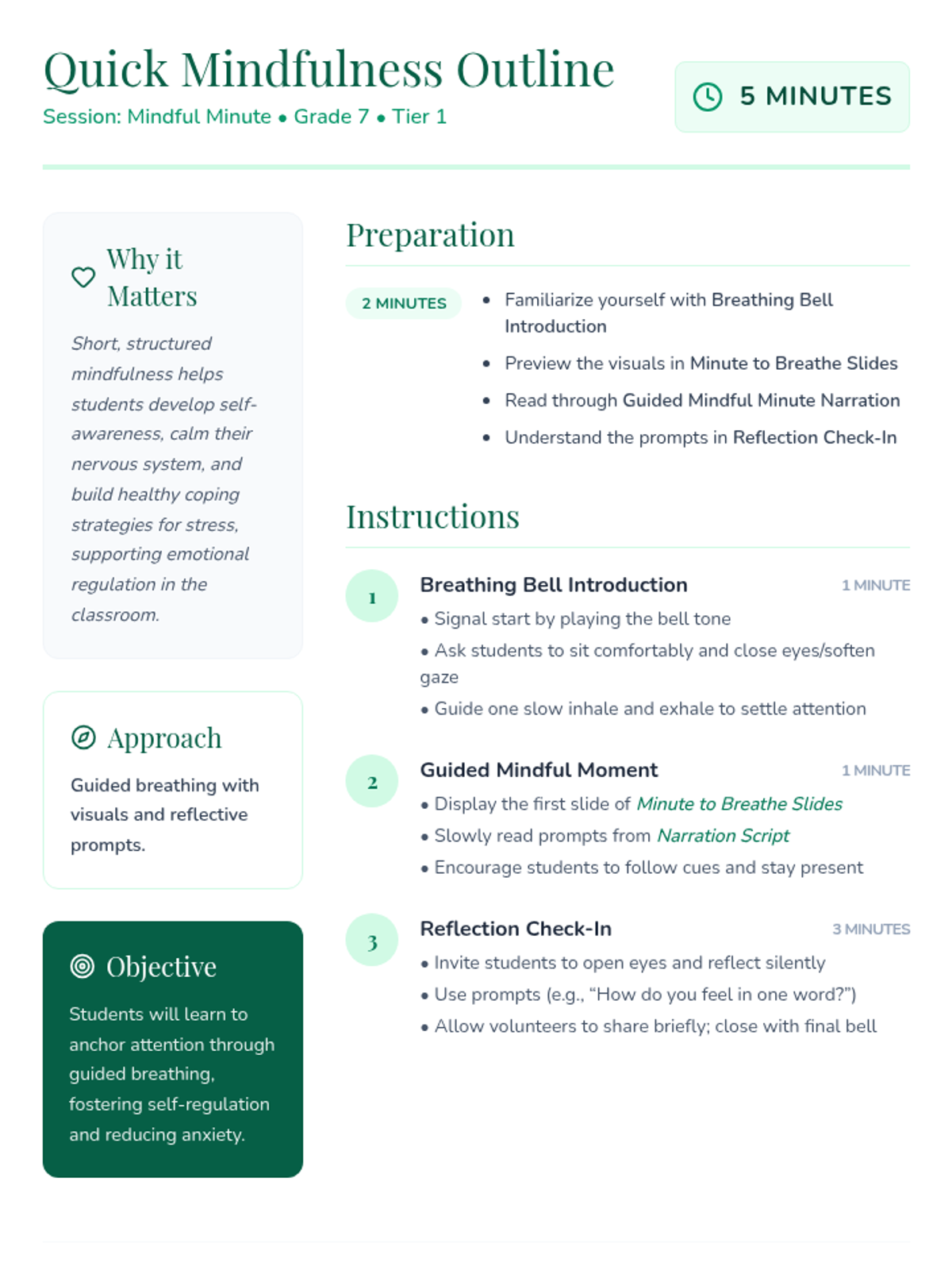 A concise 5-minute mindfulness practice for 7th-grade students to build self-regulation skills and reduce anxiety through guided breathing and reflection.
