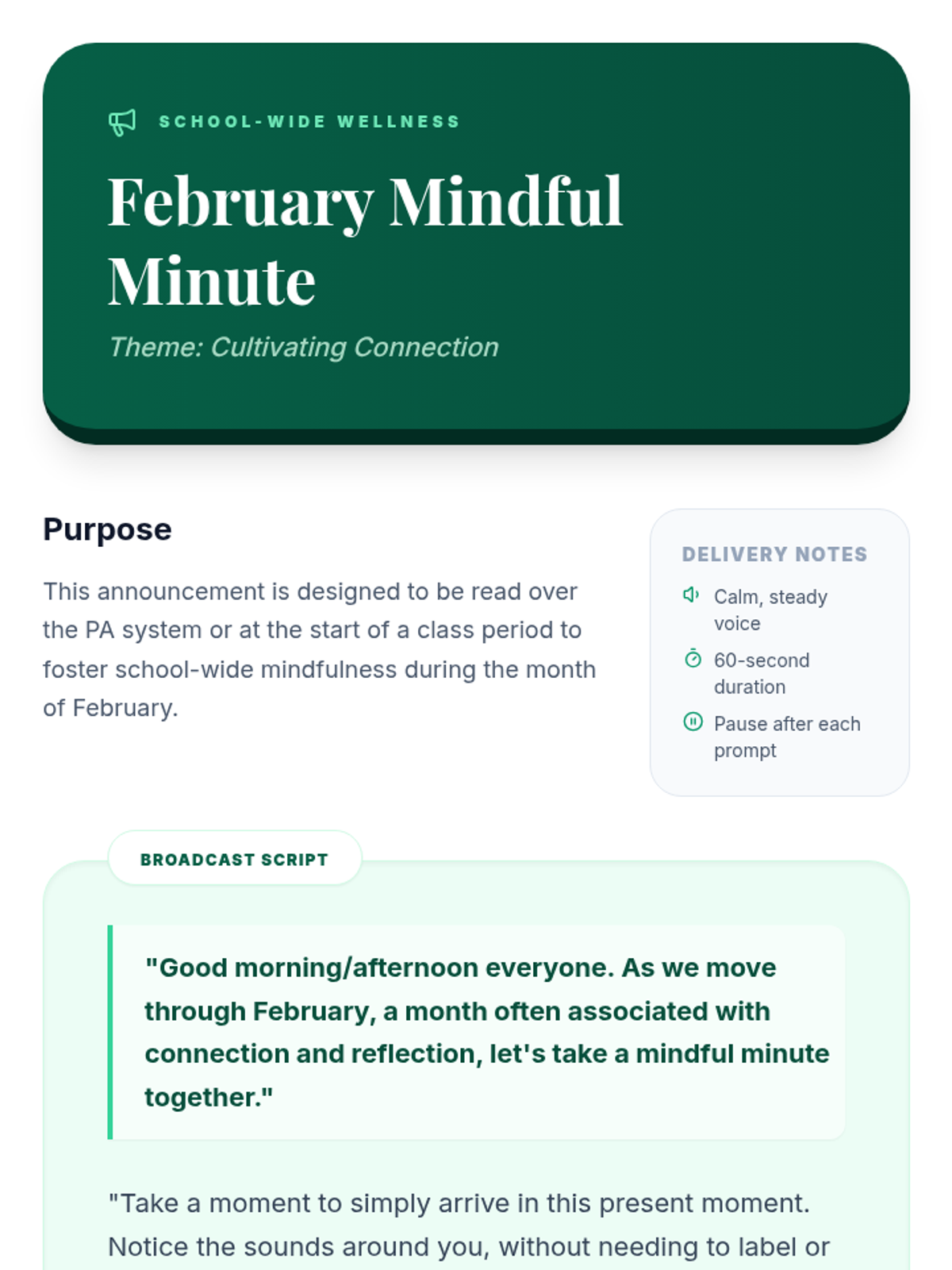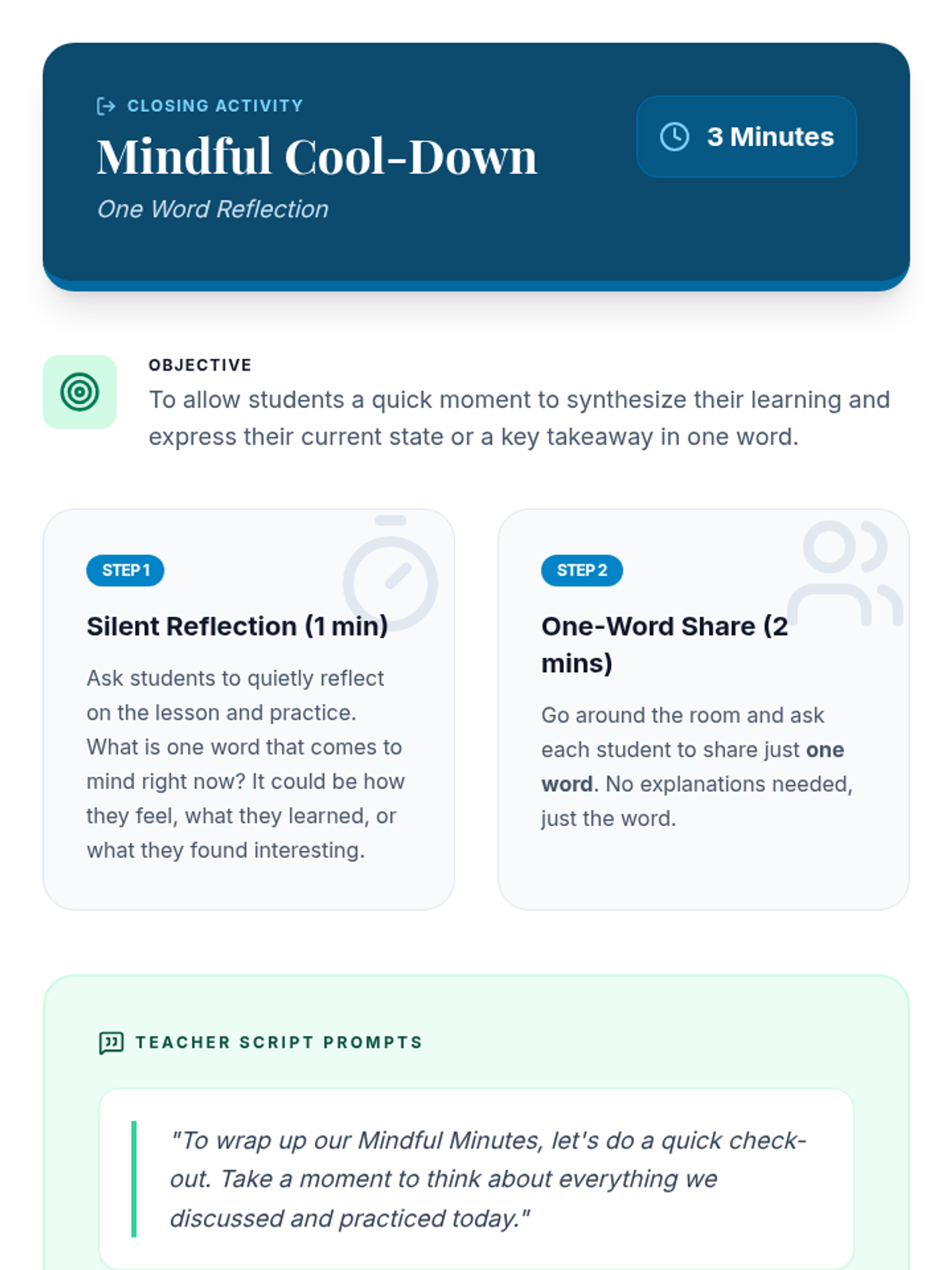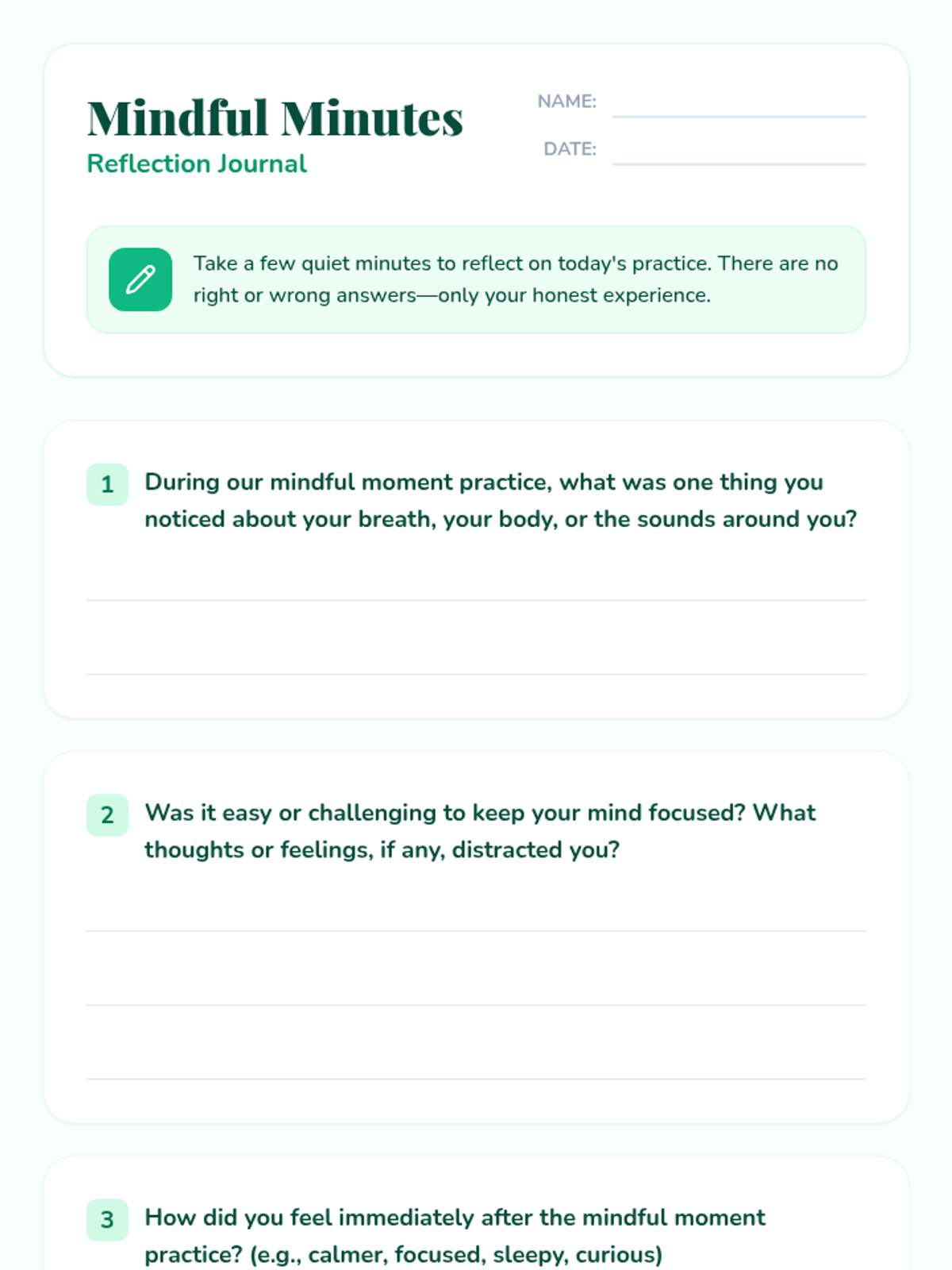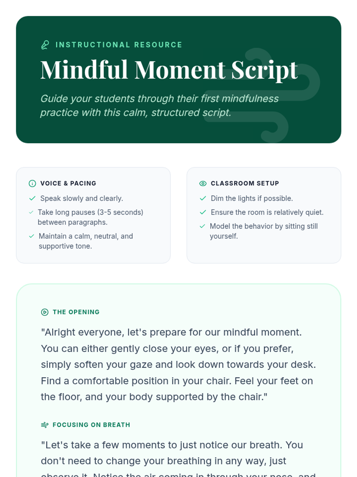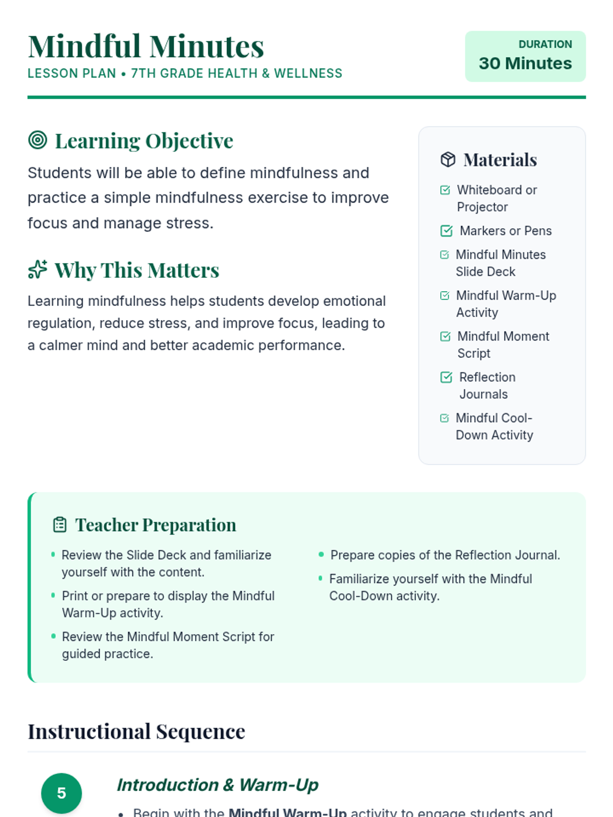 A 30-minute introductory mindfulness lesson for 7th graders, focusing on defining mindfulness, practical breathing exercises, and reflection to manage stress and improve focus.