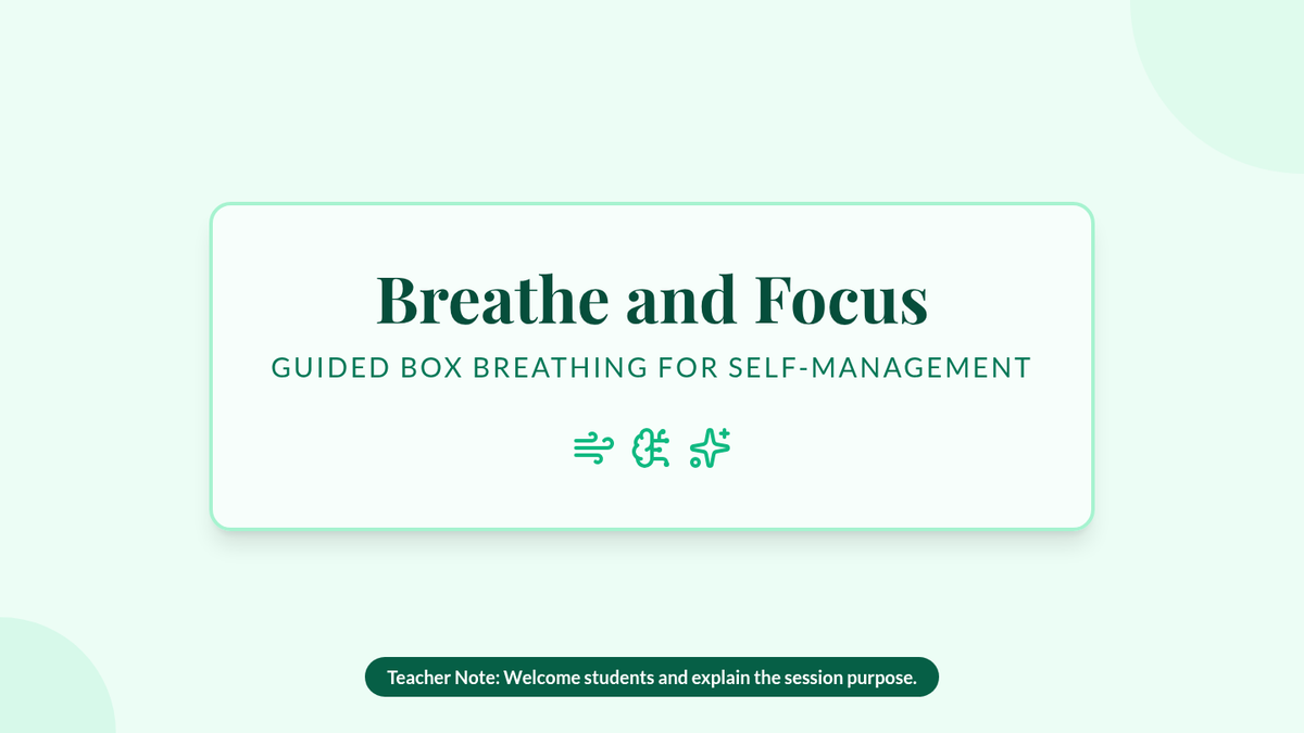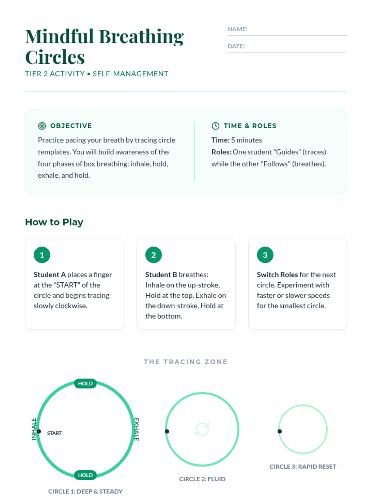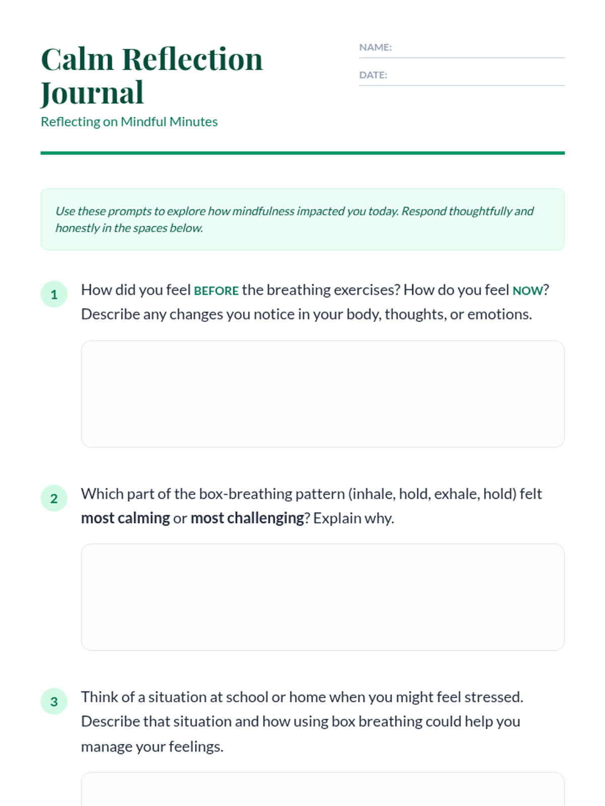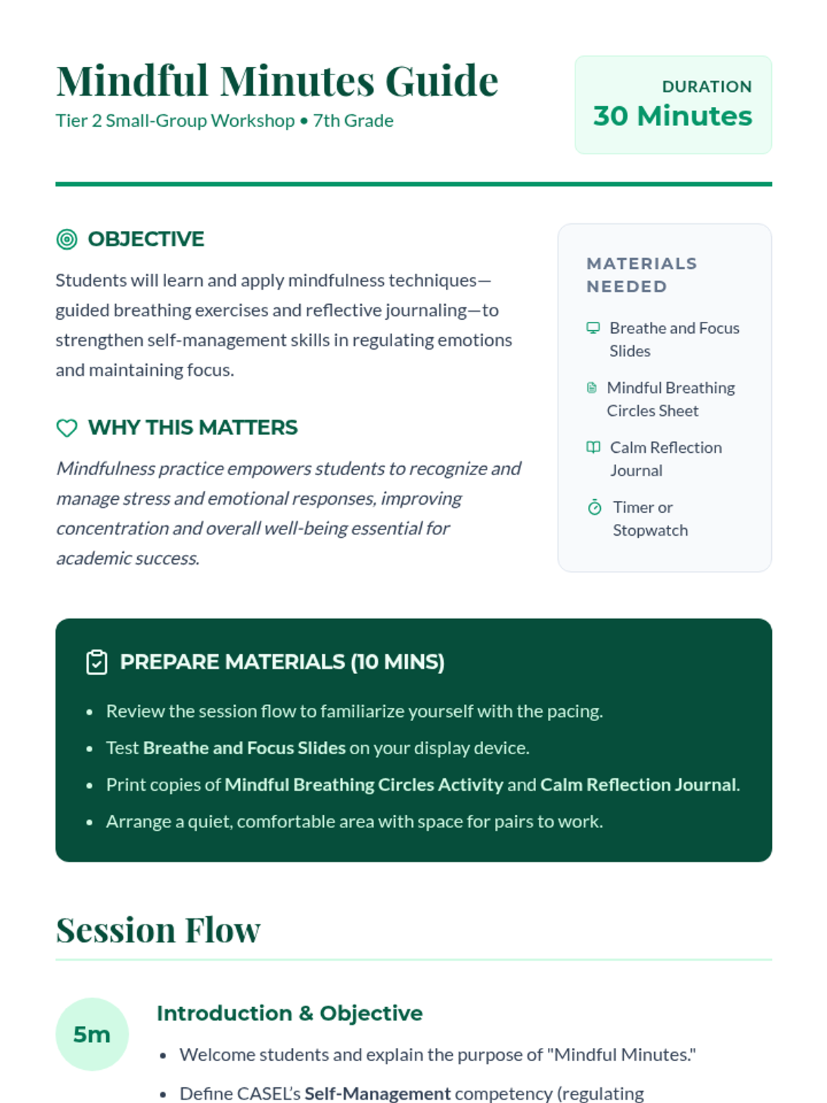 A 30-minute small-group workshop for 7th graders to practice box breathing and reflective journaling, focusing on CASEL's Self-Management competency to improve emotional regulation and focus.