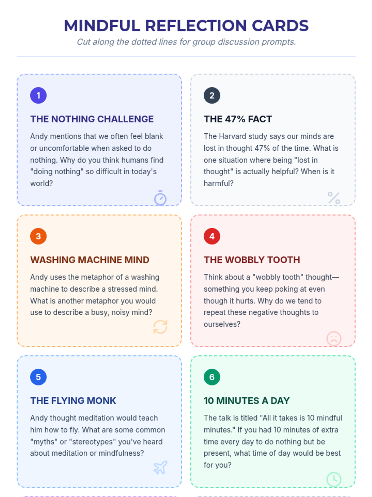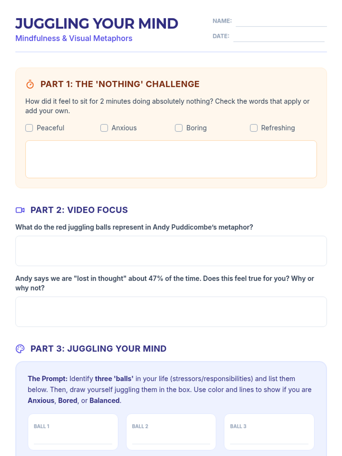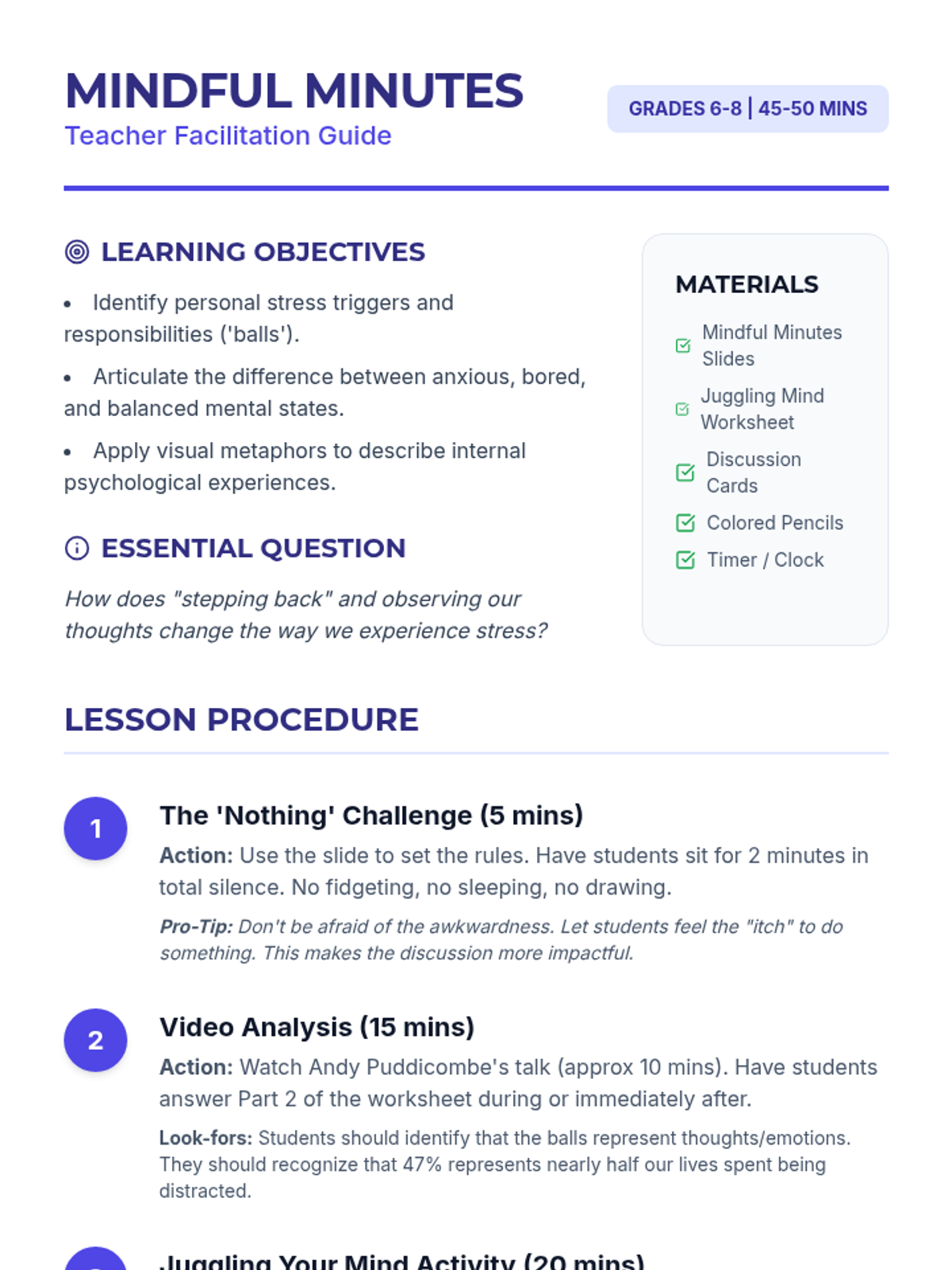 A mindfulness lesson for middle schoolers centered on Andy Puddicombe's TED Talk, focusing on identifying stress triggers and using visual metaphors like juggling to understand mental states.