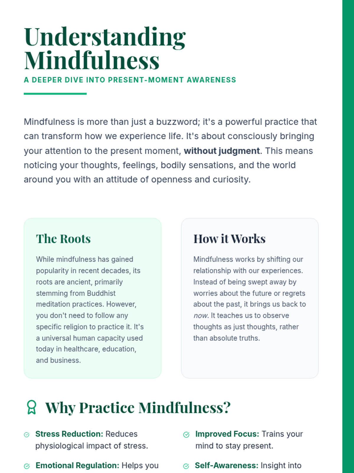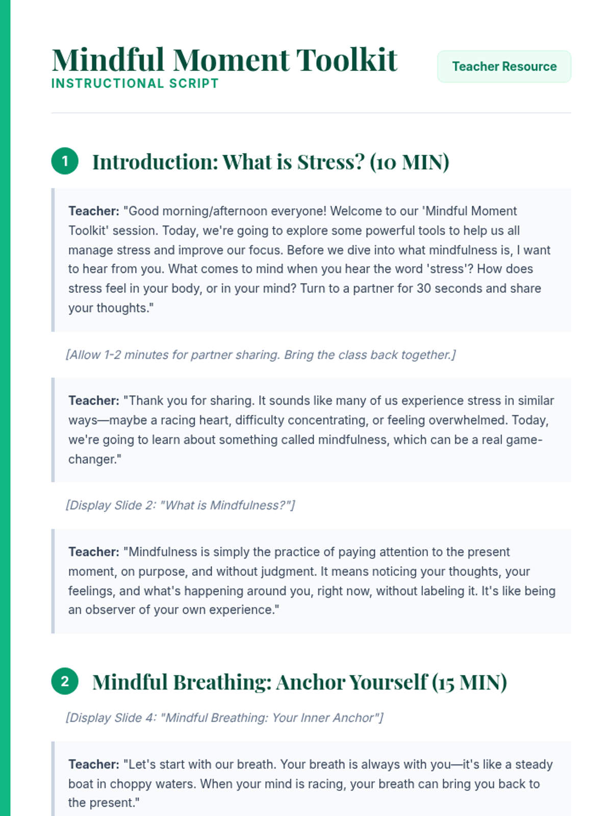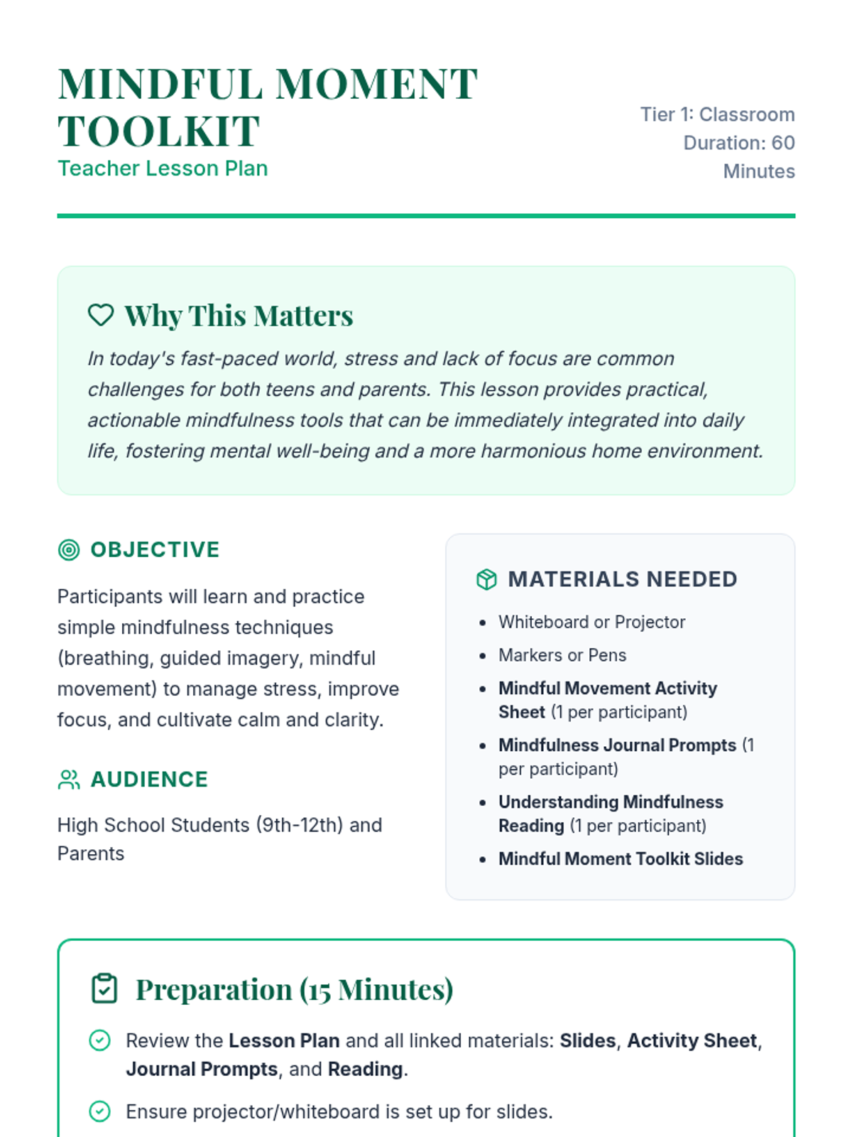 A 60-minute experiential lesson for high school students and parents to learn and practice mindfulness techniques like breathing, guided imagery, and movement for stress management.