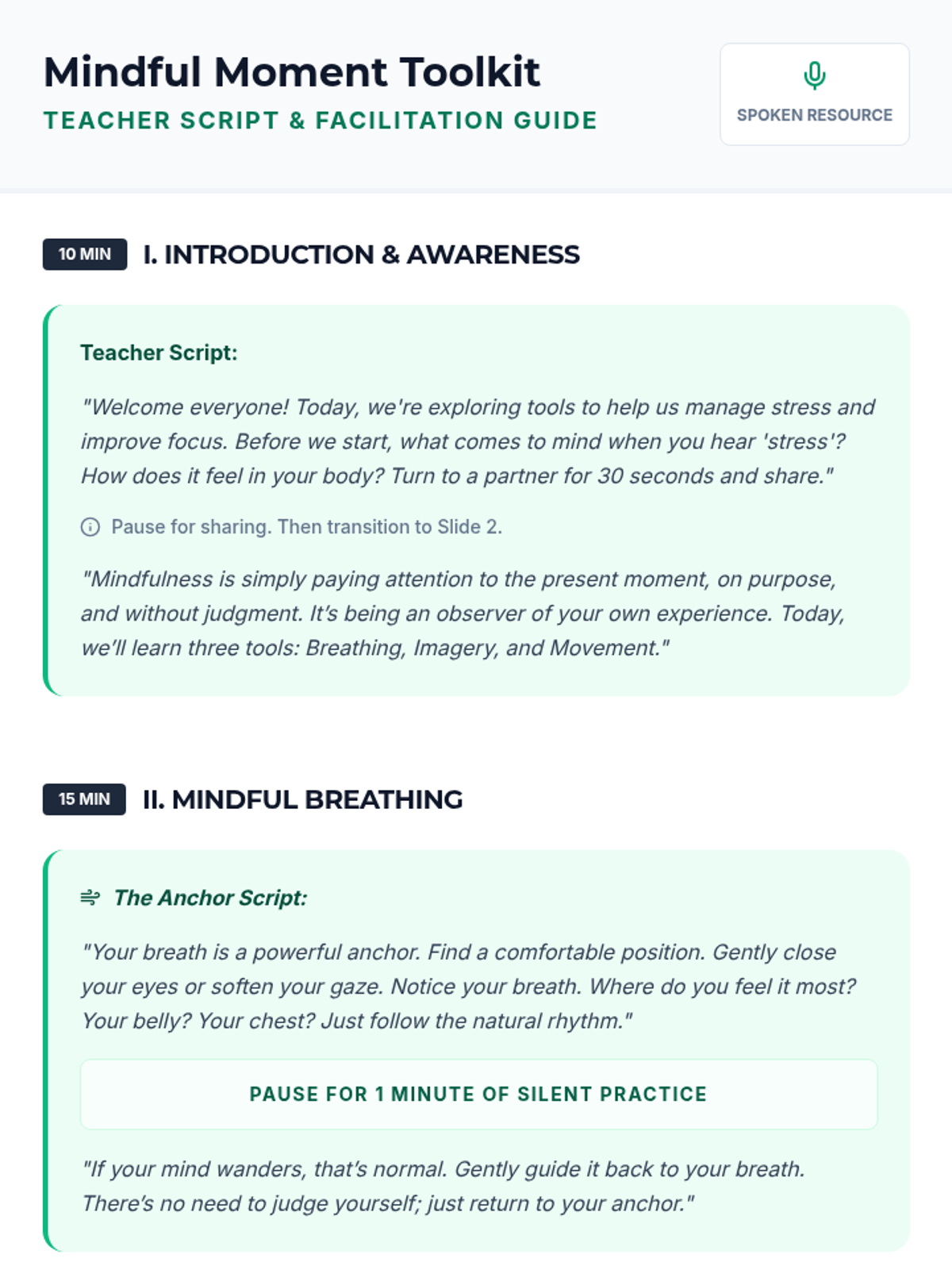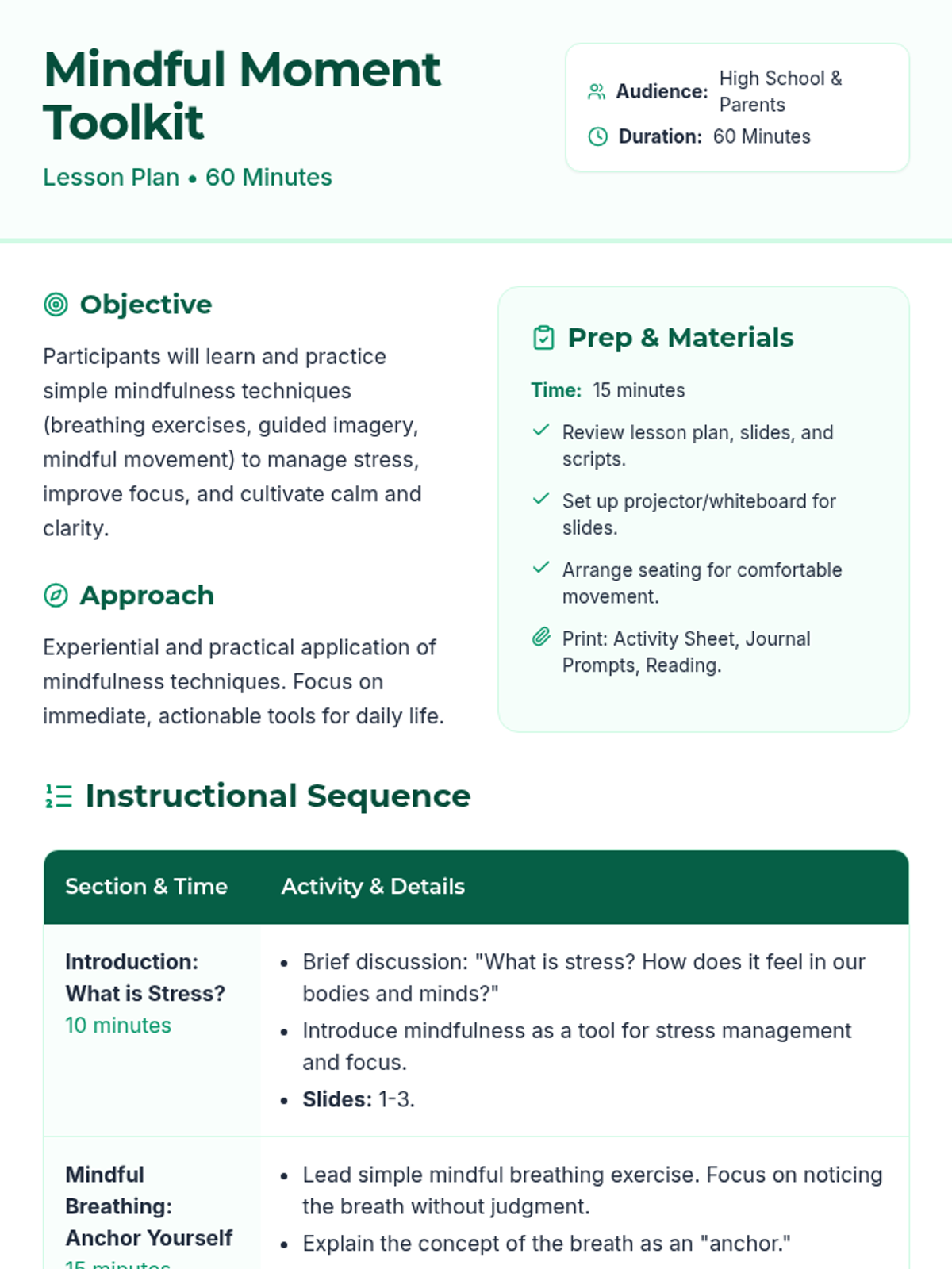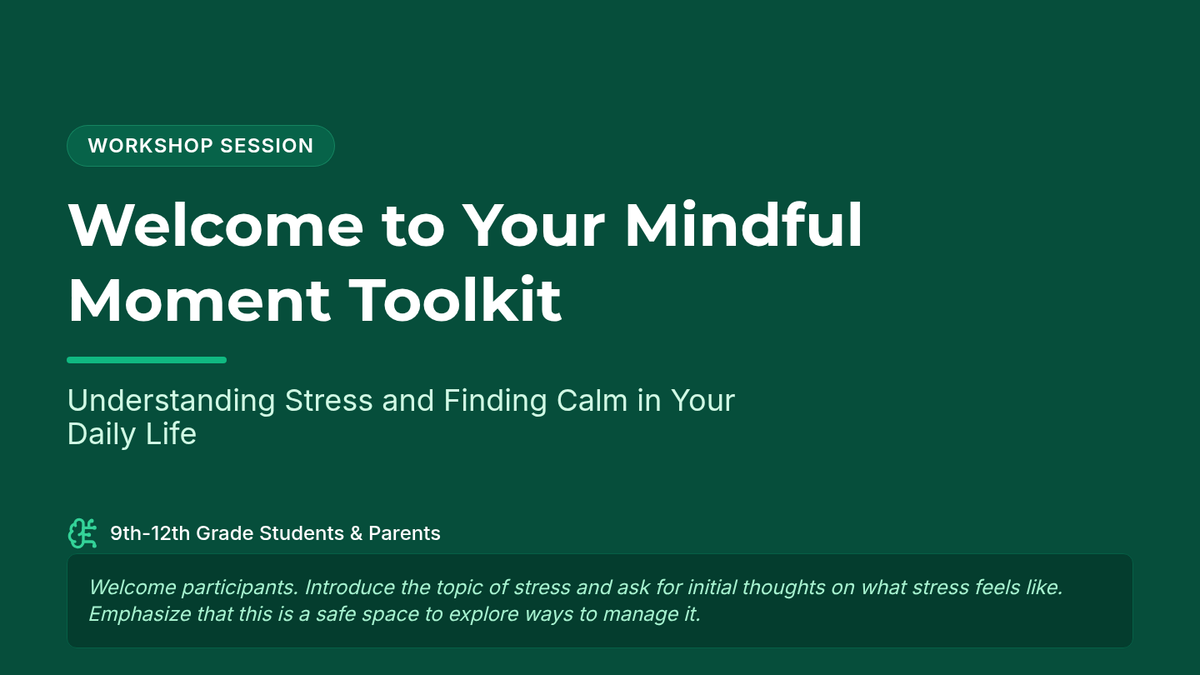 A 60-minute experiential session for high school students and parents focused on practical mindfulness techniques like breathing, imagery, and movement to manage stress and improve focus.