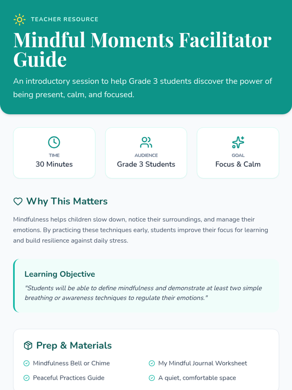 An introductory lesson for Grade 3 students to learn mindfulness techniques, breathing exercises, and emotional regulation strategies to improve focus and manage stress.