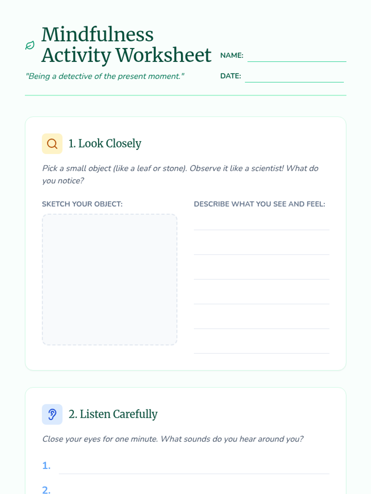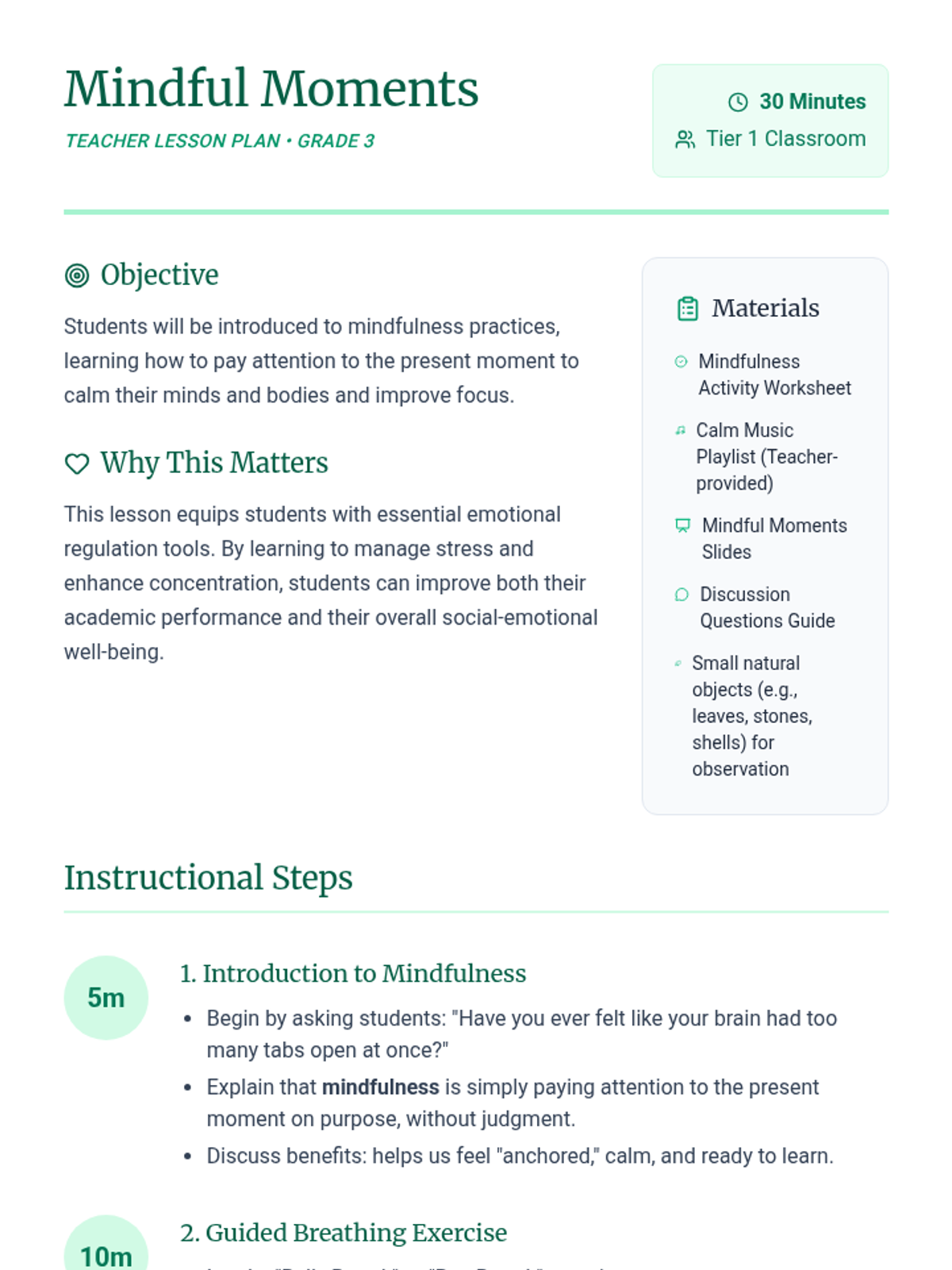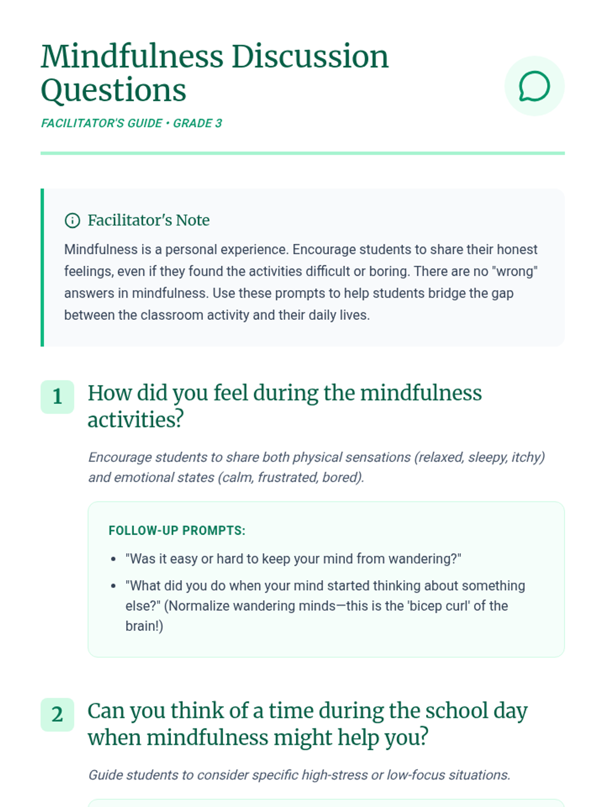 An introductory mindfulness lesson for 3rd graders that teaches breathing techniques and mindful observation to help manage emotions and improve focus.